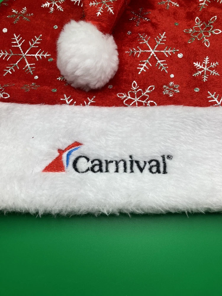 Get into the holiday spirit with this limited edition Carnival Cruise Line Christmas Santa Claus hat, featuring the iconic Carnival logo. Perfect for collectors or anyone who wants to add a festive touch to their cruise ship memorabilia, this hat is a must-have item. Made with high-quality materials, this hat is sure to withstand the test of time and become a treasured part of your collection. Whether you're a fan of Carnival or just looking for a unique Christmas gift, this hat is sure to delight. Order now and add a touch of holiday cheer to your collection! Santa hat was only handed out on Christmas cruises and is brand new without tags. Displays very well and has collectible interest. Would make a great addition to your holiday cruise collection.