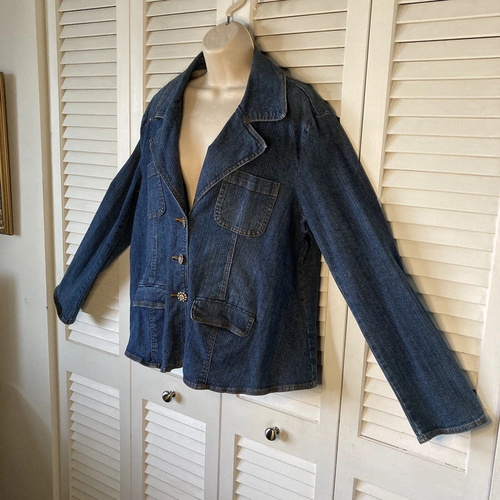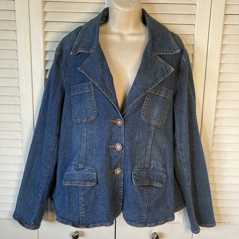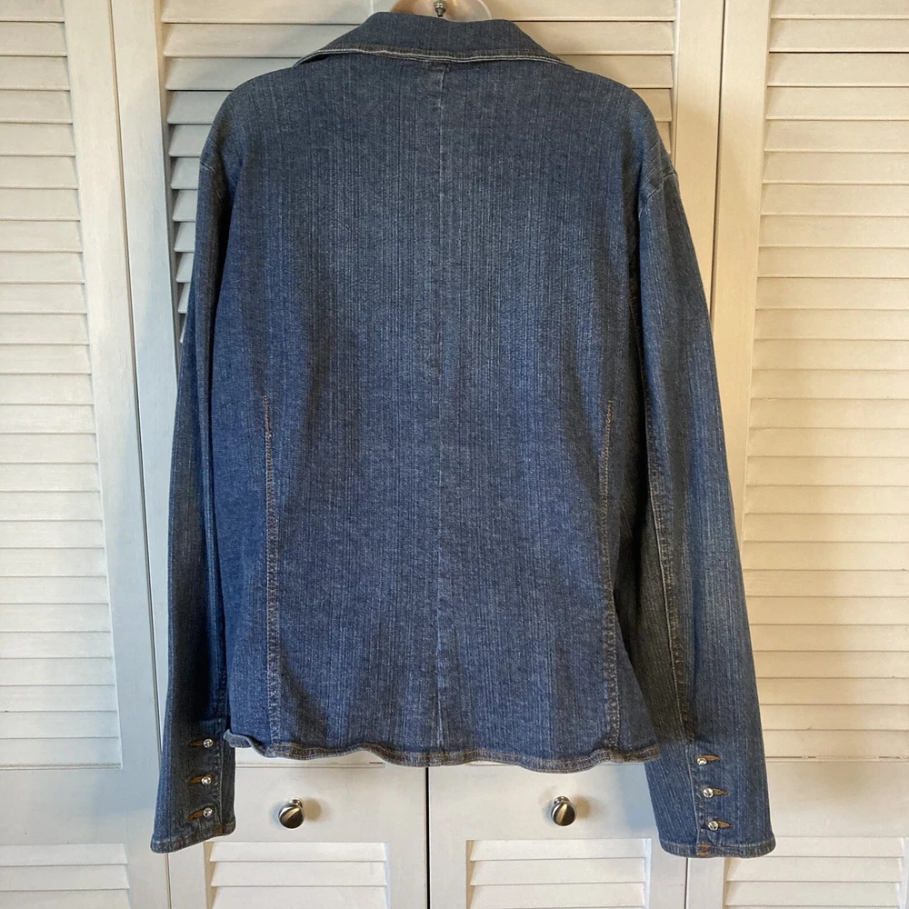 Add some bling to your maternity wardrobe with this Carole Little Jean Jacket. The rhinestone button-front adds a touch of glamour to this stylish jacket, while the blue cotton blend fabric ensures comfort for you and your growing bump. The jacket features a button closure and is a size L, perfect for any mom-to-be looking to stay fashionable during her pregnancy. The jacket's style is a classic jeans jacket, with accents of rhinestone that make it stand out. Don't miss out on this gorgeous addition to your maternity wardrobe. 97% Cotton, 3% Spandex Machine Wash Bust: 46 inches Length: 25 inches Sleeves: 24 inches