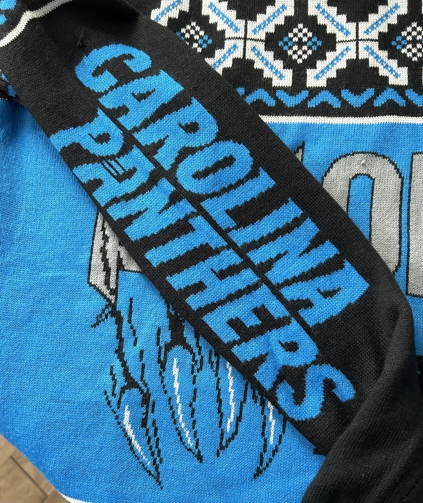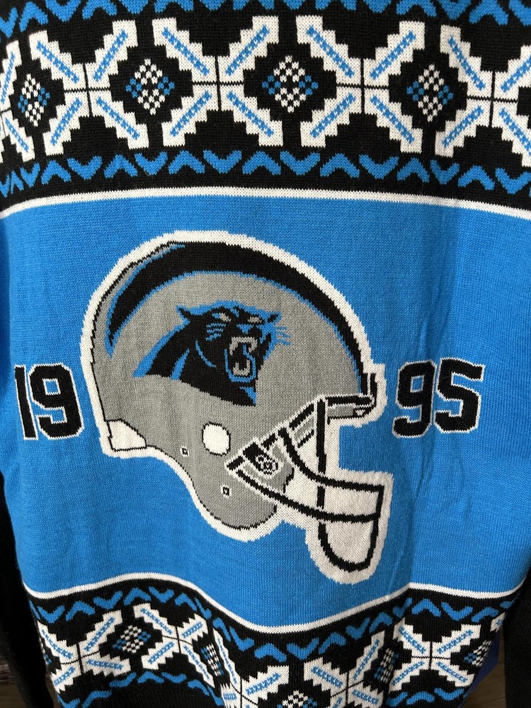 Keep Pounding in this authentic and rare Carolina Panthers "Ugly" Crew Neck Holiday Sweater celebrating the inaugural year the Panthers joined the NFL, and features the "Belong" claws on front and the 1995 Helmut on the back...Its available now in a Size Medium, but probably long-gone by Christmas...Excellent Condition/ No Flaws - may not have been worn. Retail: $195 --- SAME DAY SHIPPING for Orders Received by 3:30 EST --- • Condition: Excellent Condition - Like New • Size: Men's Medium • Color: Carolina Blue, Black, and Silver • Fabric: 100% Acrylic • Measurements: Chest (Pit to Pit): 21.5" Sleeve Length (shoulder seam to end of Sleeve): 28.5" Length (Top of back collar to bottom of hem): 27.5"