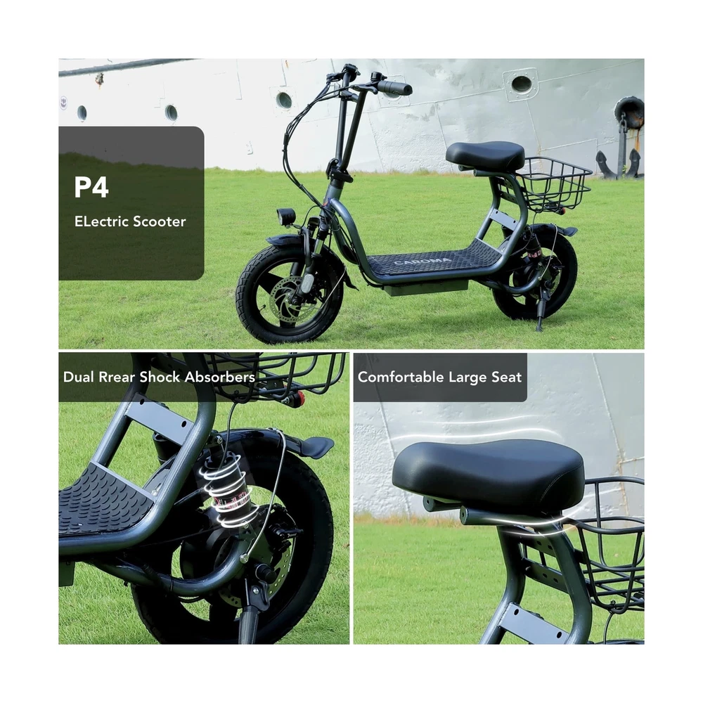 Caroma Peak 1200W Electric Scooter with Seat, 14" Fat Tire Electric Scooter Adults, 500Wh Battery up to 30 Miles&20MPH, Foldable Adult Electric Scooter for Commuting with Basket&Shock Absorbing Description Features: 560W Electric Scooter & 36V Battery350W powerful motor(peak to 560W) electric scooter has 15-mile range and max speed of 20 mph with 10% hill climbing capability. The large capacity 36V lithium battery with regenerative braking has a long range which is ideal for anyone who wants to commute short distance for school or office. Multiple Suspension and 14" Fat TiresThe e scooter comes with multiple shock absorptions (front, rear suspension, and seat shock) that significantly reduce shock, making your ride more comfortable and stable. The 14" large pneumatic tires have excellent grip, high elasticity, and wear resistance. Meanwhile, this adult scooter comes with a large, soft seat and an extra-wide non-slip deck to make long rides a breeze. Foldable & Safe Electric Scooter AdultsThis motorized scooter has folding design for increased portability and safety features like responsive and effective dual drum braking systems, bell, headlight and red tail-light, making it a portable electric scooter for commuting. It also has durable one-piece wheel hubs and a high-strength steel frame with a good weight capacity. The compact folded size makes it easy to store in car trunks and other tight spaces. (NOTE: Max load 300lbs) Smart Electric Scooter with Seat The Caroma P4 is an electric commuter scooter designed for adults. It has a basket above the rear wheels and can carry up to 30 pounds, making it ideal for quick errands and shopping. This electric scooter also features an LCD display that clearly shows the real-time power level of the ride. Meanwhile, the handle-mounted throttle allows you to control your riding speed easily and precisely. Easy Assembly & After Sales GuaranteeThe adult scooter comes mostly assembled with instructions and installation tools. We provide warranty for the e scooter. Caroma electric scooter has passed UL2272 certification, ensuring it meets stringent safety standards. Product Details: Brand: Caroma Color: Grey-Shock Absorption Age Range (Description): Adult Special Feature: Digital Display, Seat, Dual Braking System, Basket, Foldable Weight Limit: 300 Pounds Number of Wheels: 2 Model Name: P4 Electric Scooter Wheel Material: Rubber Frame Material: Aluminum Item Weight: 29.5 Kilograms Brand: Caroma Color: Grey-Shock Absorption Age Range (Description): Adult Special Feature: Digital Display, Seat, Dual Braking System, Basket, Foldable Weight Limit: 300 Pounds Number of Wheels: 2 Model Name: P4 Electric Scooter Wheel Material: Rubber Frame Material: Aluminum Item Weight: 29.5 Kilograms Handlebar Type: Fixed Handle Height: 51.2 Inches Wheel Size: 14 Inches Wheel Type: Pneumatic Suspension Type: Dual Suspension Grip Type: Ergonomic Brake Style: Front Braking, Rear Braking Warranty Type: Extended Charging Time: 4 Hours Recommended Uses For Product: Commuting Maximum Distance Range: 15 Miles Manufacturer: Guangzhou Plenty Bicycle Co.,Ltd Item Package Dimensions L x W x H: 50.79 x 26.38 x 9.06 inches Package Weight: 65 Pounds Brand Name: Caroma Warranty Description: 12 Months Warranty Material: Iron Suggested Users: unisex-adult Number of Items: 1 Part Number: P1 Electric Scooter Style: 560W 15Miles Classic Grey with seat Included Components: 1 x User Manual, 1 x Power Adaper, 1 x Electric Scooter, 1 x Toolkit Size: 129*23*67CM Date First Available: December 27, 2023 Delivery We Do Not Ship Outside of the Continental US. Return Policy All items qualify for returns within 30 days of receipt. Buyer is responsible for return shipping on any item that is not damaged. Feedback We take our reputation seriously, we buy and sell online, so we understand the value of trust. If you are unsatisfied with your order, please contact us and we will work with you to resolve it to your satisfaction.