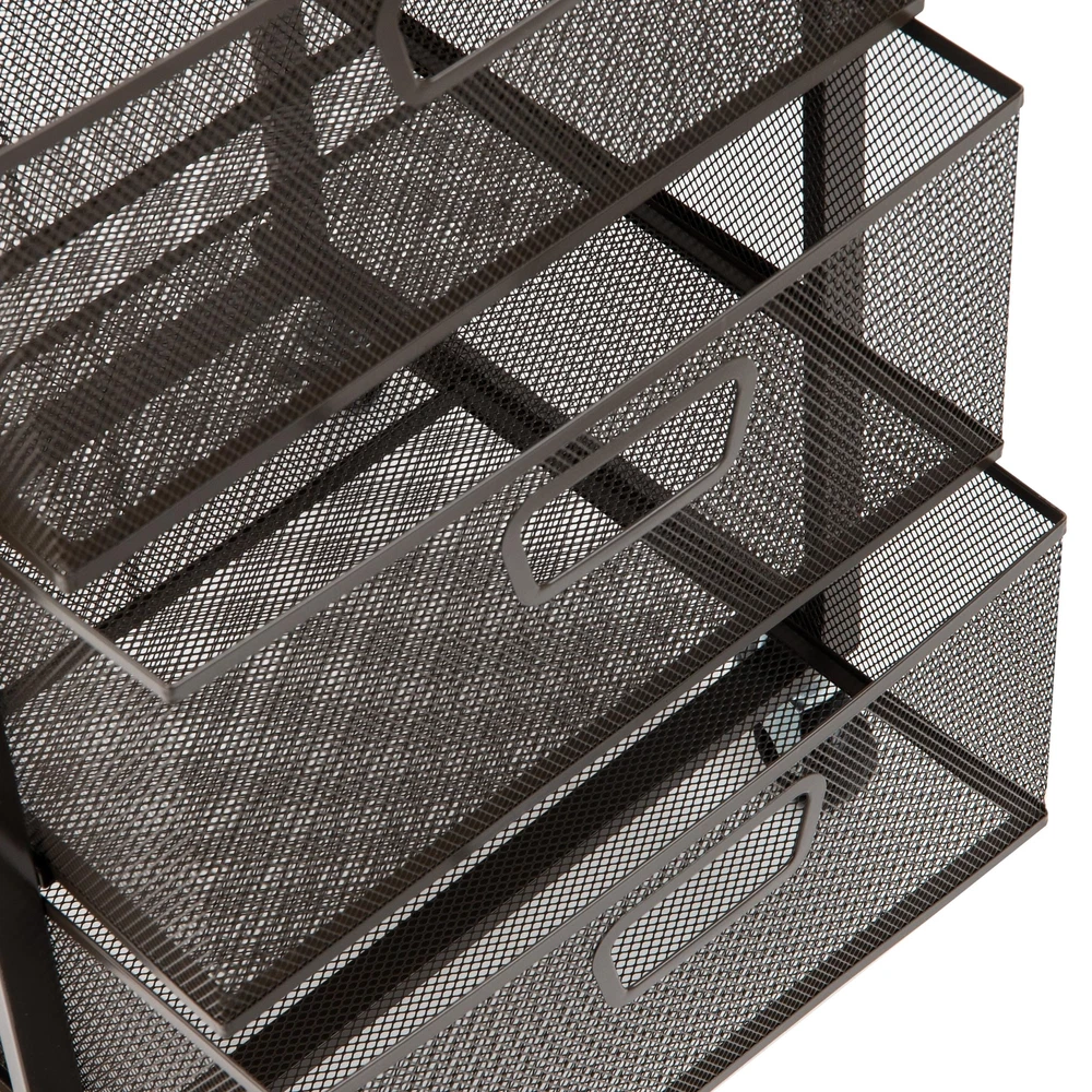 Effortlessly Organize Your Space with this Rolling File Cabinet This sleek and modern rolling cabinet is a versatile storage solution that offers convenience and style to any home or office. Its minimalist design allows it to blend in seamlessly with any decor, while its compact size and rolling wheels make it easy to move around and store in tight spaces. With three spacious drawers, this file cabinet offers ample storage space for your office supplies, documents, craft materials, or personal items. The drawers are made from sturdy mesh material, making it easy to see what's inside. The smooth gliding drawers make it effortless to access your items quickly and easily. An attractive wooden top adds style and provides a stable functioning surface for sorting files or additional storage. Measuring 14.25 inches long by 10.75 inches wide by 25 inches tall (36.19 x 27.31 x 63.5 cm) and weighing just 10.78 lbs (4.89 kgs), this file cabinet can fit under a desk, in a closet, or in a corner. It's the perfect gift for anyone who values simplicity and organization, whether they're a college student, a work-from-home employee, or anyone looking to keep their space tidy and clutter-free. Minimalist design: The mix of mesh and solid metal framing makes this rolling file cabinet both attractive and sophisticated in your home or office Saves space: The slim design includes three removable drawers to organize your small desk items, books, and pads Easy to move: With four caster wheels, you can move this organizer to your desk, closet, or another room with ease Durable and easy to clean: This rolling file cabinet is made with durable materials and is easily cleaned with mild soap and a soft cloth Dimensions: This rolling file cabinet measures 15.75 long x 13 wide x 24.25 inches tall (40.01 x 33.02 x 61.60 centimeters) and weighs 11.2 lbs (5.08 kgs), this portable storage cart is the perfect size for maximizing space