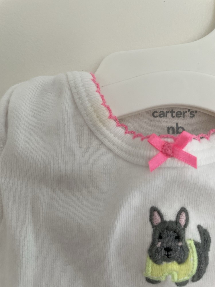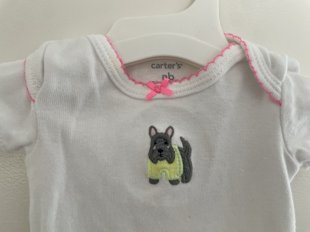 Carter's Baby Girls Cute Dog Applique 100% Cotton Short Sleeve Bodysuit White NB. Condition is pre-owned. Smoke free, pet free home. Shipped via USPS Ground Advantage. In good condition. There are light stains on the front. Free of rips.