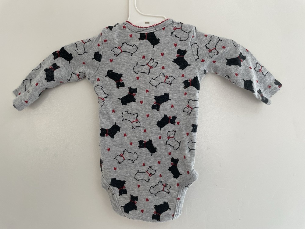 Carter's Baby Girls Cute Terrier Dog 100% Cotton Long Sleeve Bodysuit Gray 3M. Condition is pre-owned. Smoke free, pet free home. Shipped via USPS Ground Advantage. In very good condition. Free of rips or stains.