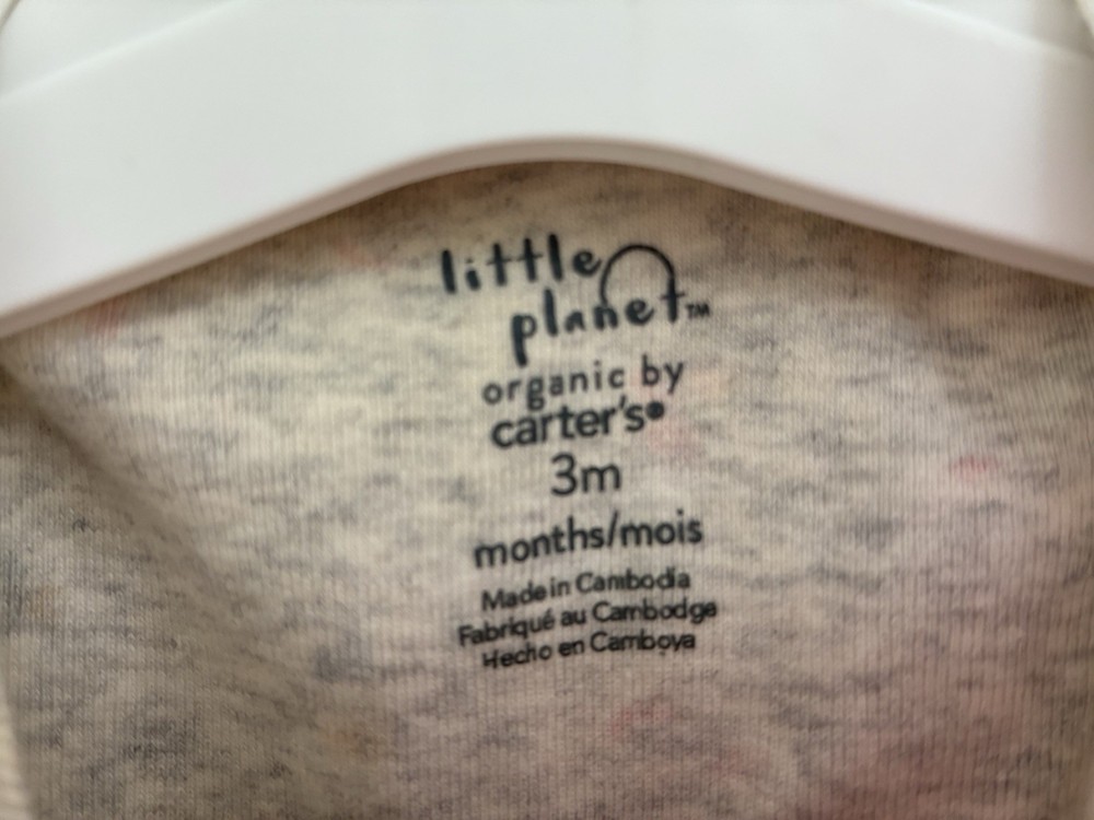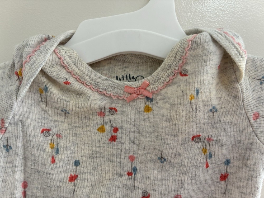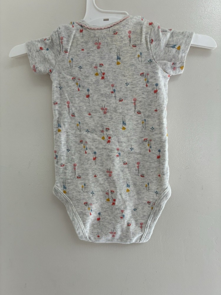 Carter's Baby Girls Floral Bow 100% Cotton Short Sleeve Bodysuit Heather Gray 3M. Condition is pre-owned. Smoke free, pet free home. Shipped via USPS Ground Advantage. In fair condition. There are big, light stains at the top of the bodysuit.