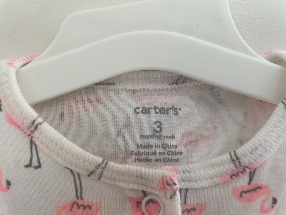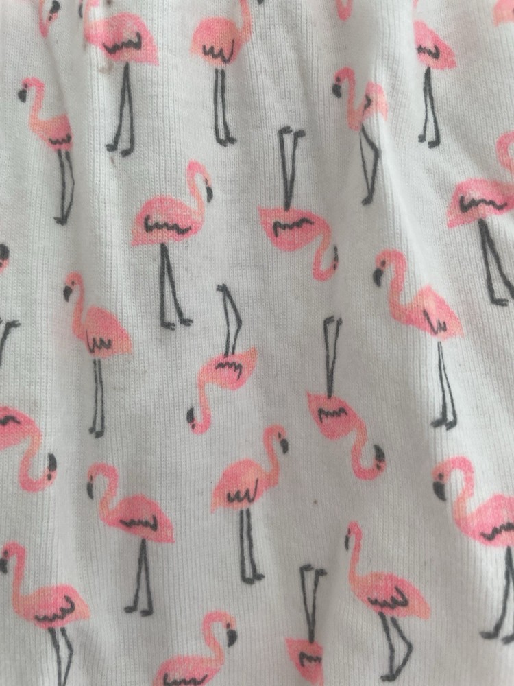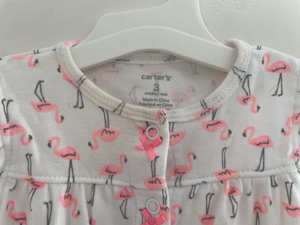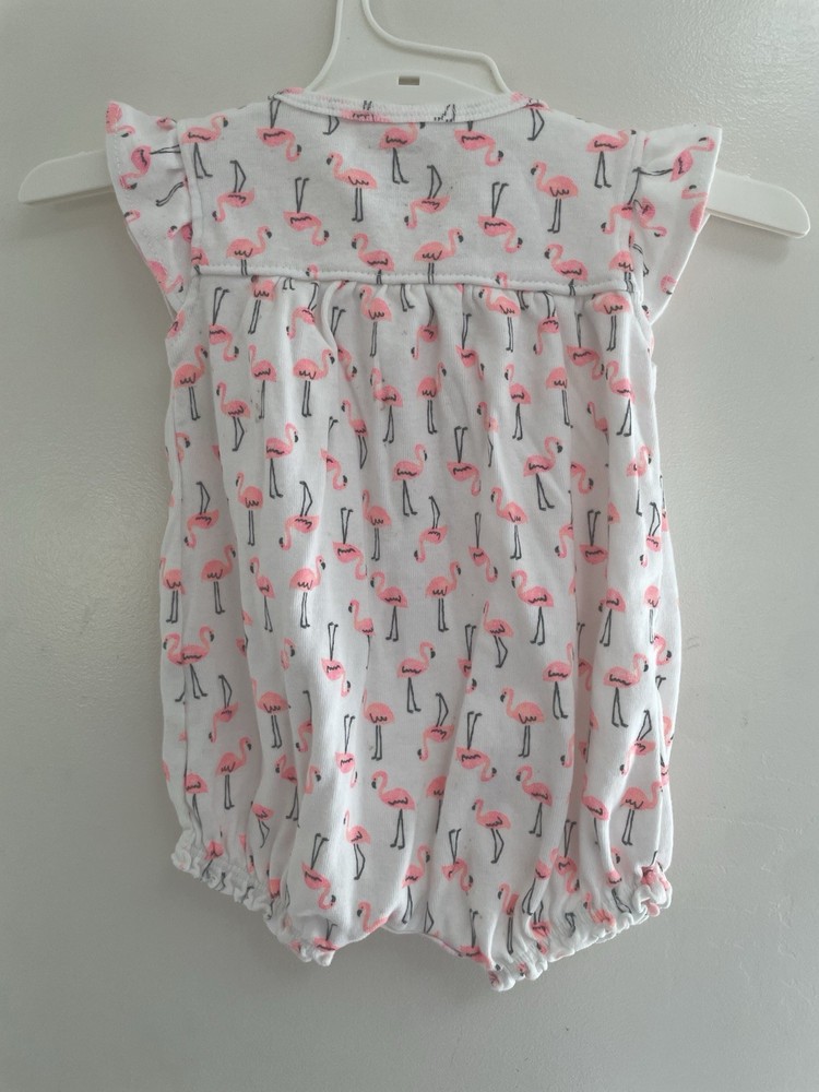 Carter's Baby Girls Pink Flamingos Flutter Cotton Short Sleeve Romper White 3M. Condition is pre-owned. Smoke free, pet free home. Shipped via USPS Ground Advantage. In good condition. There are light stains on the front. Free of rips.