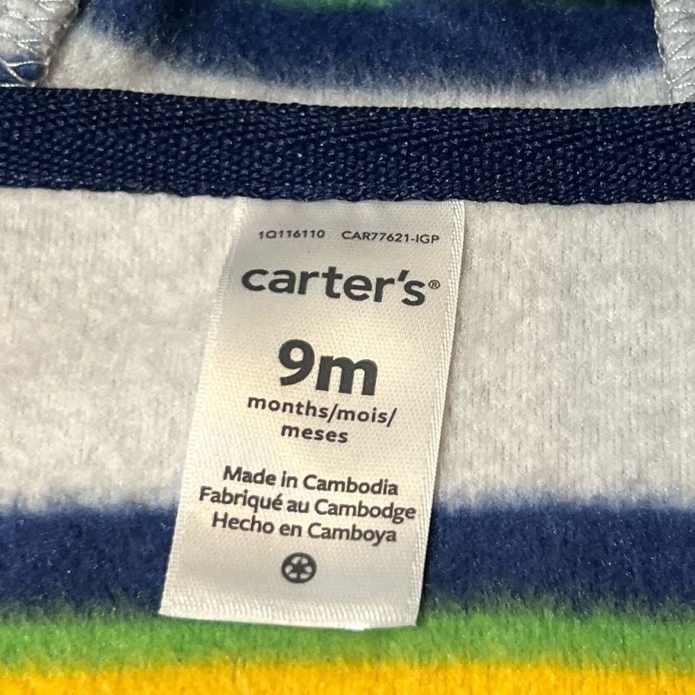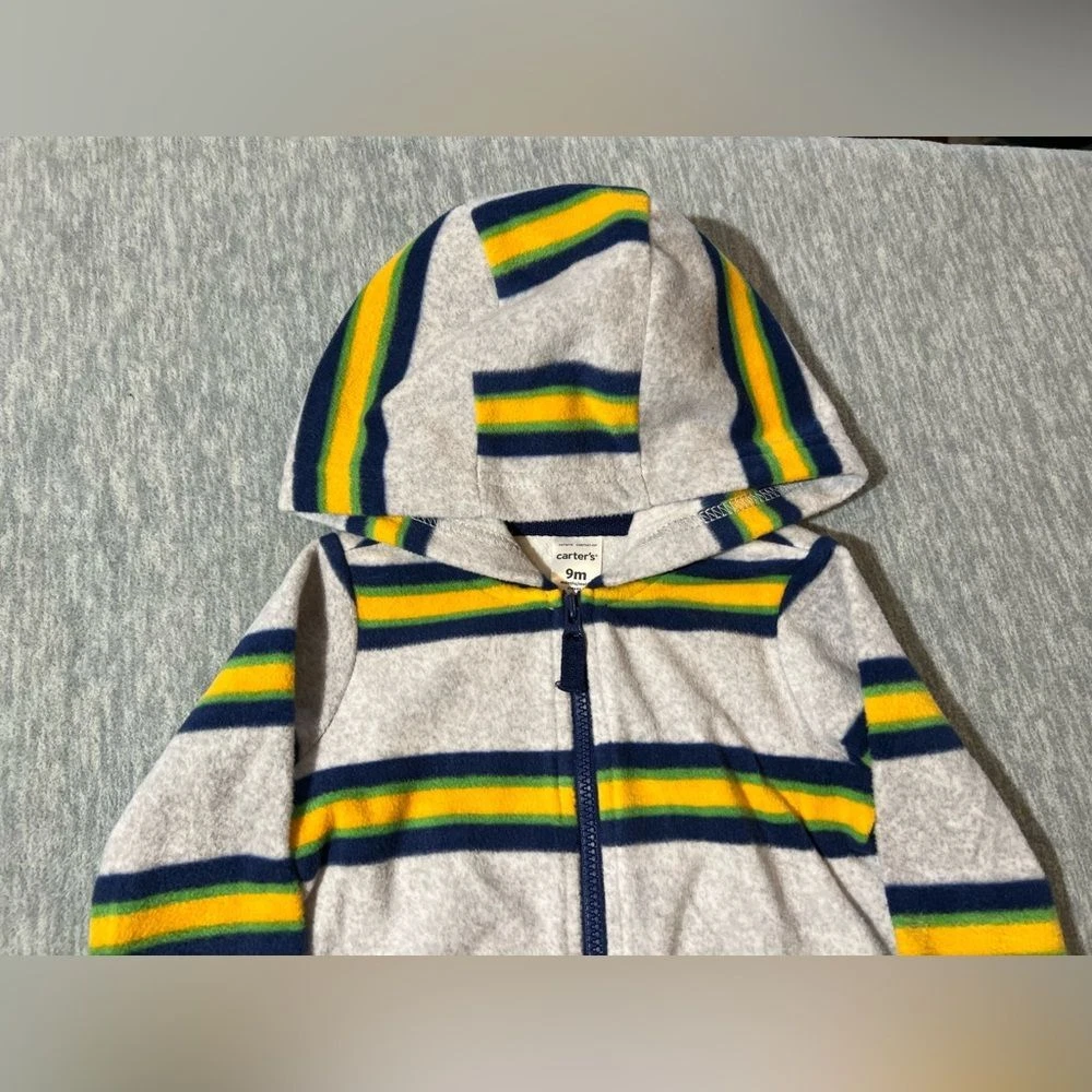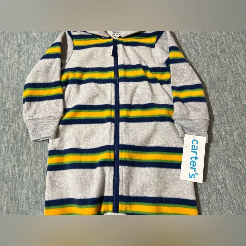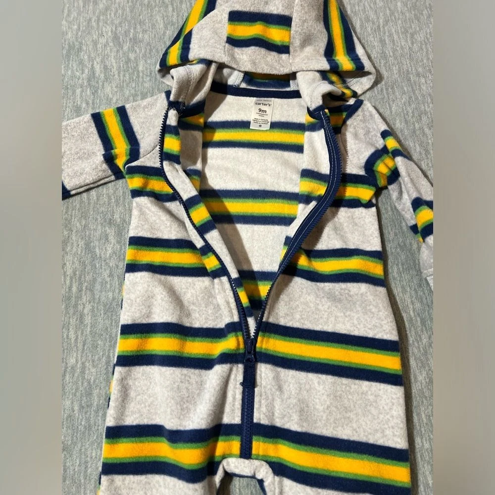 Carter's boys/baby/kids long sleeve fleece zip up hooded romperSoft to the touch, lightweight, zippered with hood-Condition- new with tag/Size-boys/kids- 9 months-Color - Green, navy, yellow, gray Measurements approximately: PTP-inches- 10.5. Overall length- inches- 23 Inseam-inches- 8 Material Content- blend of: 100% polyester My items are primarily thrifted and I do my very best to note any imperfections/callouts. My items are stored in a pet/smoke free home Thanks for stopping in and looking! Lisa