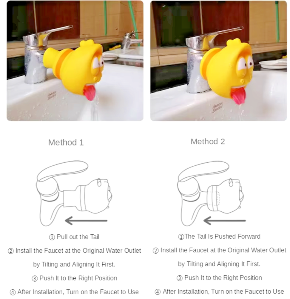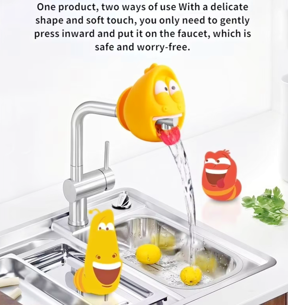The product is a Cartoon Funny Bugs Faucet Extender designed for children. It features a splash-proof tongue to help prevent water splashing while kids wash their hands in the kitchen. This cute and playful design makes it a great gift for children, encouraging independence and making handwashing more fun. The faucet extender is specifically designed for use in the kitchen, making it easier for children to reach and use the sink without assistance. Features: 1. Quick installation, detachable silicone base cover, securely prevents falling off 2. Easily wash hands, resulting in lower and closer water output without the need for foot pads 3. Cartoon appearance, love washing hands at a glance