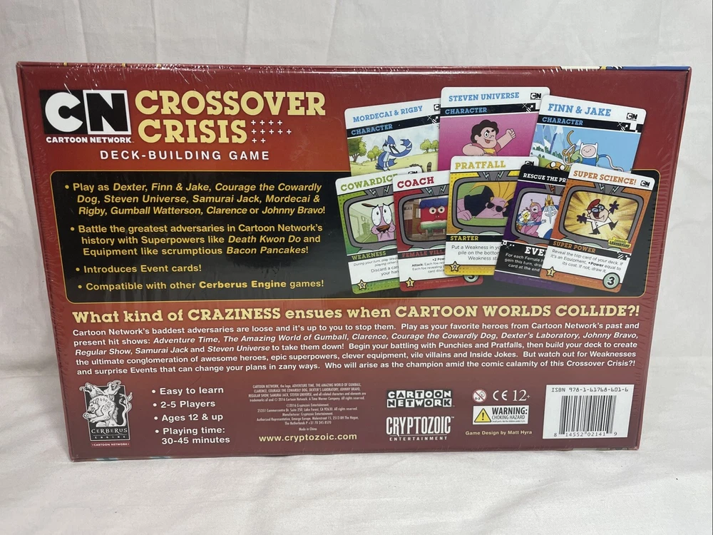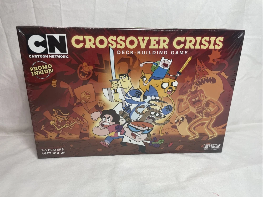 Experience the excitement of the Cartoon Network with the Crossover Crisis Deck Building Board Game! This complete game, created by Cryptozoic Entertainment in 2016, features your favorite TV cartoons and is perfect for 2 or more players aged 12 and up. Use strategy and teamwork to defeat the villains and save the day in this action-packed game. With its engaging gameplay and captivating theme, Crossover Crisis is a must-have for any board game enthusiast. This brand new, sealed game also includes a special promo card, making it an even more exciting addition to your collection. Don't miss out on the chance to immerse yourself in the world of your favorite Cartoon Network characters.