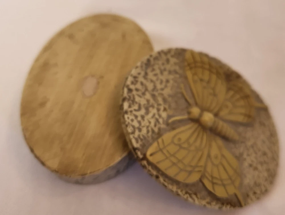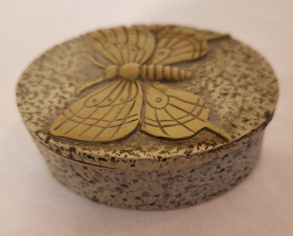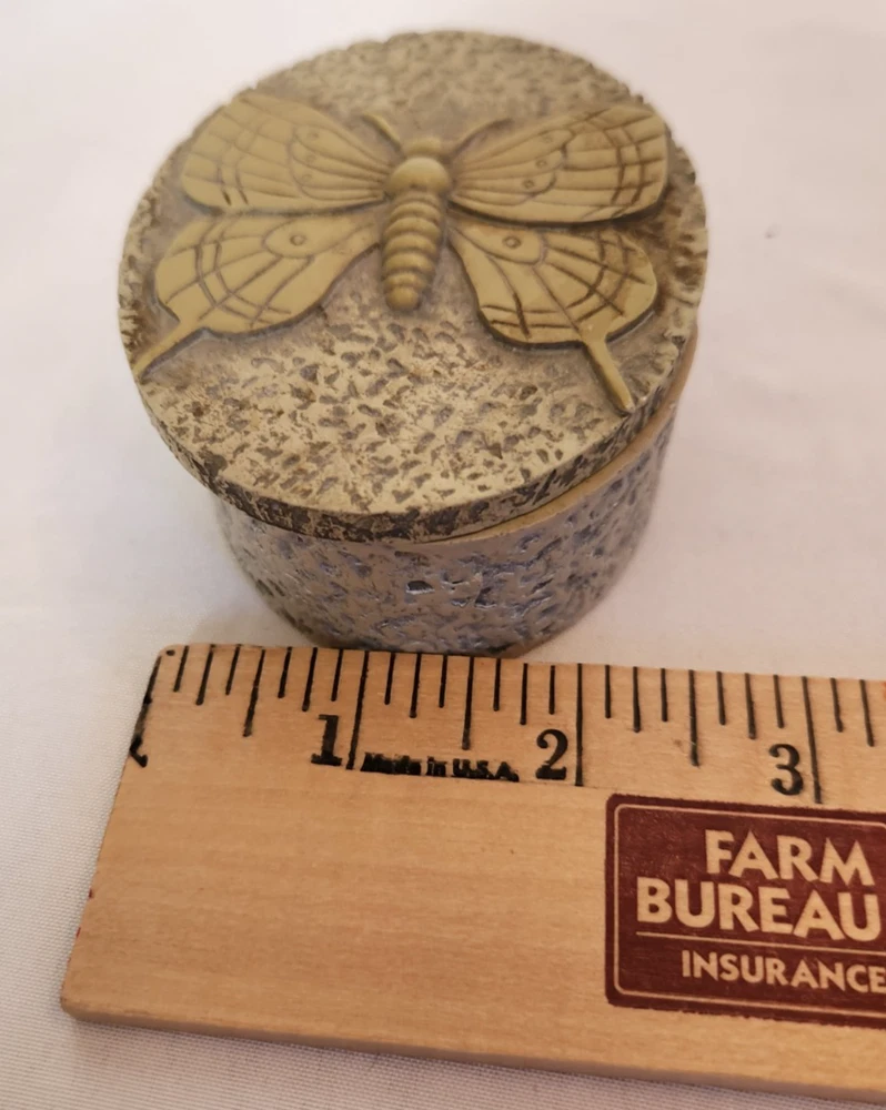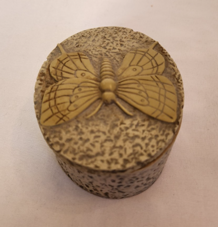 The Carved Soapstone Oval Trinket Box with Butterfly Design Lid is a small and elegant decorative collectible perfect for all occasions. Made of soapstone and featuring a beautiful butterfly design on the lid, this trinket box is a unique and charming addition to any collection of keepsake boxes. The beige color adds a touch of nature and elegance to the piece, making it a lovely and practical item for storing small treasures or keepsakes.