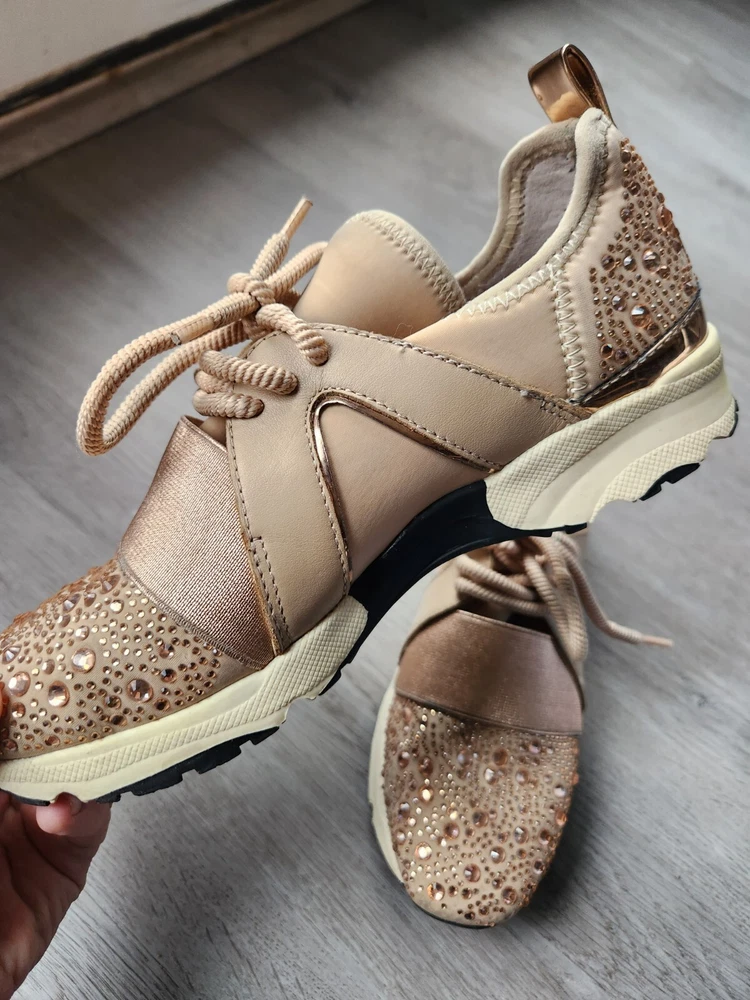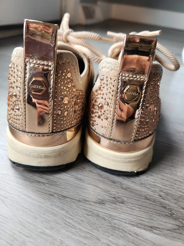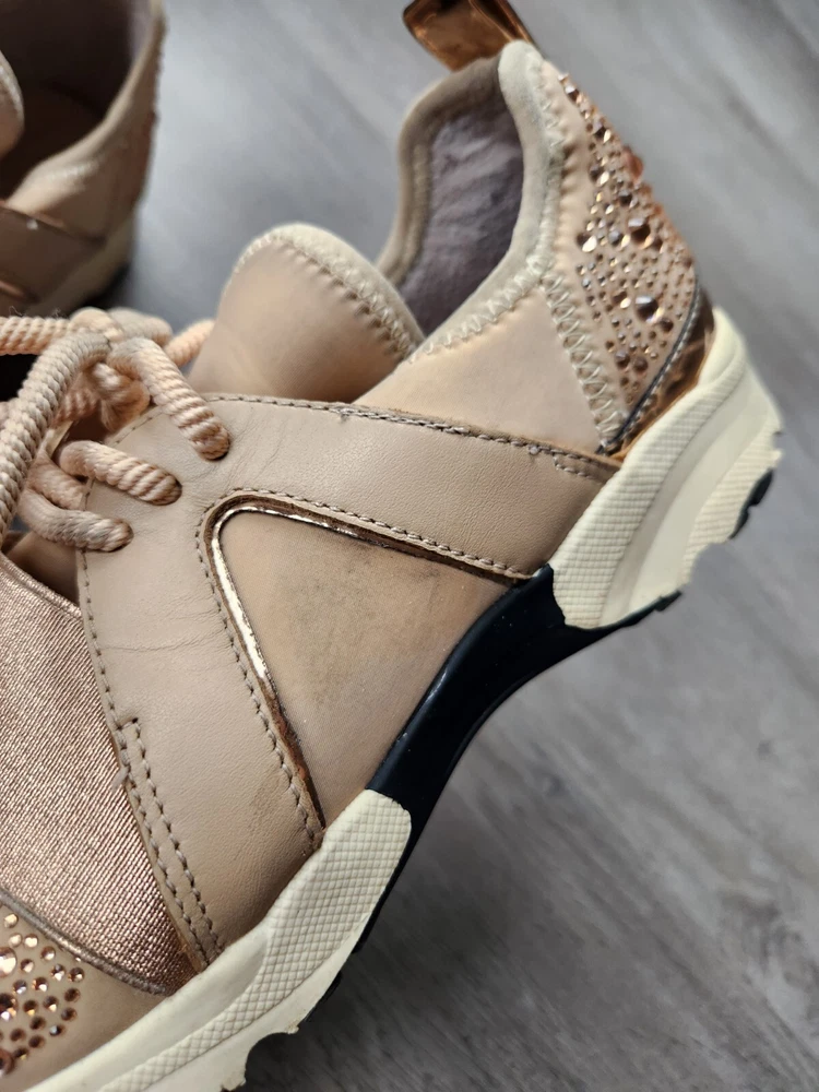 Step up your shoe game with these gorgeous Carvela rose gold sneakers! These stunners are perfect for a day out on the town or hitting the club with your friends. The metal cleats give them an athletic edge, while the studded accents add a touch of punk rock flair. Some wear and tare see pictures