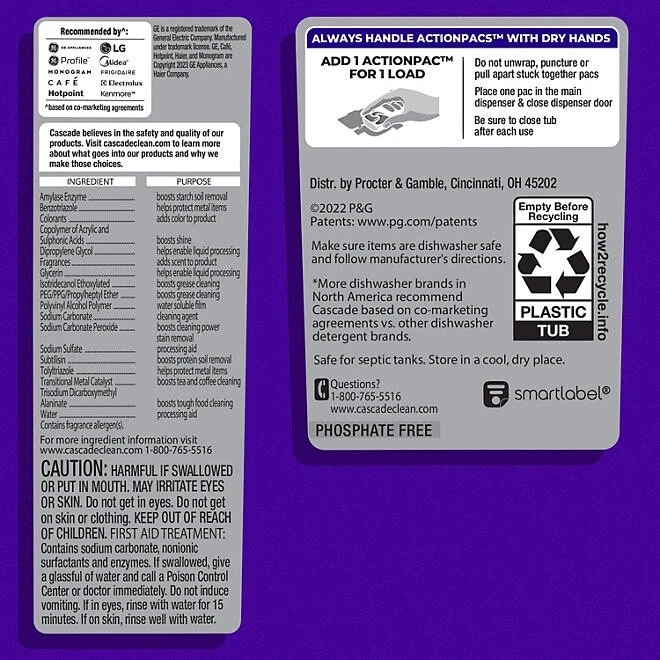 Size / Count: 81 count dishwasher detergent pacs Form: Single use detergent pacs Certifications and Claims: Save up to 20 gallons of water when using Energy Star certified dishwashers. Scent: Fresh Scent Septic Safe: Yes Allergens / Warnings: Contains fragrance allergens. Caution: Harmful if swallowed or put in mouth. May irritate eyes or skin. Do not get on skin or clothing. Keep out of reach of children. Refer to packaging for more information on warnings and First Aid Procedures Contains Bleach: No Different Packaging Advisory: Product may ship in different packaging than depicted in images Use Instructions: Always handle ActionPacs with dry hands. Add 1 ActionPac for 1 Load. Do not unwrap, puncture, or pull apart stuck together pacs. Place one Pac in the main dispenser and close dispenser door. Be sure to close tub after each use. Make sure items are dishwasher safe and follow manufacturer's instructions.