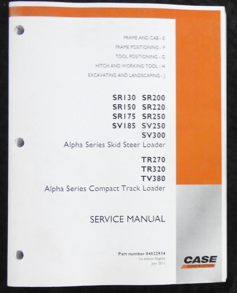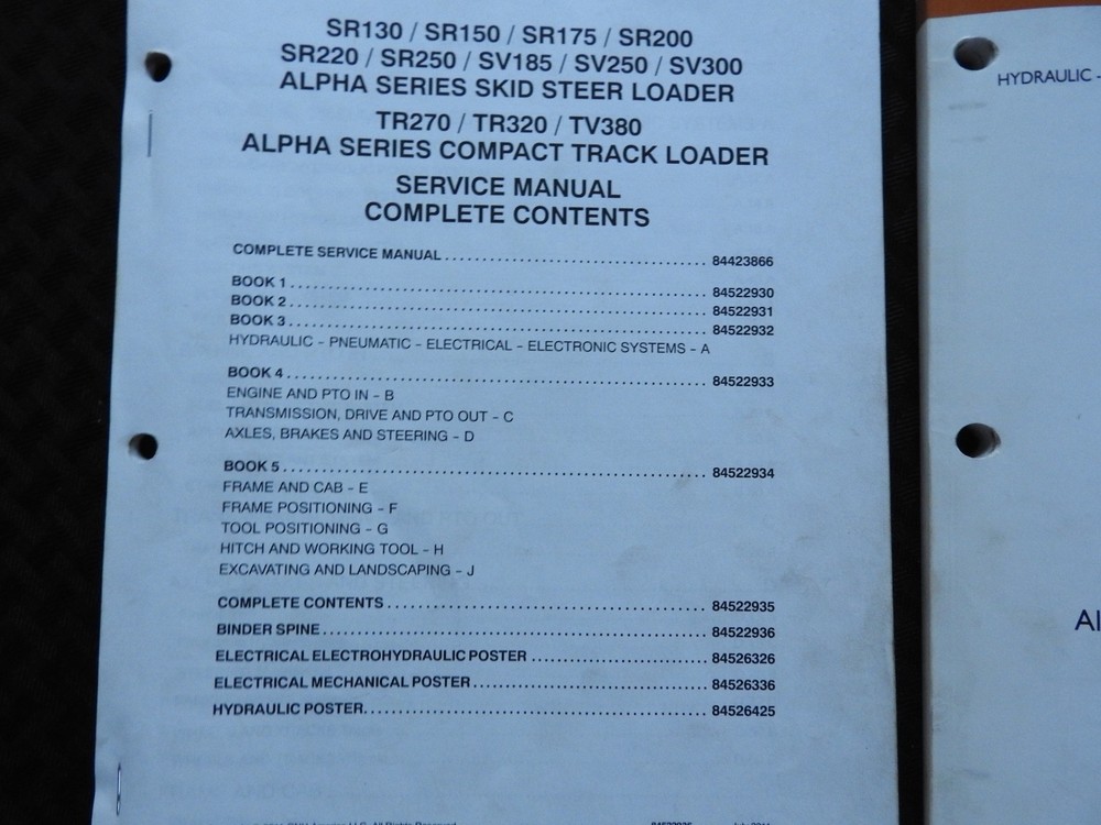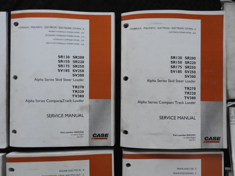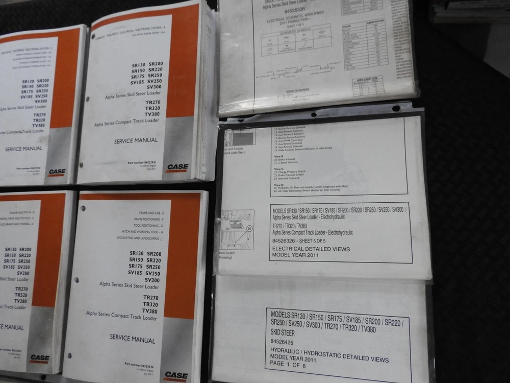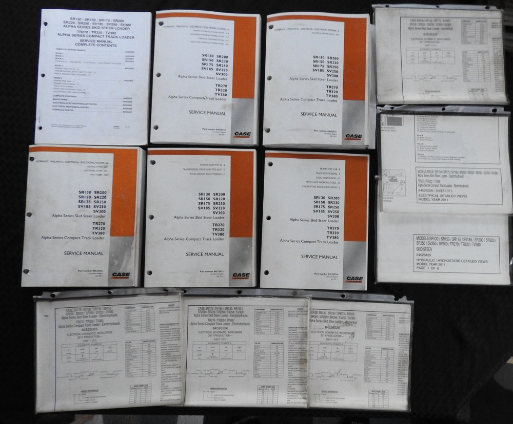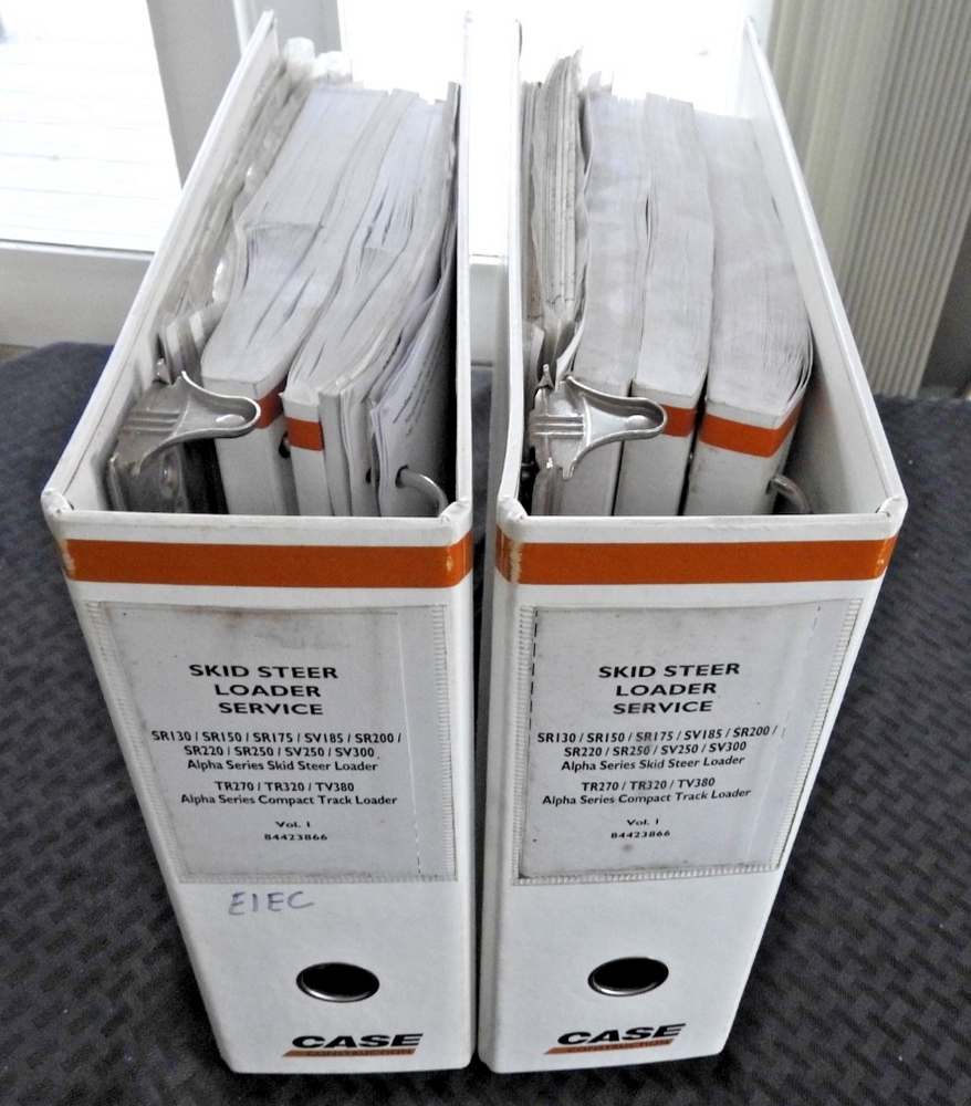 Here we have up for sale an ORIGINAL Case Construction SR130, SR160, SR175, SR220, SR250, SV185, SV250, SV300, TR270, TR320 & TV380 Skid Steer Loader Tractor Repair Manual set (2011 printing) This massive 2-binder set contains super illustrations as well as having in-depth service, maintenance, specifications, and repair information for these tough Case skid loaders. There are many fold-out schematics as well. Set comes in their original binders. Manual set is complete and in nice shape with a few finger smudgies. Manual set is in VERY GOOD+ overall condition. FREE S & H. Thanks for viewing......Triple K