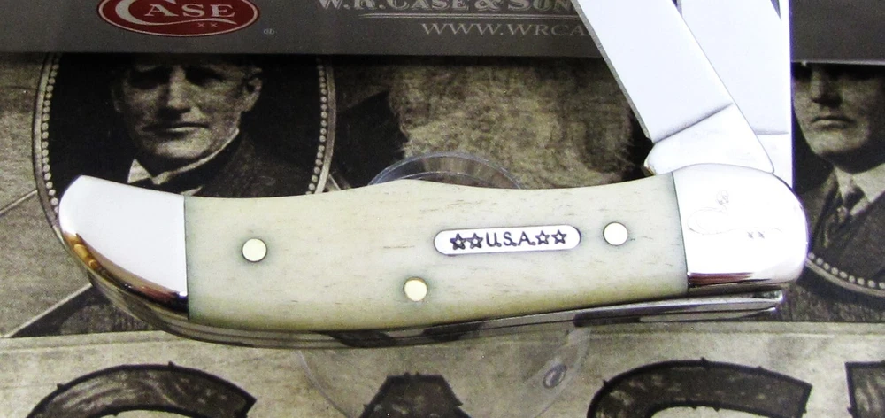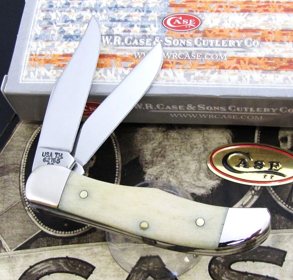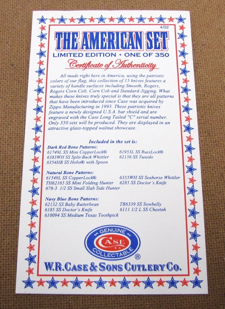 Hi I'm James Parker and I am offering some fine knives for auction from a Case Knife Collection acquisition. The winning bidder pays $5.95 for USPS Ground Advantage Shipping with Delivery Confirmation included in the Shipping price. Condition is important, and if you have ever bought from us, you know we deliver what we say. Please be sure to see the shiny pins and bolsters and when we say mint.....we mean it. We don't mean "Never Used But Beat Up And Shopworn". This knife for auction is a 2002 issue Case American Set Pocket Hunter, 2 3/4" closed, featuring Case's Smooth Natural Bone (cattle bone) handles and the nickel silver U.S.A. Bar shield. This Case American Set Pocket Hunter features the official Case Long Tail C serialization and #061 on the front side pocket end bolster. Please see the 3rd photo for a good close up shadowed view of the serialization. The master Clip blade is stamped on the front tang with Case XX with 5 X's and 3 Dots, dating this as a 2002 issue Case knife, while the rear tang of this blade is pattern stamped with USA T.H. 62165 SS. Both blade have good "walk and talk" snap. The "T.H." in the pattern stamp recognizes the late Tommy Hart. Tommy Hart passed away in 1998 and he was instrumental in designing the famous Case Texas Lockhorn pattern, along with Case's Copperlock, Russlock, and this Pocket Hunter. Please be sure to see all 5 of the Supersize Photos as this is the EXACT knife the winning bidder will receive. We will provide to the winning bidder a brand new condition unlabeled Case factory box for safe storage, as this knife didn't originally come in any type of individual box. This spectacular 2002 issue Case American Set Pocket Hunter - Serial #061 , issued in a quantity of 350 pieces, is in mint condition with a copy of the Case American Set Certificate Of Authenticity and is being offered at No Reserve. Yes A True No Reserve Auction Where The Bidding Starts At .99 Cents. Thanks for your bids, we appreciate it.