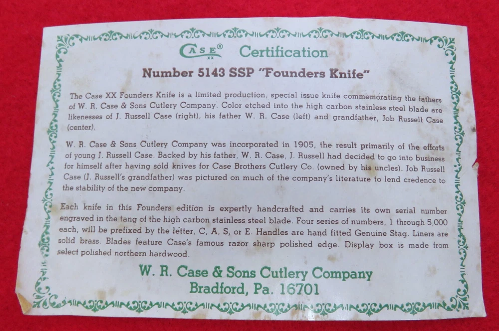 Hi I'm James Parker and I am offering some Case Stag Knives for auction from an all Case Stag acquisition out of Pennsylvania. The winning bidder pays $5.95 for USPS Ground Advantage Mail Shipping with Delivery Confirmation included in the Shipping price. This knife for auction is a magnificent 1979 issue Case Stag Founder's Knife , 5" closed, with an incredible pair of beautiful flame torched Genuine Stag (deer stag) handles and nickel silver bolsters. The Clip blade has a GREAT 3 color factory deep etch reading "Case XX W.R. - Job - J.R." and detailed likenesses of W.R., Job, and J.R. "Russ" Case. This Case Stag Founders Knife is serial numbered on the front tang of the Clip blade with "S 01600". The front tang of the Clip blade is stamped with Case XX Stainless USA with 1 Dot, with the rear tang being pattern stamped with 5143 SSP. The Clip blade opens up nice and has great "walk and talk" snap. Please be sure to see all of the Supersize Photos as this is the EXACT knife the winning bidder will receive. We will ship the knife in a new unlabeled Case factory box as shown in the last photo. Original Case Certification paper is included with this knife. This awesome 1979 issue Case Stag Founder's Knife is in mint condition with the original Case COA paperwork and is being offered at No Reserve. Thanks for your bids, we appreciate it.
