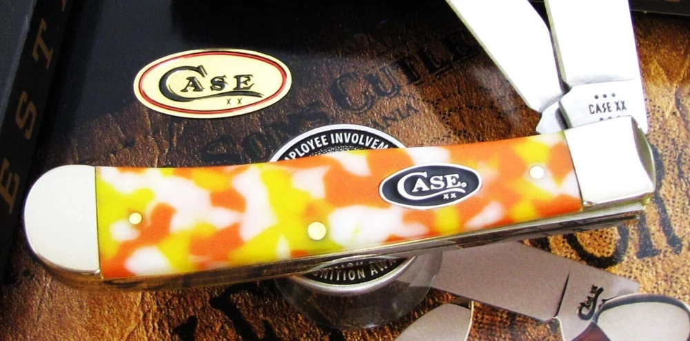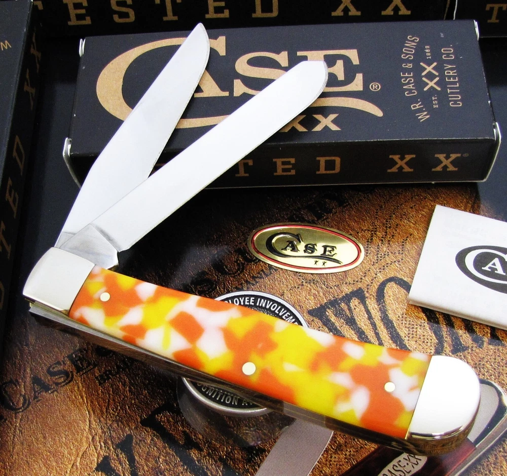 Hi I'm James Parker and I am offering this knife for auction from a group of W.R. Case & Sons Holiday Themed knives just purchased . The w inning bidder pays $5.95 for USPS Ground Advantage Shipping with Delivery Confirmation included in the Shipping price. We just bought a group of W.R. Case & Sons Holiday Themed knives from a longtime Case collector. There were many Case Holiday Themed Knives and Case Christmas Knives. Please be watching for some awesome W.R. Case & Sons Holiday themed patterns! Condition is important, and if you have ever bought from us, you know we deliver what we say. Please be sure to see the shiny pins and bolsters and when we say mint.....we mean it. We don't mean "Never Used But Beat Up And Shopworn". This knife for auction is a Case Candy Corn Trapper , 4 1/8" closed, featuring the great Case Candy Corn Kirinite handles and the Case XX black shield. Please be sure to see the Supersize Photos as this is the EXACT knife the winning bidder will receive. The Case item number is #53750. This spectacular Case Candy Corn Trapper is in mint condition in the original issue Case factory box with the Case factory paperwork brochure and is being offered at No Reserve . Yes A True No Reserve Auction Where The Bidding Starts At .99 Cents. Thanks for your bids, we appreciate it.