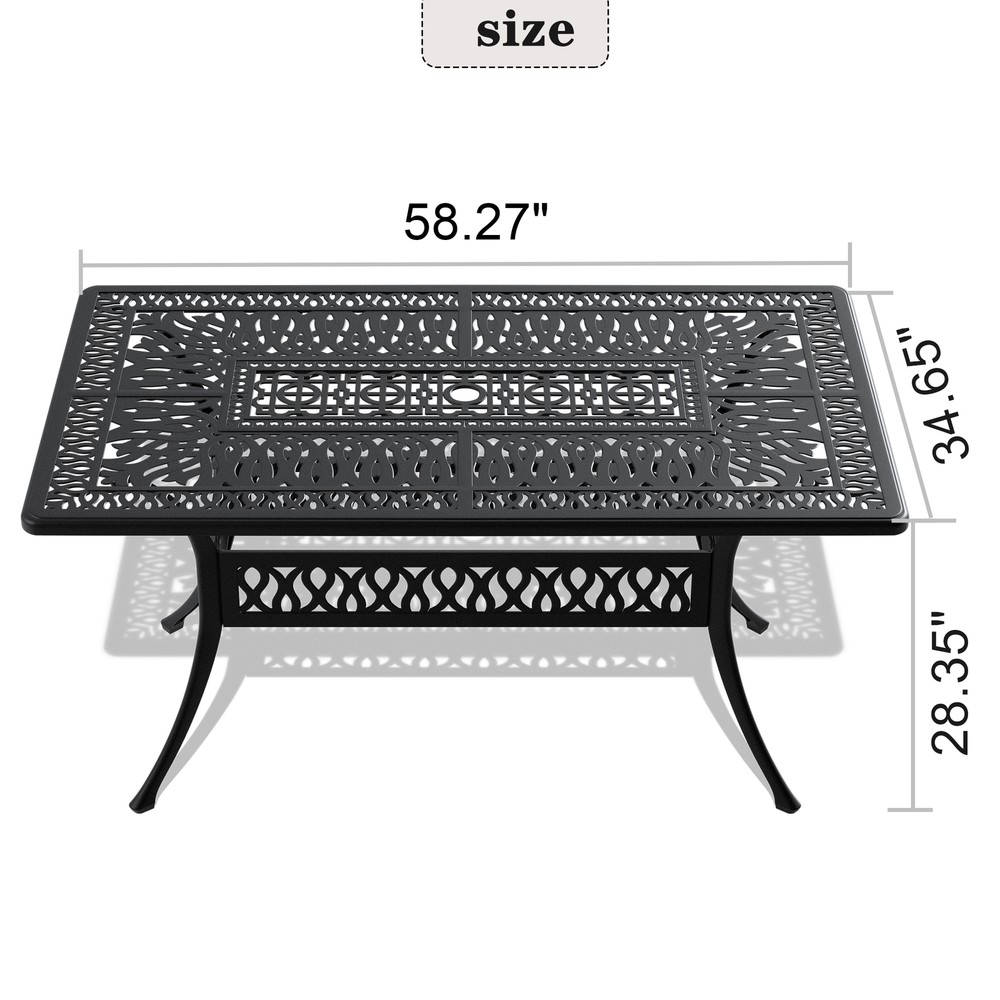 Product Weight & Dimensions Specifications: roduct Type Table Color Black Outer Frame Material Aluminum Weight Capacity 160lbs Seating Capacity 6 Table Top Shape Rectangular Umbrella Hole Yes Product Dimensions& Weight 28.35'' H X 34.65'' W X 58.27'' L , 47.66lbs Package Dimensions& Weight 37.4'' H X 3.74'' W X 61.02'' D , 54.92lbs Package Number 1 Assembly Required Yes Additional Tools Required All tools included Traditional casting process is used to produce tables with exquisite carved lines or various patterns, presenting an elegant and beautiful appearance. This design eliminates monotony and adds a touch of charm to your outdoor space, creating a delightful atmosphere for dining and relaxation. 100% aluminum construction... NANHG8osa Your best online business partner L58.27*W34.65-inch Cast Aluminum Patio Dining Table With Black Frame and Umbrella Hole Product Weight & Dimensions Specifications: roduct Type Table Color Black Outer Frame Material Aluminum Weight Capacity 160lbs Seating Capacity 6 Table Top Shape Rectangular Umbrella Hole Yes Product Dimensions& Weight 28.35'' H X 34.65'' W X 58.27'' L , 47.66lbs Package Dimensions& Weight 37.4'' H X 3.74'' W X 61.02'' D , 54.92lbs Package Number 1 Assembly Required Yes Additional Tools Required All tools included Traditional casting process is used to produce tables with exquisite carved lines or various patterns, presenting an elegant and beautiful appearance. This design eliminates monotony and adds a touch of charm to your outdoor space, creating a delightful atmosphere for dining and relaxation. 100% aluminum construction, covered with a high-temperature-resistant polyester powder coating that provides excellent weather resistance, corrosion resistance, and UV resistance. Features an umbrella hole to provide you with a 1.88 in. Dia. PA66 Nylon anti-slip foot pad, wear-resistant, anti-slip, noise-reducing. Easy to assemble with all necessary hardware and clear instructions. Item Specifics Brand Unbranded Type Patio & Garden Furniture Sets Material Aluminium Payment If you do not have a PayPal account, to get started and buy your first item with us is very easy. Simply click on the 'Buy It Now' button and follow the eBay checkout steps. Select PayPal as the payment method you then will be given the chance to enter your card details in to PayPal's secure checkout in order to pay for your order. Shipping We will deliver the goods within 1-2 days after receiving the order We use a variety of transportation methods to ensure the fastest delivery of products Returns If an unit is received defective, of course we take it back or replace it. If the unit is received as expected, we must charge for our expenses if you want to send it back. We have to charge for the work of handling, retesting and restocking. Contact Us Dear buyer, Thank you for visiting my store! Our warehouses are located in many regions around the United States. According to the customer's delivery address. Use USPS/UPS/DHL logistics transportation service. Prioritize the best quality logistics solutions to transport packages. Ensure package delivery time, At the same time. Have any after-sales problems, Feel free to contact us. At your service NANHG8osa Your best online business partner DESCRIPTION PAYMENT SHIPPING RETURN POLICY CONTACT US L58.27*W34.65-inch Cast Aluminum Patio Dining Table With Black Frame and Umbrella Hole Product Weight & Dimensions Specifications: roduct Type Table Color Black Outer Frame Material Aluminum Weight Capacity 160lbs Seating Capacity 6 Table Top Shape Rectangular Umbrella Hole Yes Product Dimensions& Weight 28.35'' H X 34.65'' W X 58.27'' L , 47.66lbs Package Dimensions& Weight 37.4'' H X 3.74'' W X 61.02'' D , 54.92lbs Package Number 1 Assembly Required Yes Additional Tools Required All tools included Traditional casting process is used to produce tables with exquisite carved lines or various patterns, presenting an elegant and beautiful appearance. This design eliminates monotony and adds a touch of charm to your outdoor space, creating a delightful atmosphere for dining and relaxation. 100% aluminum construction, covered with a high-temperature-resistant polyester powder coating that provides excellent weather resistance, corrosion resistance, and UV resistance. Features an umbrella hole to provide you with a 1.88 in. Dia. PA66 Nylon anti-slip foot pad, wear-resistant, anti-slip, noise-reducing. Easy to assemble with all necessary hardware and clear instructions. Item Specifics Brand : Unbranded Type : Patio & Garden Furniture Sets Material : Aluminium Payment If you do not have a PayPal account, to get started and buy your first item with us is very easy. Simply click on the 'Buy It Now' button and follow the eBay checkout steps. Select PayPal as the payment method you then will be given the chance to enter your card details in to PayPal's secure checkout in order to pay for your order. Shipping We will deliver the goods within 1-2 days after receiving the order We use a variety of transportation methods to ensure the fastest delivery of products Returns If an unit is received defective, of course we take it back or replace it. If the unit is received as expected, we must charge for our expenses if you want to send it back. We have to charge for the work of handling, retesting and restocking. Contact Us Dear buyer, Thank you for visiting my store! Our warehouses are located in many regions around the United States. According to the customer's delivery address. Use USPS/UPS/DHL logistics transportation service. Prioritize the best quality logistics solutions to transport packages. Ensure package delivery time, At the same time. Have any after-sales problems, Feel free to contact us. At your service All right reserved. Shop Category Store Home Other Hot Item Outsunny 9.6' x 11.6' Patio Gazebo, Outdoor Canopy Shelter with 2-Tier Roof and USD 249.54 Outsunny 10' x 12' Steel Outdoor Patio Gazebo with Polyester Privacy Curtains, T USD 302.