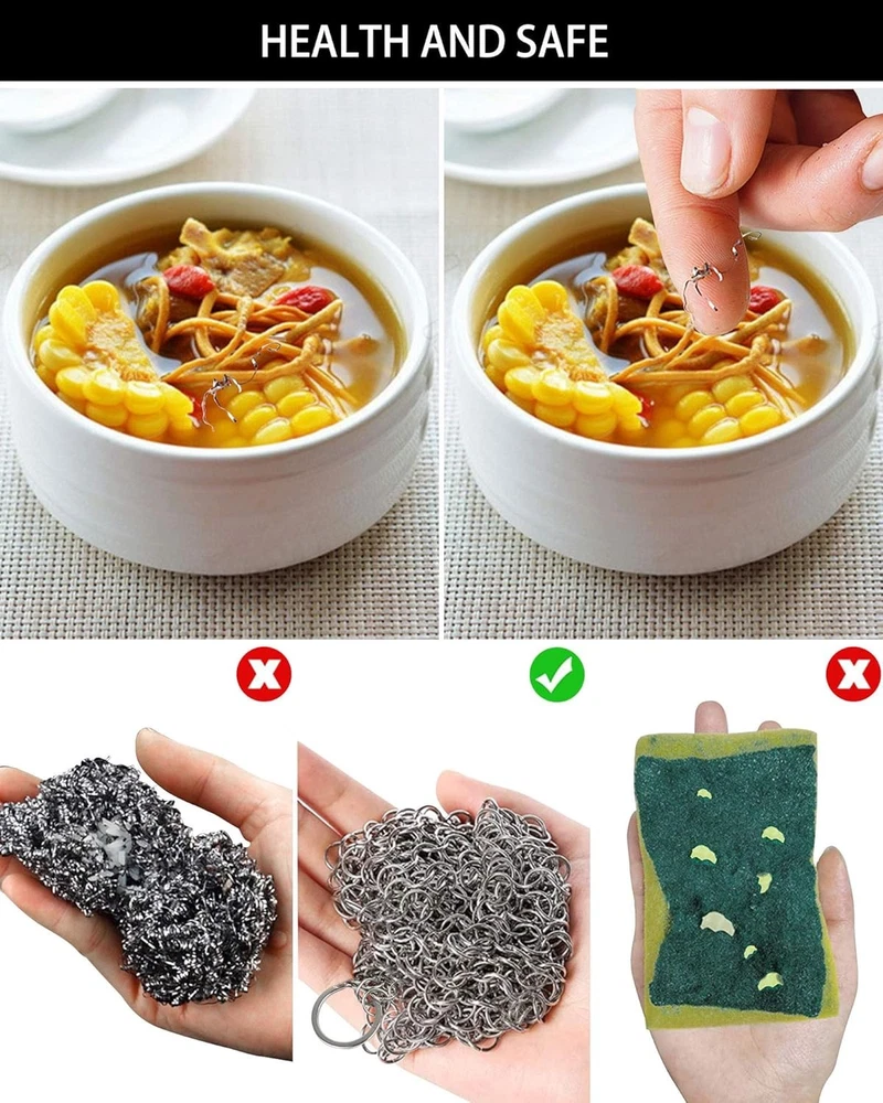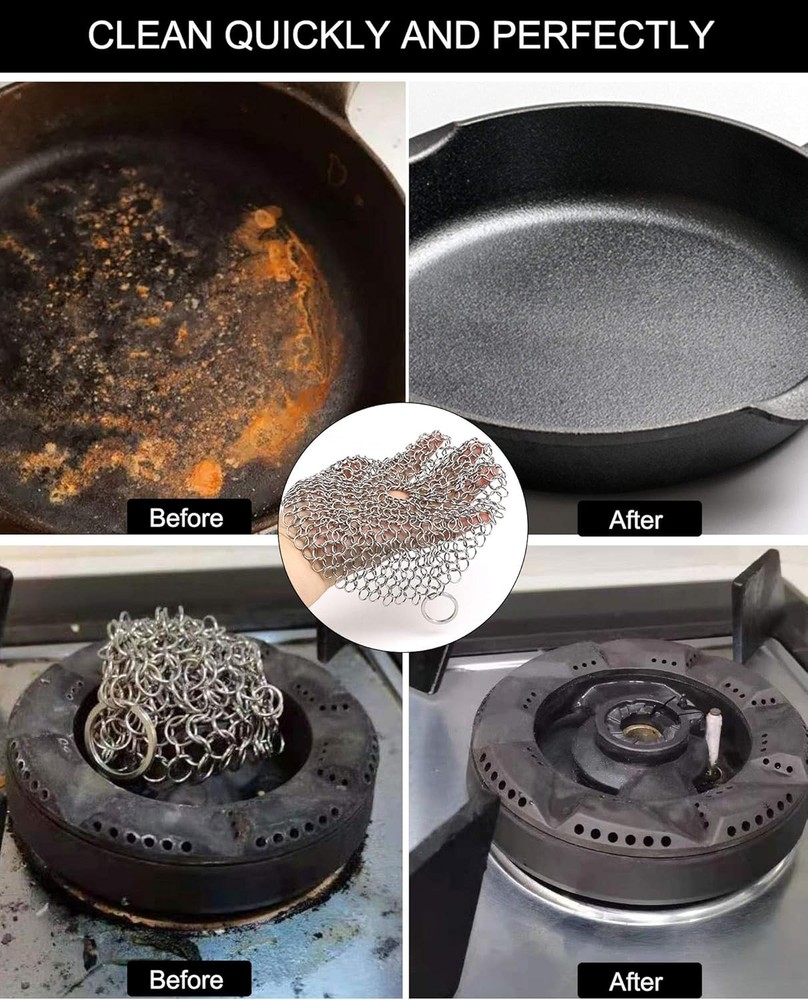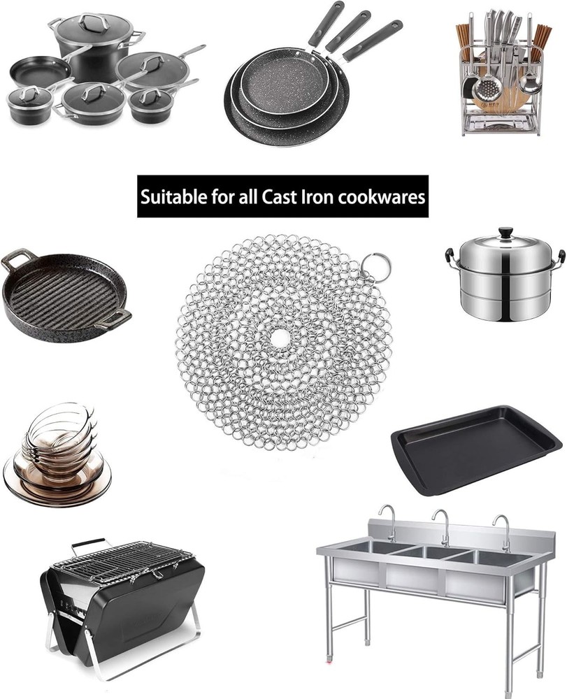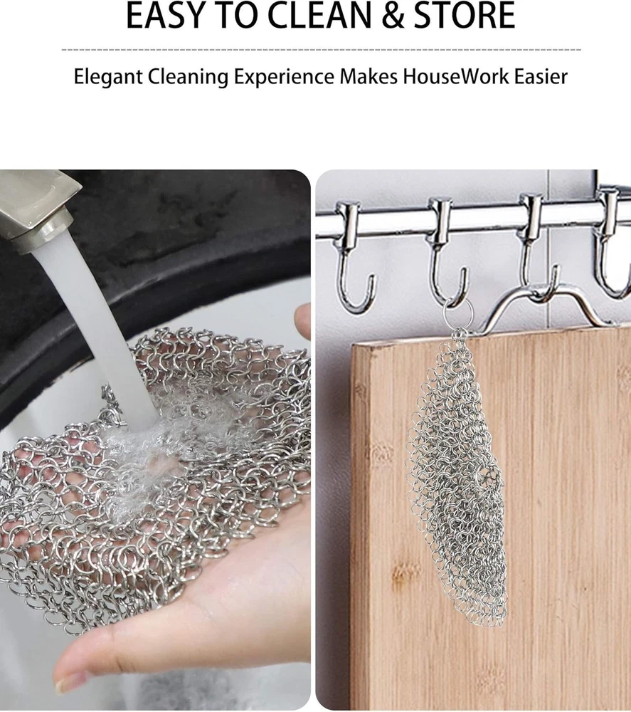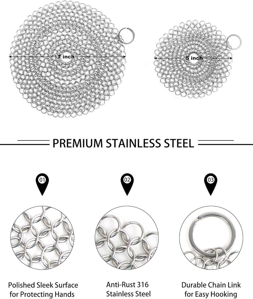 Cast Iron Skillet Cleaner Chainmail,2 Pack 2 Piece Assortment, Silvery Product Details Package Dimensions : 3.82 x 3.43 x 0.98 inches; 1 Pounds Item model number : 2PCSCLEANER Manufacturer : ONEEKK Brand: ONEEKK Color: Silvery Handle Material: Stainless Steel Specific Uses For Product: Cast Iron Pans, Stainless Steel, Glassware, Bakeware Material: Stainless Steel, Chain Maille 【CLEAN QUICKLY AND PERFECTLY】ONEEKK cast iron skillet cleaner is made of Premium 316 stainless steel smooth ring, chain mail link design, lock and scrub stubborn stains efficiently, helping you effortlessly clean cast iron products without stripping cast iron seasoning. Chain maill to clean cast iron any residue with warm water which will release quickly and easily. No soap or harsh detergents needed. A new cast iron back again. 【MULTI-USE SCRUBBER】The cast iron scrubber/Stainless Steel scrubber/cast iron cleaning kit Suitable for all uncoated cookware, likes bakeware, tea pots, cauldrons, wok, pre-seasoned pan, griddle pans, BBQ grills, tortilla press, hibachi, waffle maker, muffin pan, pie pan, Dutch oven and casserole and more! Smaller size cast iron cleaner can clean deep inner wall by its own weight. Lightweight and convenient for home, camp chef or travel. 【HYGIENIC & REUSABLE】Our chain maille scrub mesh is made with restaurant-grade 316 stainless steel that resists rust and fiber deformation shedding, keeps away from odors and mildew for optimal longevity. It's ideal cast iron cleaning kit to instead of cast iron sponge and steel wool scrubber. 【EASY TO USE, CLEAN AND STORE】Circular design enable central& outer rings superior grip. Chainmail ring size enables effective cleaning residue. Ring to hang on a hook after washing. Dishwasher safe.