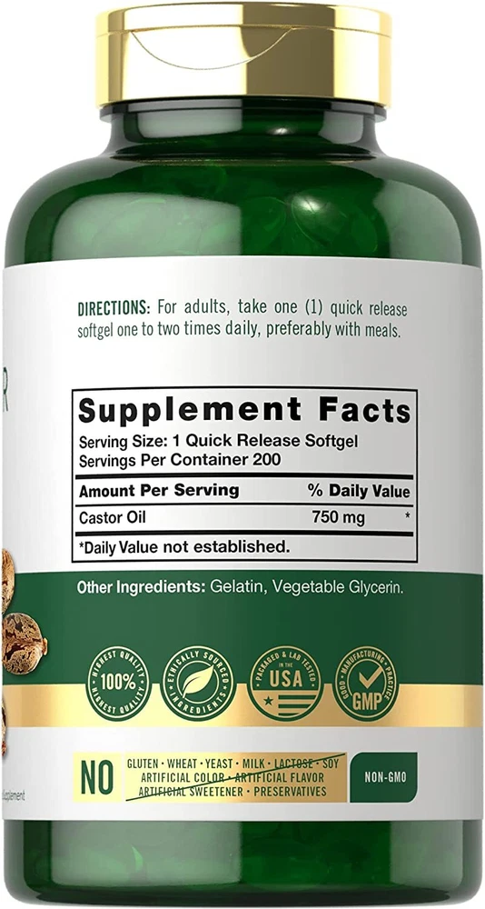 What is Castor Oil? Castor Oil is an oil derived from the seeds of the Ricinus communis plant. It is native to tropical areas of Africa and Asia where it has been used in wellness practices for hundreds of years. The naturally occurring fatty acids from this oil provide nourishment for skin when used topically, however, Castor Oil is now used in vitamin and supplement forms like caplets, softgels, capsules, pills, bulk powder, liquid, and more. Castor Oil Capsules: At Carlyle, our traditional herbal supplement is made with the finest source of Castor Oil from the seeds of the Ricinus communis plant. This premium formula provides 750 mg of Castor Oil in each quick release softgel. It’s gluten free, non-GMO, and lab-tested to ensure maximum purity and potency for your benefit. Carlyle Castor Oil — Rooted in Wellness: Our expertise in sourcing the purest ingredients combined with advanced technologies makes us proud to deliver premium, honest supplements at the best value. Carlyle Castor Oil is a testament to our commitment to excellence, made with powerful ingredients rooted in wellness. Thanks for choosing us in your pursuit of living healthy.