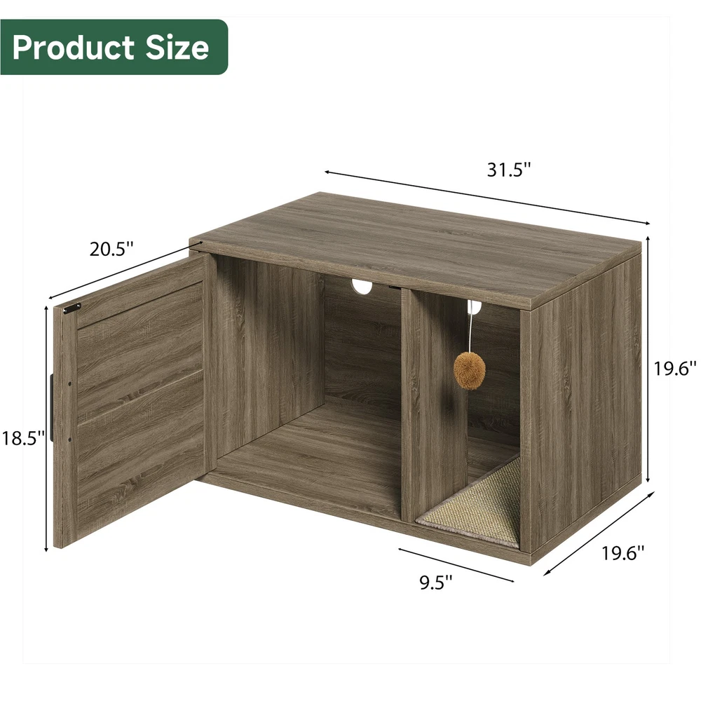 Feature: 1. Multifunctional Design: Used as a litter fence or house for your cat. It can also serve as a stylish side table, suitable for placing books, crafts, or other items, combining functionality and style seamlessly. 2. Odor Control: This cat litter box furniture is designed to provide your cat with a private metabolism space, helping to control odors and suitable for most litter boxes, ensuring a fresher home environment. 3. Entertainment Needs: The entrance of this enclosed cat litter box features a scratching pad, allowing cats to enjoy their nature scratching instinct as they enter. 4. Sturdy and Stable: Made of high grade chipboard and premium metal frame, the cat litter box is more durable and secure, ensuring high safety standards. 5. Easy to Assemble: Clear instructions, assembly tutorials, and all necessary tools are included in the package for easy installation in a short amount of time, with minimal assembly difficulty. Specification: Item Type: Cat Litter Box Enclosure Size: Approx. 80x50x50cm / 31.5x19.69x19.69in Material: Particle Board Door Number: 1 Package List: 8 x Boards 1 x Pad 14 x Accessory Pack 1 x User Manual Note: