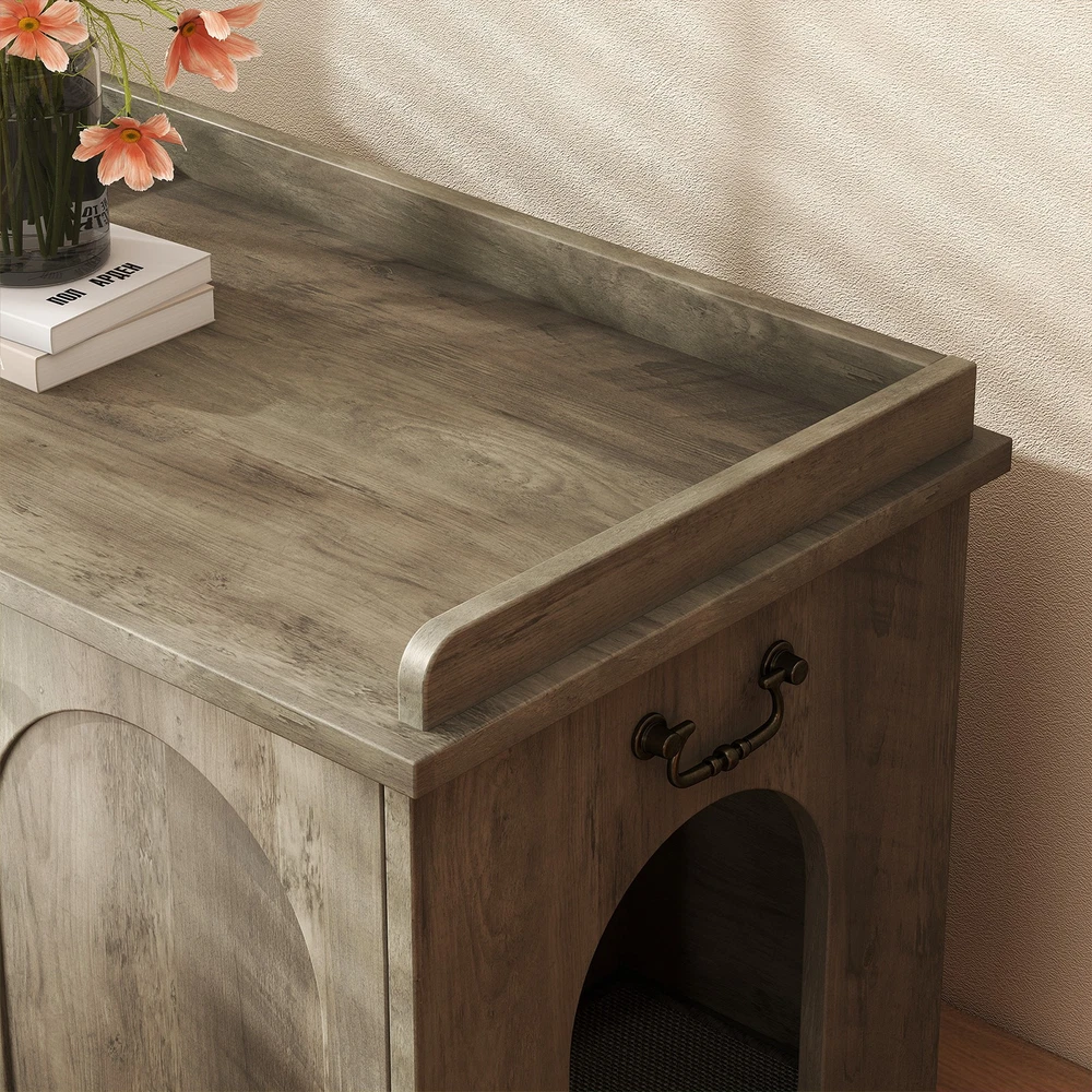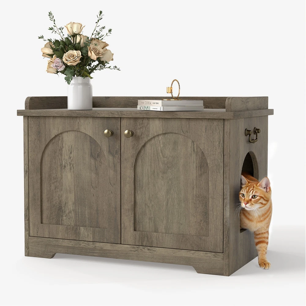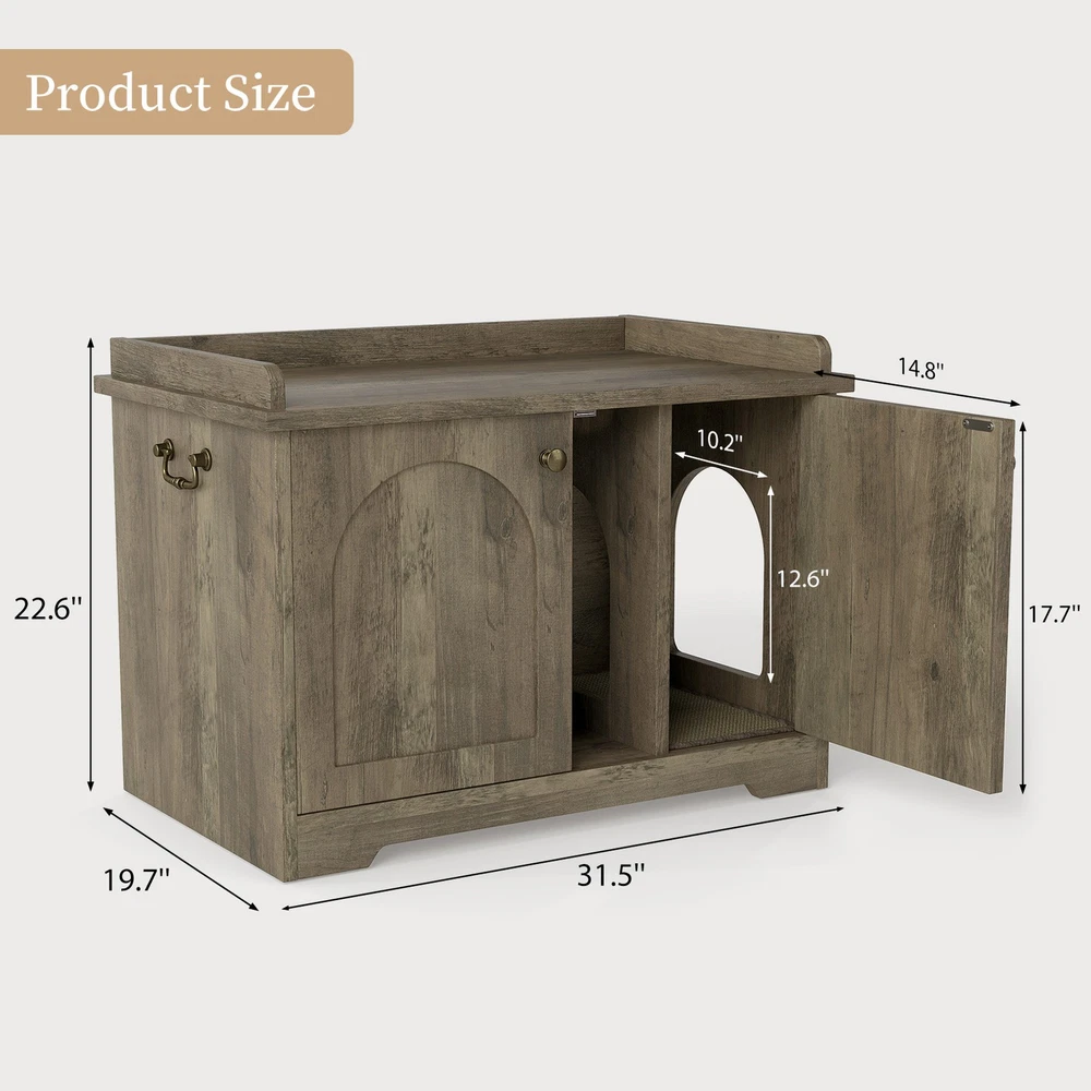 Feature: 1. PET FRIENDLY DESIGN: This cat litter box enclosure provides a private bathroom space for your feline friend. Add a litter box inside and create a cozy, quiet corner with a cat bed and toys, giving your kitty the excellent place for napping and relaxation. 2. ODOR CONTROL: Designed to offer your cat a dedicated area for their needs, this litter box furniture helps suppress unpleasant odors. It fits most litter boxes and keeps your home smelling fresher, while also preventing litter spills and messes. 3. MULTI FUNCTIONAL: This cat house serves dual purposes, not only is it a litter box barrier, but it also functions as a cat house. With its stylish furniture aesthetics, it can easily double as a side table or coffee table next to your sofa, providing a practical place for books, decor, or other items. 4. STURDY AND STABLE: Crafted from high strength boards, this pet box enclosure is both robust and enduring, ensuring safe usage for your pets. Its double cabinet doors allow for easy access when refilling cat food or cleaning up, enhancing convenience for pet owners. 5. COMPREHENSIVE KIT: The kit includes clear instructions, all necessary tools, and hardware for easy assembly. This wooden cat house transforms untidy areas into neat, cozy spaces, providing your cat with a private place to do their business without compromising your home's aesthetic. Specification: Item Type: Cat Litter Box Enclosure Furniture Size: Approx. 80x56x50cm / 31.5x22.05x19.69in Material: Boards Doors: 2 Package List: 13 x Boards 1 x Scratching Pad 13 x Accessories Pack 1 x Instruction Manual Note: