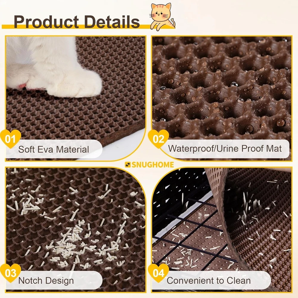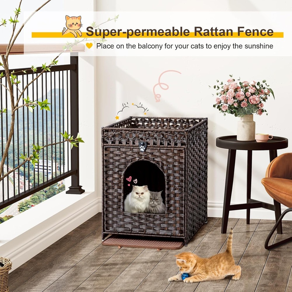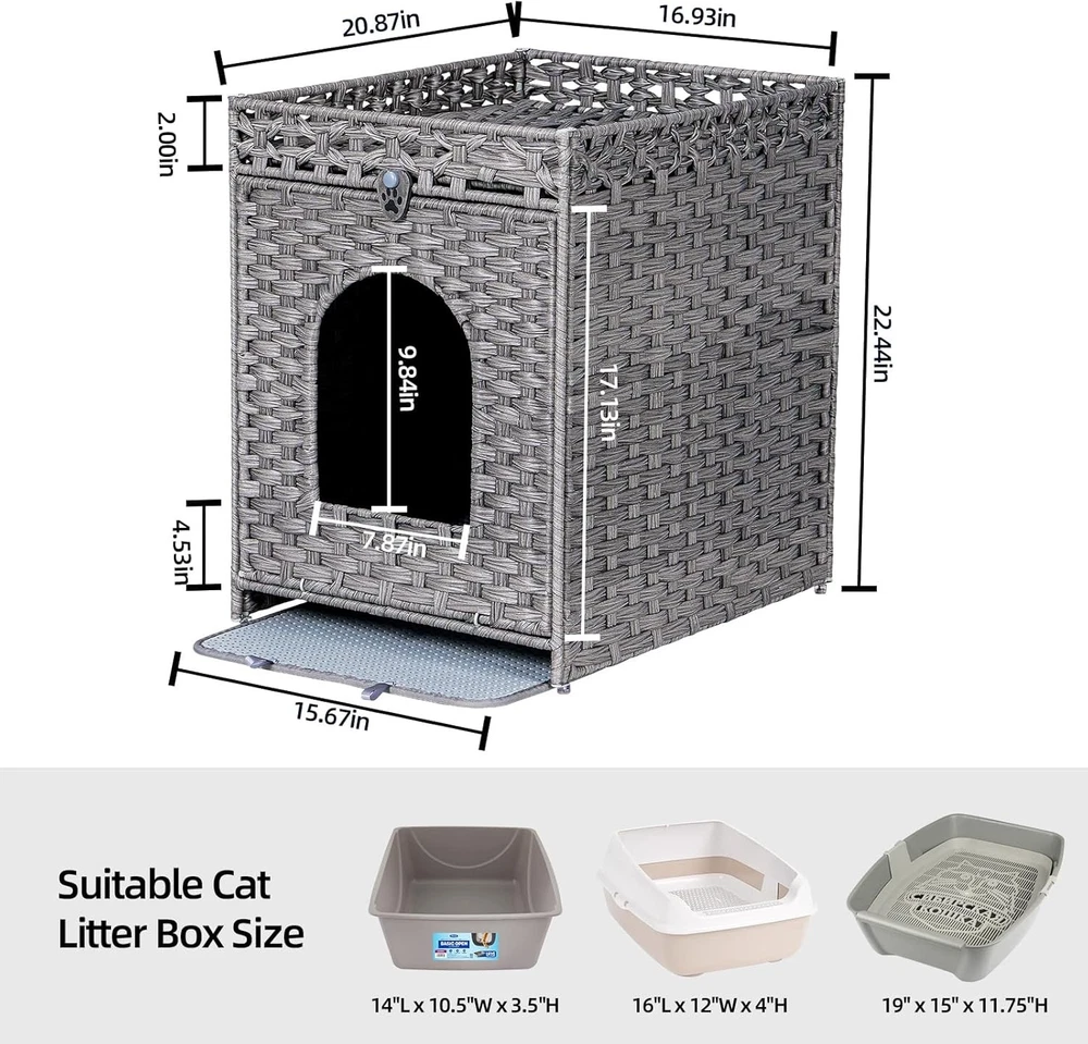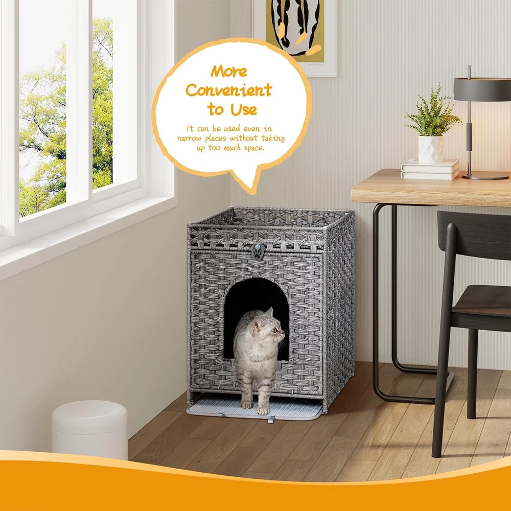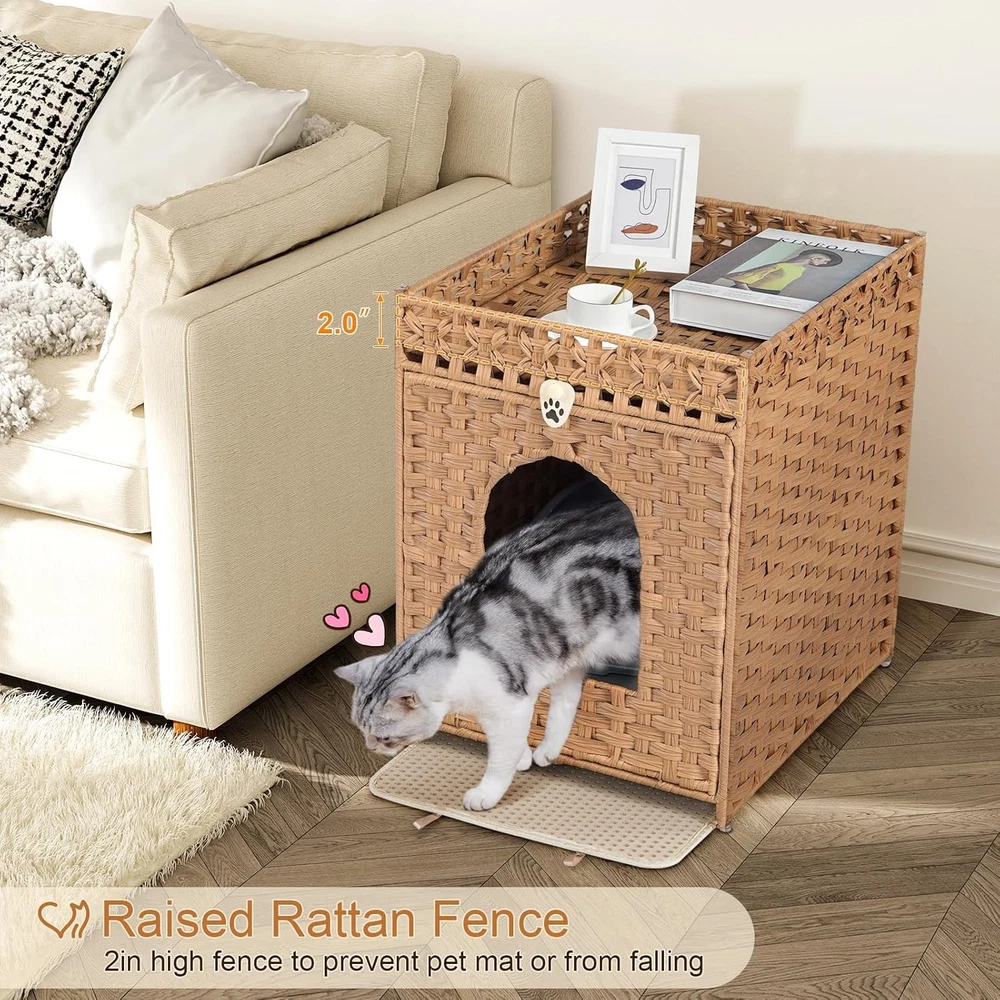 Product description Snughome Cat Litter Box Enclosure with Cat Litter Mat This handwoven rattan cat house not only provides a cosy nook for your pet, but also enhances your home decor with its warm and rustic charm. What' more, its wide range of applications can meet your various needs. This woven rattan cat litter house provides your pet cat with a place that combines aesthetics and privacy. Simple Installation Step Thoughtful Design More Details Soft Eva Material Waterproof/Urine Proof Mat Notch Design Convenient to Clean Exquisite Handwoven Rattan Material