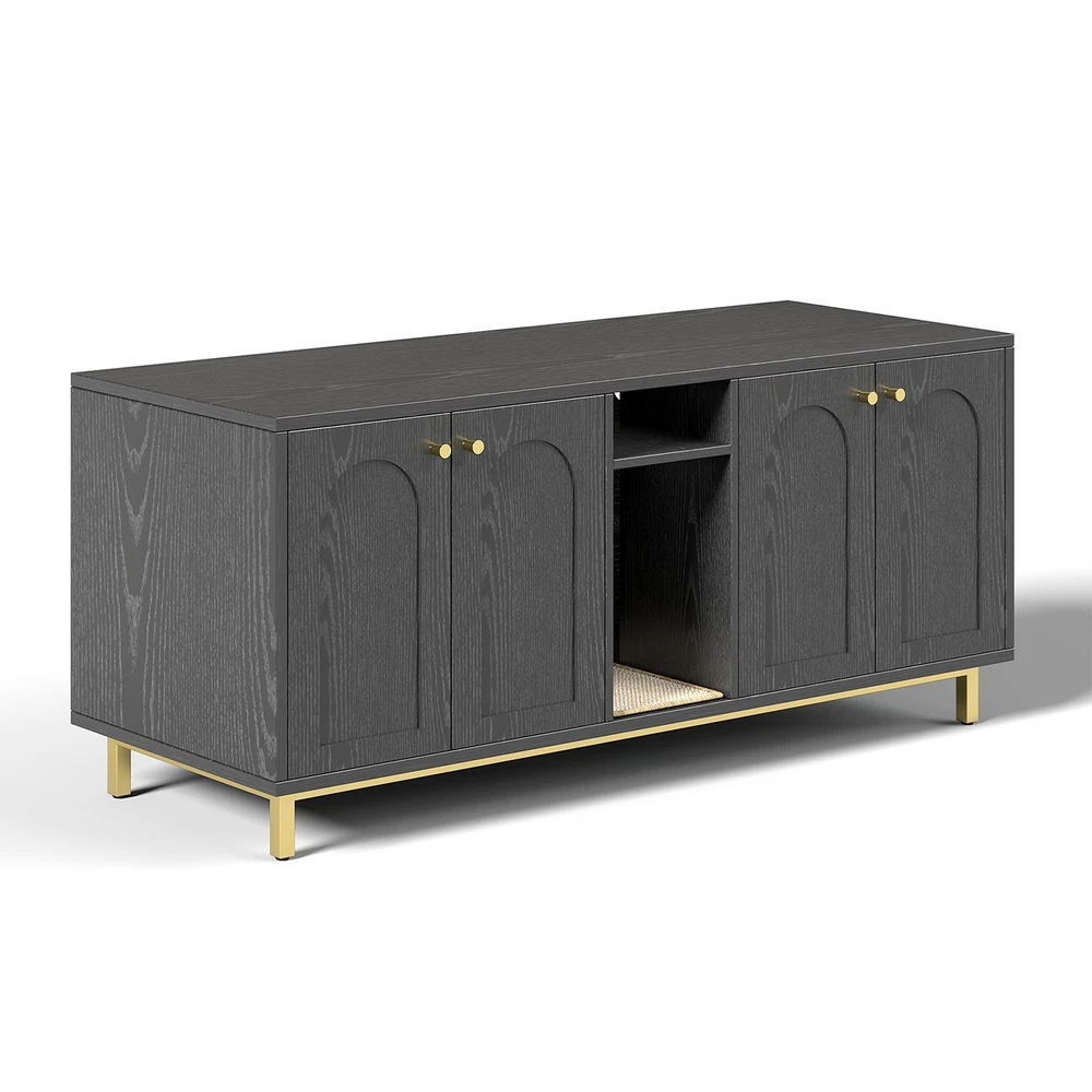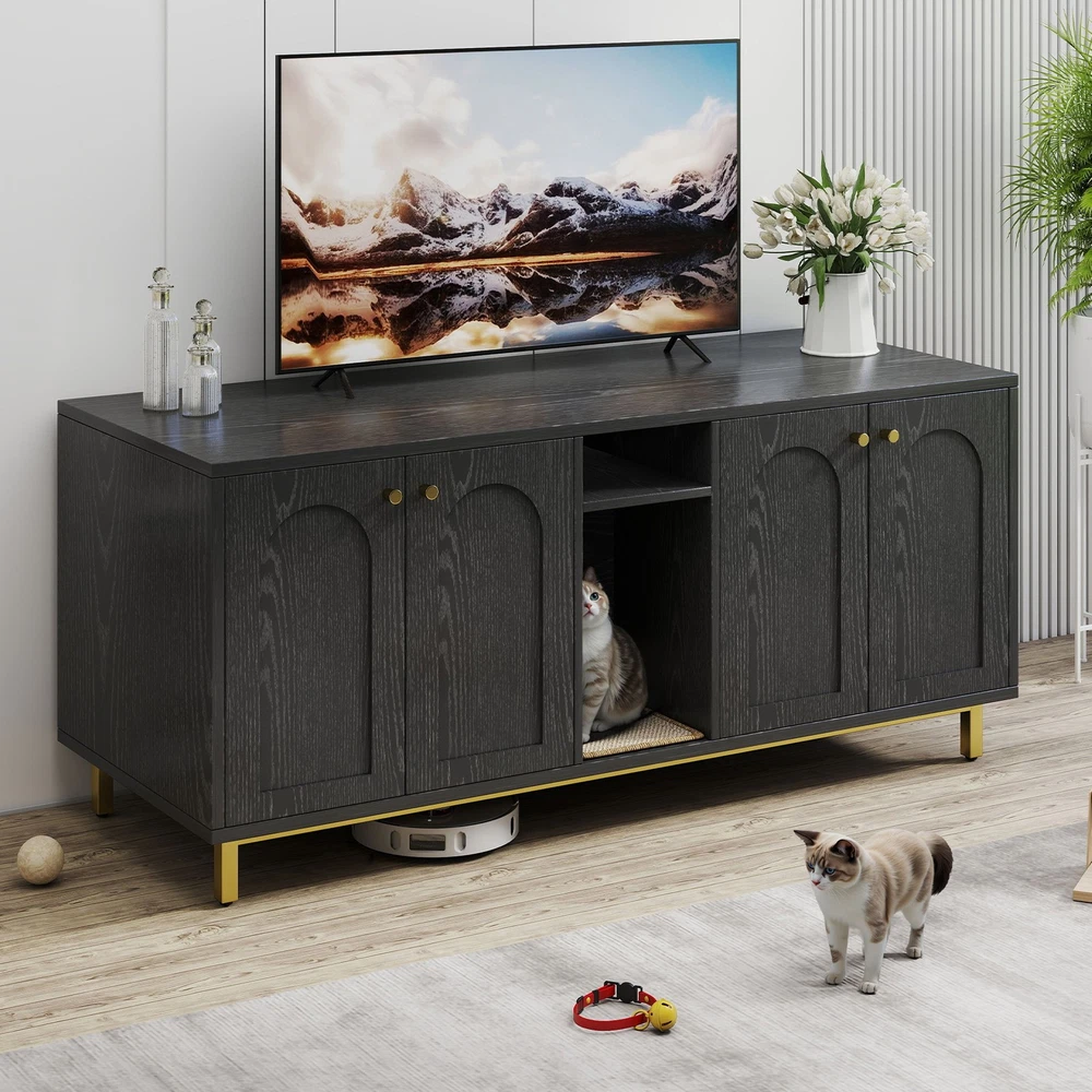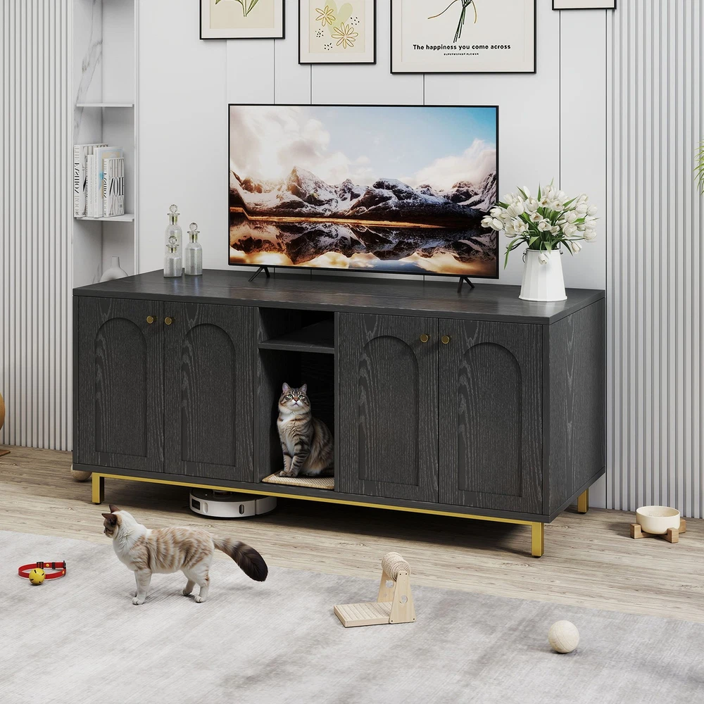Feature: 1. Spacious Room Design: Our luxurious double cat room design offers ample space for two cats to comfortably use at the same time. This spacious design ensures that both of your furry friends have enough room to feel relaxed and secure. 2. Integrated Scratching Pad: This litter box is equipped with a built in scratching pad, allowing your cats to indulge in their nature scratching instincts as they enter. 3. Multifunctional Furniture: Our large wooden cat litter box serves a dual purpose as a cozy cat house and a stylish piece of furniture. It prevents dogs from accessing the litter area while seamlessly blending in with your home decor, functioning as a TV stand or side table. 4. Magnetic Double Door Design: The innovative magnetic double door design simplifies daily cleaning and litter replacement. The thoughtfully engineered entry mechanism allows your cats to enter with ease, while ensuring proper ventilation and ample light inside. 5. Rugged And Easy To Clean: Made from particle board, this enclosure is built to last and withstand everyday use. The ten small holes at the back effectively eliminate odors, while the easy to clean wooden surface ensures that maintenance is quick and efficient. Specification: Item Type: Cat Litter Box Enclosure Size: Approx. 140 x 60 x 50cm / 55.12 x 23.62 x 19.69in Color: Black Material: Particle Board Doors: 4 Package List: 14 x Boards 2 x Iron Bars 2 x Iron Frames 1 x Scratching Pad 18 x Accessory Packs 1 x Base Fixing Device 1 x Manual
