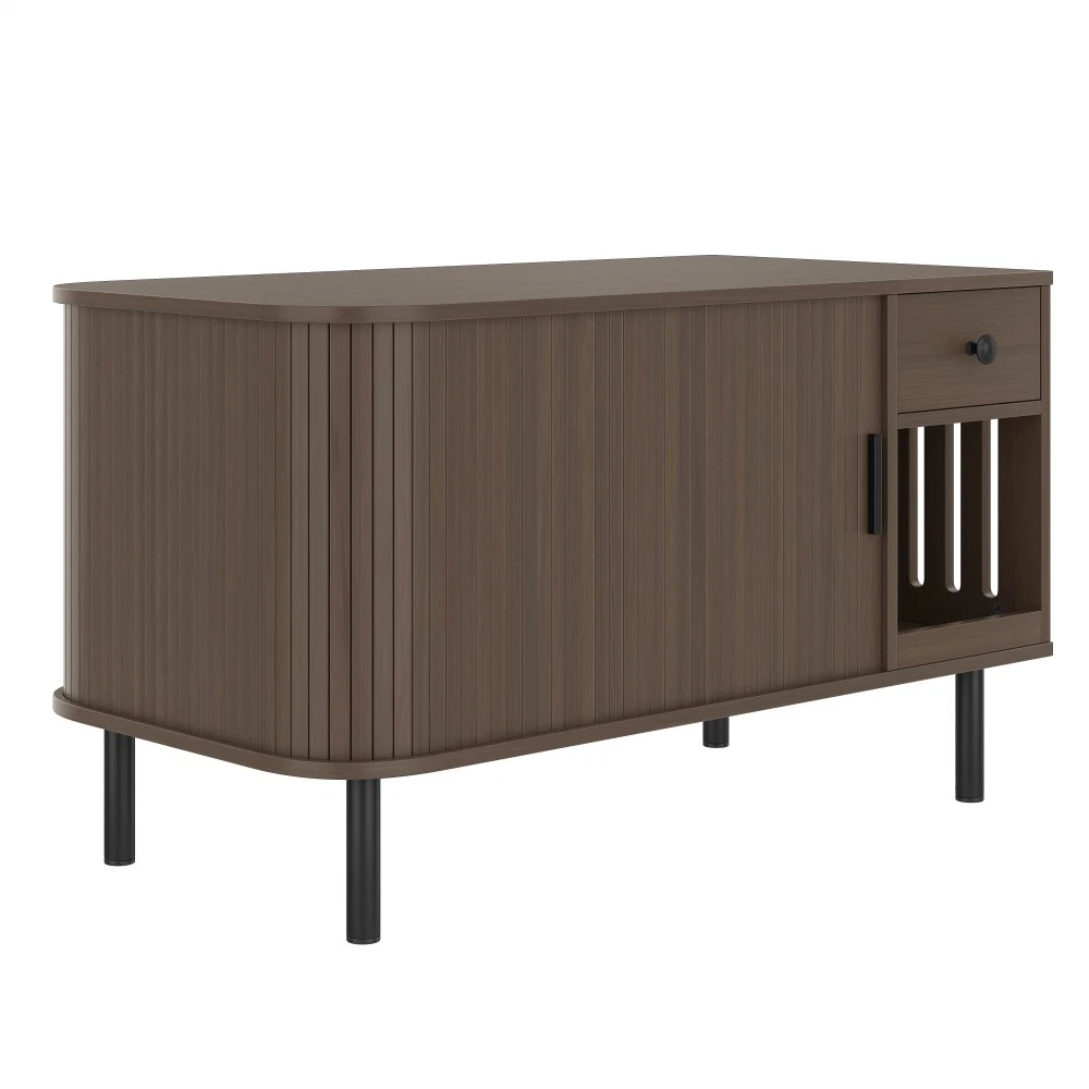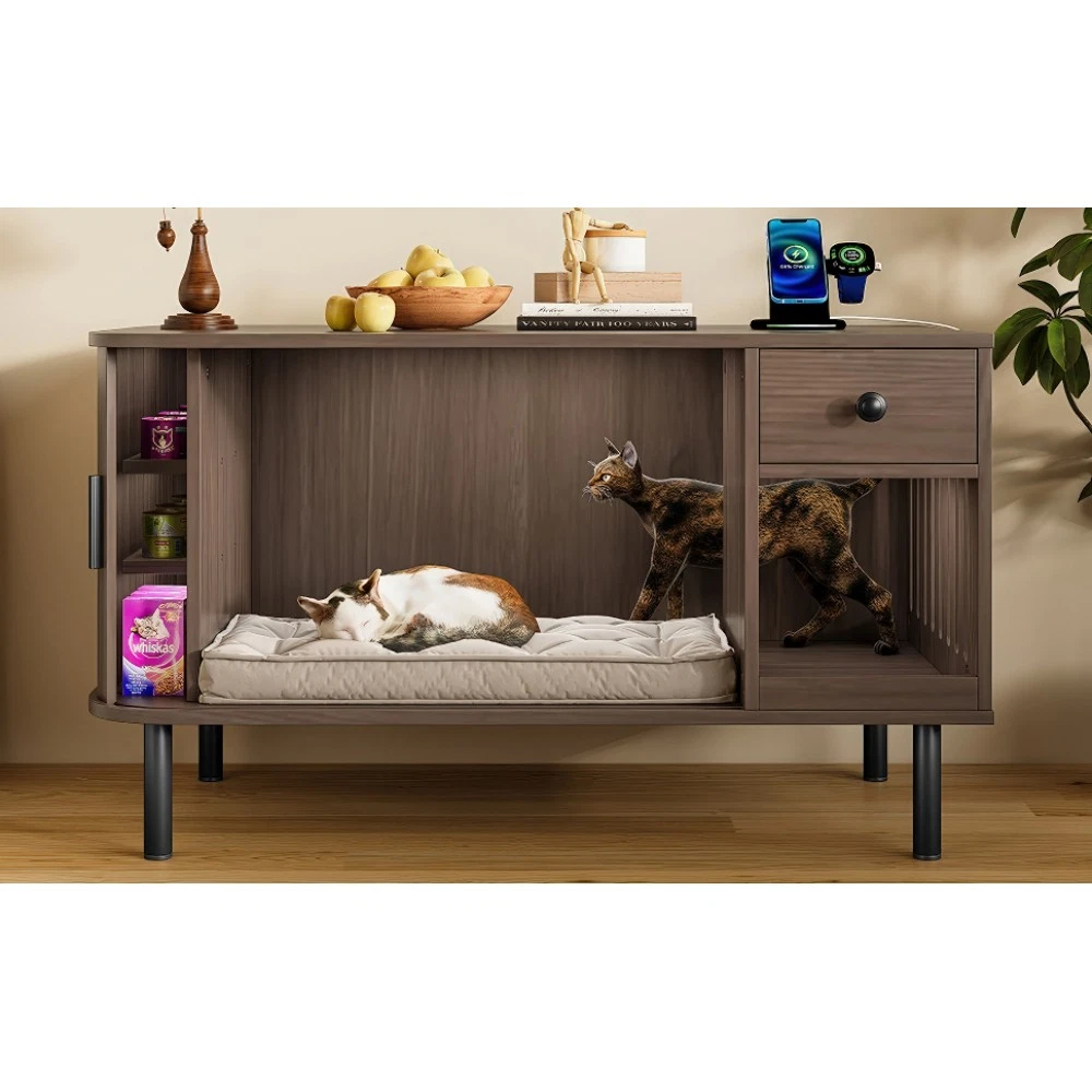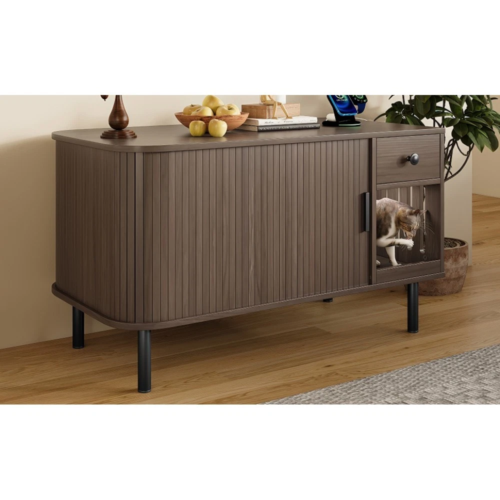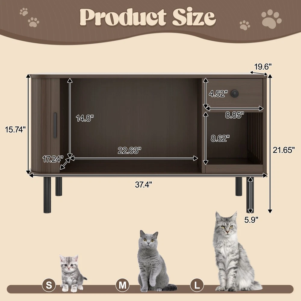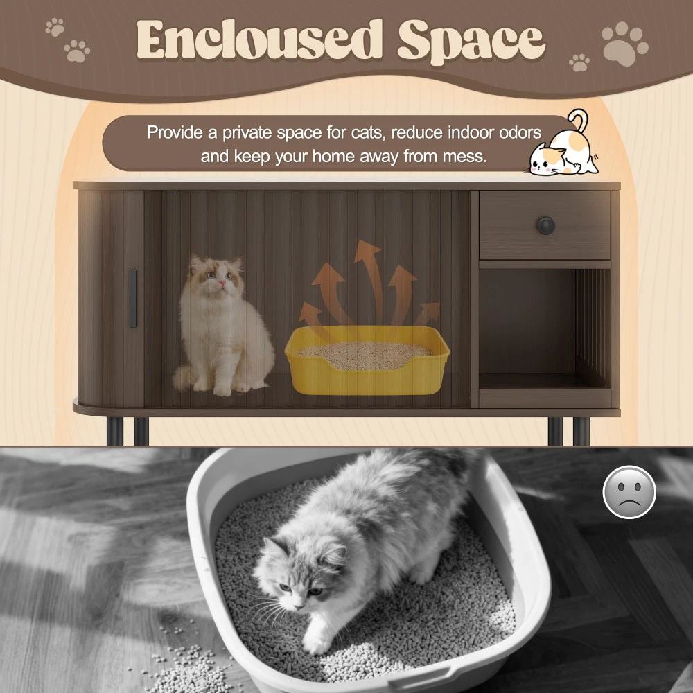 37.4" Cat Litter Box Enclosure with Sliding Door, Hidden Cat Furniture with Storage Drawer & Charging Station, Brown MDF Side Table/TV Stand for Living Room 🌟 Elevate Your Home & Pamper Your Feline Friend! 🌟 Introducing our 37.4" Cat Litter Box Enclosure – the perfect blend of modern home décor and practical cat care solutions. Crafted with high-quality MDF and finished in a sleek brown tone, this versatile furniture piece seamlessly integrates into your living room, bedroom, or hallway while providing a private, cozy space for your cat. No more unsightly litter boxes ruining your home aesthetic – this enclosure keeps your cat’s business hidden and your space stylish! ✨ Key Features That Make It Stand Out Multifunctional Versatility : Featuring a chic tambour sliding door and elegant curved edges, this piece boasts a modern look that complements any home style. Beyond being a hidden litter box enclosure or cozy cat house, it doubles as a side table, TV stand, or nightstand. Use it to hold your coffee, lamps, or décor – functional for you, comfortable for your cat! Privacy for Your Cat, Odor Control for You : The fully enclosed design creates a secure, private retreat your cat will love. Place a litter box inside for a discreet bathroom, or add a cat bed for a quiet napping spot. The enclosed structure effectively contains odors, keeping your home smelling fresh. Enhanced Ventilation System : Equipped with multiple side air holes that promote optimal air circulation. This design reduces moisture and trapped odors, ensuring a fresh, comfortable environment for your feline companion year-round. Ample Organized Storage : The spacious tabletop is ideal for displaying potted plants, magazines, lamps, or your favorite home décor. Plus, the built-in drawer and side shelves offer convenient storage for litter scoops, cat toys, treats, or other pet essentials – keeping your space neat and clutter-free. Built-in Charging Station : Stay connected effortlessly! This furniture comes with a handy charging station, perfect for powering up your phone, tablet, hair dryer, or other electronic devices. No more searching for outlets – convenience is at your fingertips. Durable Construction & Easy Assembly : Made from sturdy engineered wood (MDF) with a rich brown finish and stable metal legs, this enclosure is built to last. Simple-to-follow assembly instructions are included, so you can set it up in no time – no professional tools needed! 📐 Product Specifications Assembled Dimensions : 37.40" L x 19.60" W x 21.65" H | Weight: 36.82 lbs Package Dimensions : 42.83" L x 23.03" W x 5.24" H | Weight: 42.00 lbs Material : High-Quality MDF | Color: Brown 🛡️ Trusted After-Sales Guarantee We stand behind the quality of our products! Enjoy 1-Year Quality Warranty for peace of mind – if there are any manufacturing defects within one year of purchase, we’ll offer a free replacement or repair. Additionally, we provide a 30-Day Free Return & Exchange Policy – if you or your cat aren’t completely satisfied, simply return it within 30 days for a full refund, no questions asked. Why Choose Our Cat Litter Box Enclosure? It’s not just a litter box cover – it’s a functional, stylish addition to your home that caters to both you and your feline companion. Say goodbye to unsightly litter boxes, cluttered pet supplies, and searching for outlets. Invest in a piece that combines beauty, utility, and comfort today! 📍 Made in China | Fast Shipping to US Order now and give your cat the private space they deserve while upgrading your home décor!