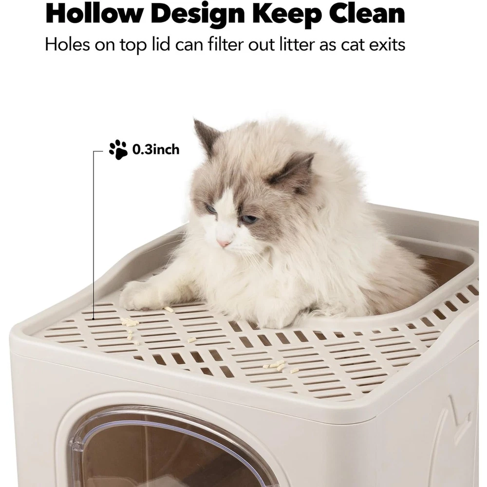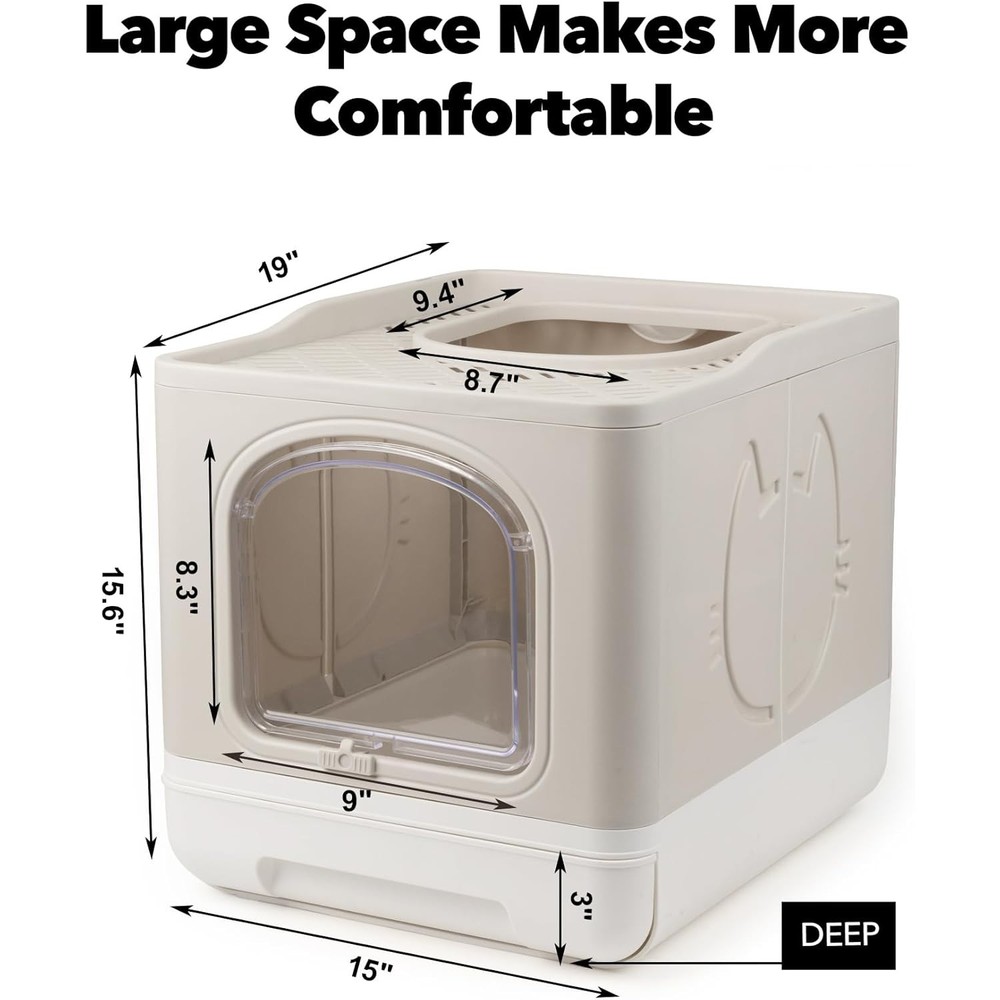 About this item Sloping Design No More Urine Leakage: Our cat toilet's sloping design and tight connection gap guide urine flow to the litter, preventing any leakage Drawer Design Effortless Cleaning: The litter box with pull-out drawer structure makes the kitty litter tray easy to clean and exchange cat sand, saving you time and effort 2 Way Door Front or Top In and Out: With a simple slider, the litterbox can be turned into a one way door for front entry and top exit. The 0.3inch filter holes at the top prevent litter from splashing around Large Space Comfortable Environment: Our kitten litter box has a spacious and deep interior (19"x15"x15.6" LxWxH), providing a comfortable environment for cats under 16lbs to turn around easily