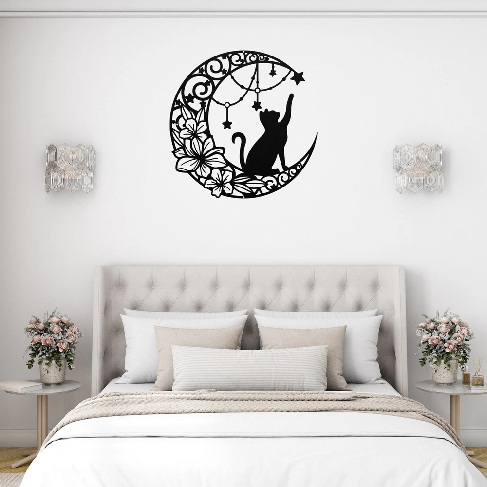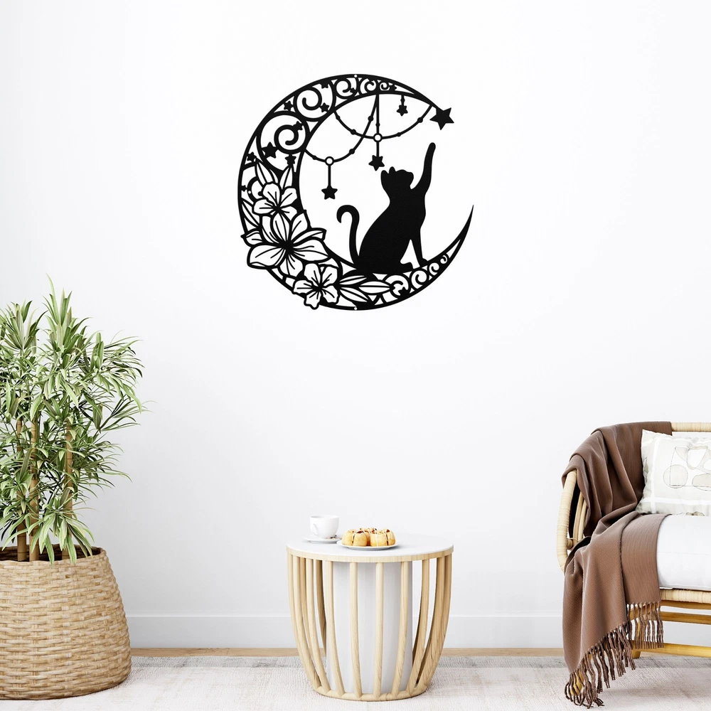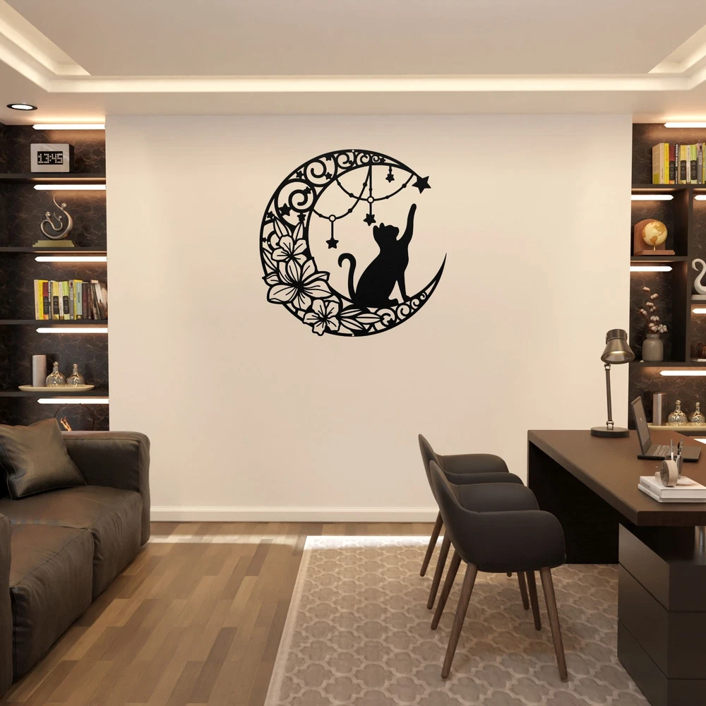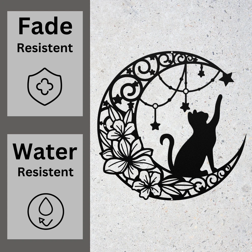 Product Description Cat and Moon Metal Art Decor Cat Lover Gifts Home Office Decoration Metal Signs Bring a touch of whimsy and mystery to your space with this Cat and Moon Metal Art Decor . Featuring a sleek silhouette of a cat perched under a crescent moon, this enchanting piece is ideal for cat lovers and adds charm to any home, office, or outdoor space . Whether you’re decorating a cozy corner or looking for a heartfelt gift, this metal sign is sure to impress. Made from high-quality 16-gauge laser-cut metal , this art piece is powder-coated to resist rust and wear, making it suitable for both indoor and outdoor use . Its elegant design complements a variety of decor styles, from minimalist to rustic or mystical. Key Features: Charming Design: Features a captivating cat and moon motif, perfect for cat enthusiasts and celestial decor fans Premium Quality: Crafted from durable 16-gauge metal with a weather-resistant powder-coated finish Versatile Use: Ideal for living rooms, offices, gardens, or patios Perfect Gift: A thoughtful choice for birthdays, holidays, housewarmings, or cat-loving friends Indoor and Outdoor Friendly: Built to withstand the elements while retaining its artistic beauty Add a magical touch to your decor with this Cat and Moon Metal Art , blending feline elegance and celestial wonder into a truly unique piece. Service and Color Choice Our metal signs are designed to be personalized just for you, making them the perfect addition to any space! The default color for our signs is Black , but we also offer a variety of beautiful options including Copper, Gold, White, and Silver . After placing your order, simply contact us with your preferred color choice, and we'll ensure your sign is exactly how you envision it. Let’s create something special together!
