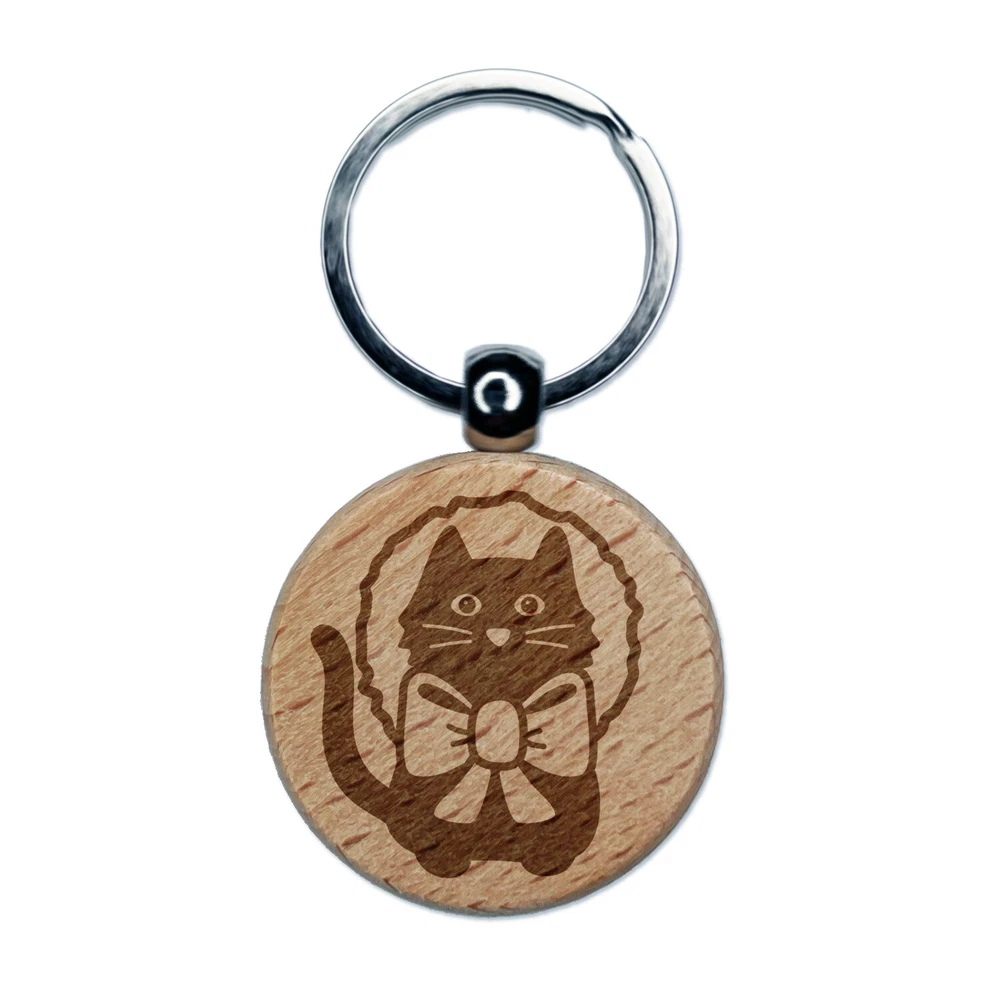 Cat in Christmas Wreath Engraved Wood Round Keychain Tag Charm