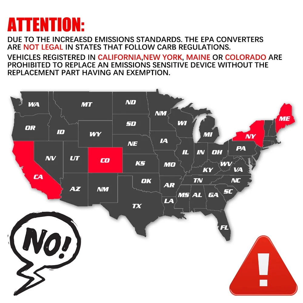 You may also like Alternator for 08-17 Chevrolet Equinox/ 07-09 Suzuki XL-7 /08-10 Saturn Aura VUE 89.99 USD Free shipping OEM Rear Drive shaft Driveshaft Assy For 07-10 Ford Explorer Sport Trac 4.0 4.6L 179.99 USD Free shipping OEM Power Steering Rack & Pinion fits 2009-2014 Nissan Maxima V6 3.5L 26-3083 S+ 169.99 USD Free shipping OEM Front Flex Exhaust Pipe For Ford Explorer 2011-2019 Flex 13-2019 3.5L 55661 89.99 USD Free shipping OEM Alternator For 07-13 Nissan Altima Sentra 2.5L 11-15 ROGUE 110A 11258 11458 89.99 USD Free shipping Timing Chain Kit For 2007-15 Toyota Camry, 6 Cylinder Only DOHC 24 Valves 6 Cyl 78.99 USD Free shipping OEM Rear Driveshaft Assy Drive Shaft Fit BMW 325xi 330xi E46 2.5L 3.0L 2001-2005 179.99 USD Free shipping Alternator 4-Groove for Ford Explorer Fusion Edge Taurus Lincoln MKC MKT 200A CW 135.99 USD Free shipping For Kia Hyundai Forte Elantra GT Soul 1.8L 2.0L L4 DOHC 2011-16 Timing Chain Kit 38.99 USD Free shipping 2Pack - H7 Super Bright LED Headlight Fog DRL Bulb Kit High Low Beam 8000K White 9.89 USD Free shipping 2857 Radiator for 06-10 Chevy GMC Silverado Sierra 2500 HD / 07-10 3500 HD 6.6L* 159.99 USD Free shipping OEM Catalytic Converter SET For 06-08 Dodge Ram 1500 V6 3.7L V8 4.7L 55366588AD 113.99 USD Free shipping OEM RH Power Running Board Motor For 2015-2017 Ford Expedition Lincoln Navigator 79.98 USD Free shipping OEM Alternator For 11-16 Chrysler 300 Dodge Challenger Charger 3.6L 160Amp 11572 88.99 USD Free shipping OEM Transfer Case Assy For 2009-2014 Infiniti JX35 2013 Nissan Murano V6 3.5L S+ 439.99 USD Free shipping OEM Starter for Toyota Camry Lexus ES350 Scion TC XB 3.5L 3.3L 2.4L 28100-0A010. 50.99 USD Free shipping Product Description EPA Catalytic Converter For 2004-2006 Ford F-150 5.4L 4WD Lincoln Mark LT 645217 xFeatures : 1.Excellent Material.Our products are made of stainless steel housing, After Full Testing Under Extreme Conditions,which is highly resistant to heat, rust, corrosion,cracking and longer service life. 2.Our catalytic converters are direct replacements, Compliant with standard OE specifications, all mounting holes are securely and accurately fastened with the included gasket and hardware. 3.OE style high-technology washcoat and optimal precious metal load deliver required reduction in tailpipe emission to match vehicle application.Improved O2 storage and release with exact O2 sensor location(s). 4.Direct-Fit Design - Bolt-on replacement solution with OE-style routings for easy installation that doesn't require fabrication or welding. 5.By using, it can help to improve exhaust gas velocity, save horsepower and torque.Great emissions control, high efficiency and work efficiently. Specifications: Converter Configuration: Direct Fit Body Material: Stainless Steel Color:Natural Body Shape: Round Substrate Material: Ceramic EPA OBD-II Approved. Restricted States: California, New York, Colorado & Maine Placement on Vehicle:Driver & Passenger Side O2 Sensor Ports:2+2 Inlet Type:2 Bolt Loose Flange w/ Flare+2 Bolt Loose Flange w/ Flare Outlet Type:Pipe Connection+Pipe Connection Outlet Outside Diameter:2.5 in+2.5 in 5 years or 50,000 miles limited warranty. Part Numbers: 645217, 30494, 645218, 30495 Fitment : For 2004-2006 Ford F-150 5.4L 4WD ONLY For 2006 Lincoln Mark LT 5.4L 4WD ONLY Packag e Contents : 1x Catalytic Converter w/Installation Accessories Attention: ⭐Epa Approved. For Use with Federal Emissions Models Only. ⭐Not Legal for Sale in California, New York,Maine and Colorado. ⭐If Your Vehicle Is Registered in California , New York,Maine Or Colorado Do Not Purchase This Part. ⭐If Your Vehicle Meets California Requirements, but Is Not Registered in California or New York, This Converter Will Work on Your Vehicle Note: Converters don’t fail on their own. It is important to complete a full exhaust inspection and correct any other issues such as cracked manifolds and exhaust leaks prior to replacing the converter .This will ensure the root cause for the check engine light has been resolved for emissions code concerns and keep the engine running on all cylinders. STEP 1: Remove the cold air intake.Remove the engine cover. Reinstall the oil cap to avoid engine contamination.Remove the engine cover bracket to access the exhaust manifold.Remove the oxygen sensor.Remove the heat shield. STEP 2: Inspect the exhaust manifold for cracks before installing a new converter. If it is cracked, the manifold must be replaced or it will cause a non-warrantable converter failure. Remove and save the nuts from the intake flange. STEP 3: Remove the engine support bracket.Remove the catalytic converter.Line up the new catalytic converter.Loosely install one top nut to secure the catalytic converter. STEP 4: Make sure the engine bracket is attached to the new converter hanger and that the bolt is attached to the new converter hanger. Failure to use the bracket could lead to premature failure.Reinstall the downstream oxygen sensor. STEP 5: Complete the catalytic converter installation: 1.Tighten the converter inlet flange nuts and torque to the manufacturer’s specifications. 2.Reinstall hardware for the outlet flange. 3.Tighten the converter bolts and torque to manufacturer’s specifications. STEP 6: Reinstall the heat shield and oxygen sensor.Reinstall support bracket.Reinstall the engine cover and the cold air intake. Please Carefully Check Whether the OE Number And Picture are What You Need Before Buying. If You are Not Sure Whether It Fits, Please Write to us. If There are Any Problems, Communication by Letter Will be More Effective. No Instruction Included, professional installation is highly recommended. Payment Shipping Terms Returns Contact Us We accept PayPal only. If buyer want to delay the payment because of financial problem, please contact me by the ebay message within 3 days Payment via PayPal (PayPal accepts all major credits/debit cards and eCheque) ECheque payment will tak e 3-10 days to get clear, thus DELA