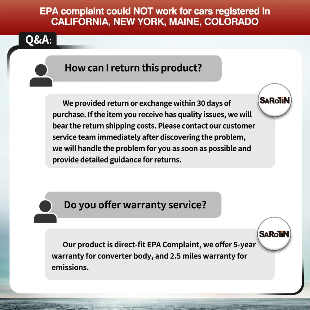 Item Description The catalytic converter is the most important external cleaning device installed in the automotive exhaust system. It can convert harmful gases such as CO, HC and NOx from automobile exhaust gas into carbon dioxide, water and Nitrogen by oxidation and reduction. When vehicle exhaust of high temperature across the purification device, the catalytic converter in the purifier will enhance the activity of CO, HC and NOx to promote its oxidation-reduction chemical reaction. Compatible For NISSAN MAXIMA 2004-2008 3.5L NISSAN MURANO 2003-2007 3.5L NISSAN QUEST 2005-2006 3.5l Advantages Durable: Sustainable use for more than 10 hours with a superior state Well-adapted: Able to be applied in rain and snow Temperature-resistant: The service life and performance of catalytic converter the can't be affected by high temperature Features 100% Brand new never used or installed Made From High-Quality Stainless Steel Light-Weight and Fast Air Flow Design 5 Years or 50,000 Miles Manufacturer Warranty Great emissions control device with stable performance, reliable quality and long service life CAUTION This is a Federal (EPA) compliant part, legal for use on vehicles built to meet Federal EPA standards ONLY. If your vehicle is registered in CA, NY, CO & ME, do not purchase this part. If your vehicle meets California requirements, but is not registered in CA, NY, CO & ME, this converter will work on your vehicle. Package Included 1x Catalytic Converter w/Installation Accessories