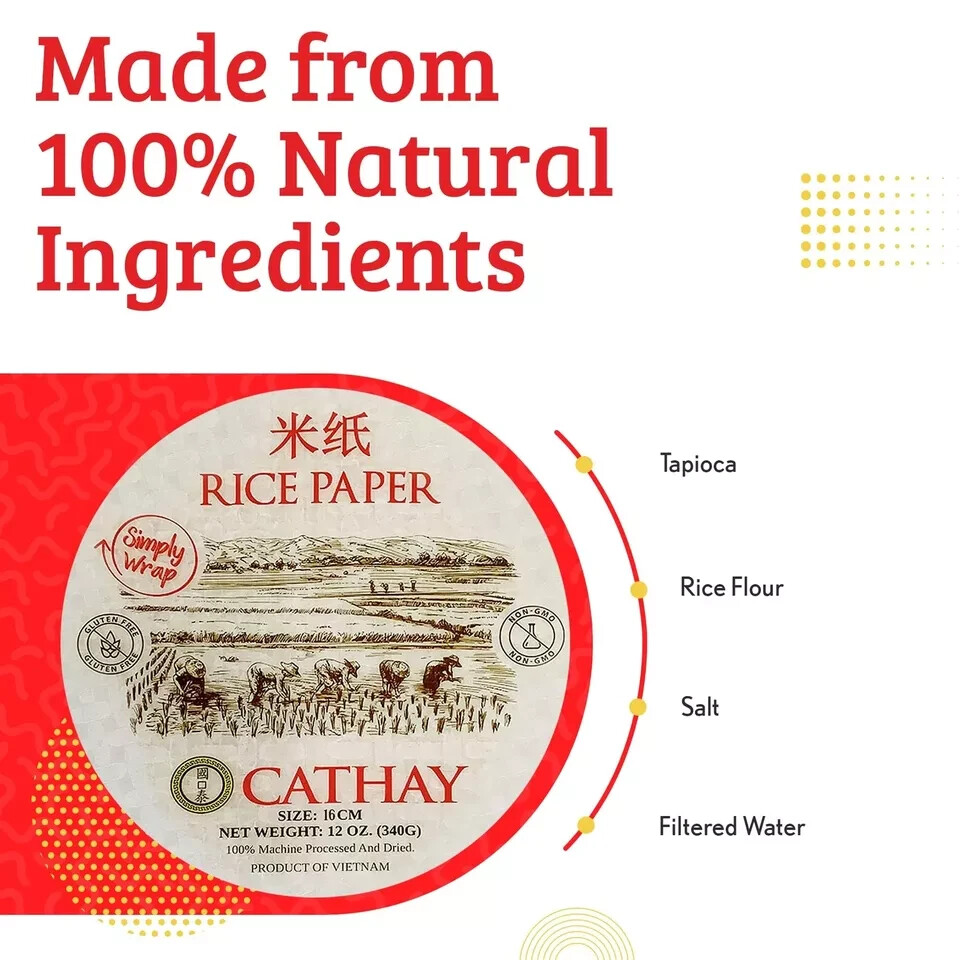 Cathay Fresh Spring Roll Rice Paper Wrappers, Rice Paper Wrappers for Fresh Rolls-25 Sheets, Non-GMO, Gluten-Free, Low Carb, Vietnamese Summer Wrap with Natural Ingredients, Veggie Wrap (Round, 25cm) ✓ Free 30 Day Returns ✓ Free Shipping 【 PREMIUM QUALITY 】: Cathay Spring Roll Rice Paper Wrappers are made from specially selected ingredients sourced from Vietnam and 100% machine processed and dried, which brings you a fantastic and delicious food experience each and every time. Does not easily break when wrapping like the other brands out there! 【 JUST THREE EASY STEPS 】: To build your spring roll, simply wet the rice paper to slightly rehydrate the wrapper. Then, fill it with any desired meats, vegetables, or herbs that suit your taste palate. Lastly, roll! It’s that easy. 【 NATURAL INGREDIENTS 】: Cathay Spring Roll Rice Paper Wrappers are made with only four, all-natural ingredients: Rice Flour, Tapioca, Water & Salt. NO saturated fat, NO preservatives, NO additives. NO Added Color, NON-GMO, Gluten-Free, 100% Natural, Vegan Friendly, Unbleached, Authentic Vietnamese Taste! 【 VERSATILE USAGE 】: Cathay Spring Roll Rice Paper Wrappers are the perfect base for making fresh spring rolls, summer rolls, and wraps. You can cut them into triangles and then fry or bake them as dipping chips. Alternatively, cut the wrappers into narrow strips before frying them to use as a salad topping. You may even use two rice paper sheets together when frying spring rolls to prevent breakage. Also perfect for decorating cakes and pastries! 【 ON THE GO TREATS 】: Do you want to know what the best part about a spring roll is? It’s portable! If you’re on the go and need a quick and healthy lunch, what better food to take with you than a handheld spring roll! Cathay Brand Rice Paper Wrappers for Spring Rolls taste great and transform boring dishes into an easy to eat roll! Does not break easily when wrapping ingredients like the other brands out there!