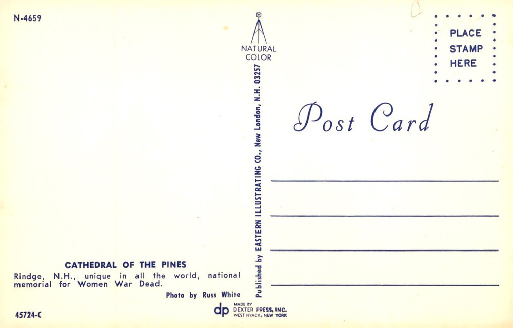 The Cathedral of the Pines in Rindge, N.H. is a unique national memorial dedicated to Women War Dead. This postcard features a photo by Russ White.