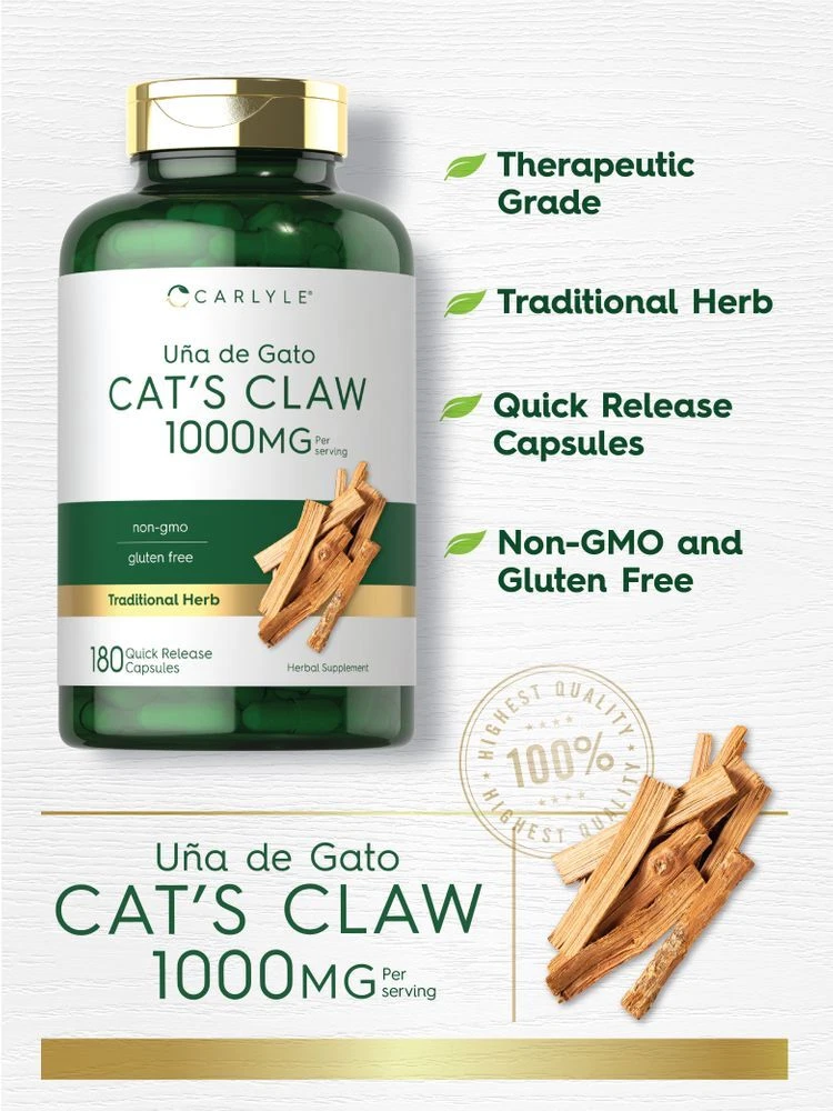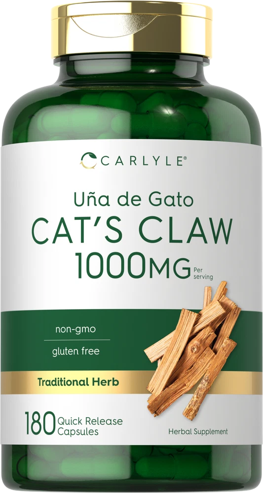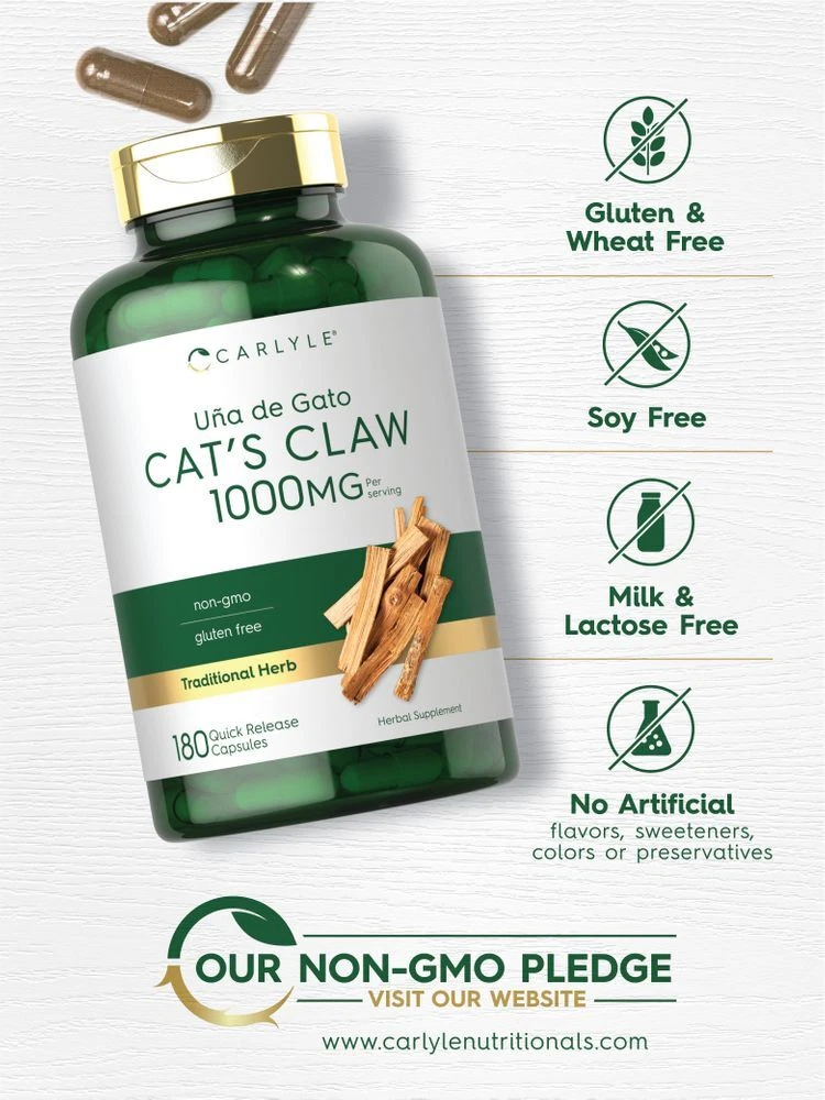 What is Cat’s Claw? Cat’s Claw herb, or Una de Gato, is a woody vine native to mountainous areas of the Amazon rainforest. The thorns of the plant resemble a cat’s claw, which is how it got its name. Nutritional use of Cat’s Claw dates back 2,000 years to South and Central America, where its bark and roots were used by indigenous people to make tea. Today, it can be found in many supplement forms including tablets, powder, tinctures, liquid, and more! Carlyle Cat’s Claw: Carlyle Cat’s Claw is an exceptional quality source of this amazing ingredient. Our gluten-free and non-GMO formula features 1,000 mg Cat’s Claw bark per serving, lab-tested for purity and potency to match our high standards of excellence. Get the ultimate supply for your daily routine now with each 180-capsule bottle and discover the nutritive power of this tropical herb! Rooted in Wellness: Our expertise in sourcing the purest ingredients combined with advanced technologies makes us proud to deliver premium, honest supplements at the best value. Carlyle Cat’s Claw is a testament to our commitment to excellence, made with powerful ingredients rooted in wellness. Thanks for choosing us in your pursuit of living healthy.