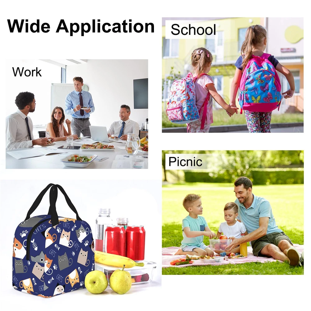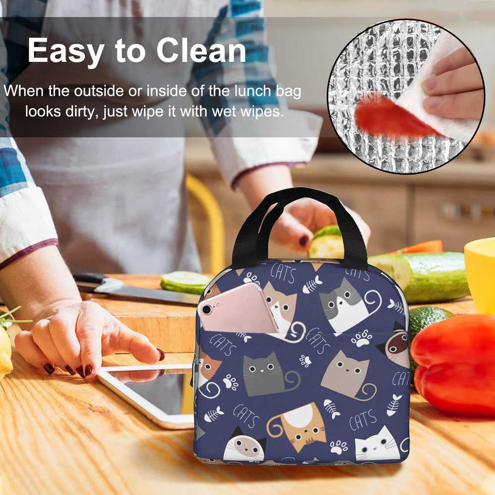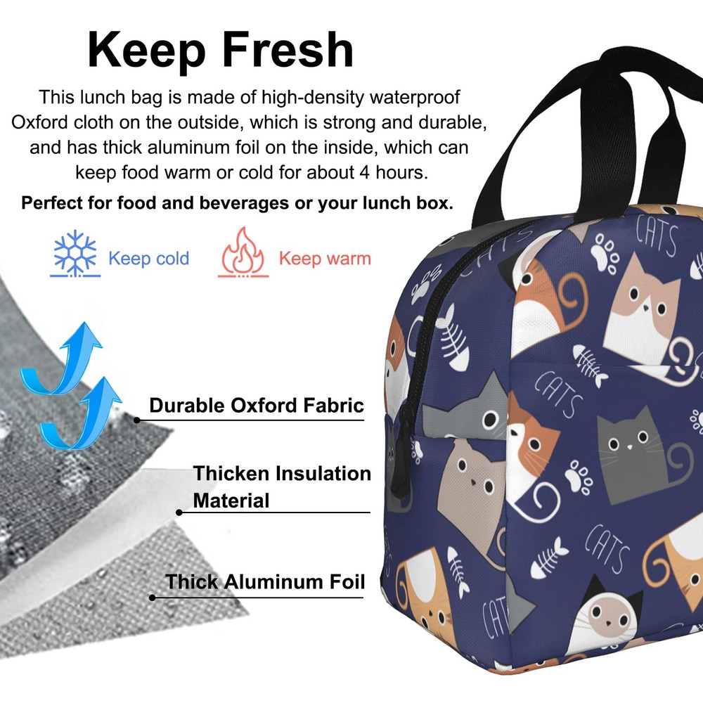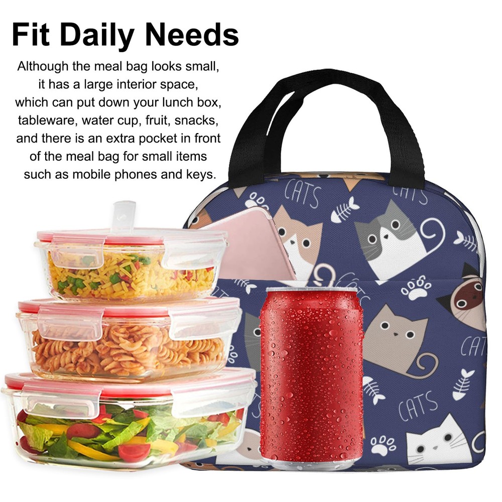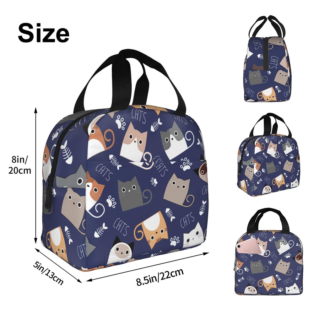 Our Lunch Bag is made of high-quality 300D polyester, with a zipper closure, mesh side pockets. It's a small yet spacious insulated tote that can hold your lunch and snacks while keeping them fresh and cool. With a fashionable design that features a trendy pattern and a simple style, our lunch bag is perfect for anyone who wants to add some style to their daily routine. It's also splash-resistant, easy to clean, and insulated to keep your food and drinks at the right temperature. Good Durability and Reusable: Our lunch bag is crafted from high-quality oxford cloth and aluminum foil material, ensuring durability and reusability. It effectively preserves the temperature of your food, keeping it cold or warm for extended periods. Say goodbye to disposable options and embrace an eco-friendly lunch solution. Optimal Size: With dimensions of 8 x 8.5 x 5 inches, our lunch bag provides ample space to your meals and lunch containers. It outperforms plastic lunch boxes and paper bags by maintaining the freshness and safety of your food. Whether it's lunch, sandwiches, salads, fruits, snacks, or drinks, there's plenty of room for person's meal and more. Practical Design: Designed for convenience, our lunch bag features a comfortable carry handle and a handy front pouch. The pouch offers storage for , utensils, napkins, keys, cards, and other small items. The easy-open zipper ensures smooth and hassle-free access, while the neat stitching enhances the bag's sturdiness and longevity. Versatile and Functional: This lunch bag serves multiple purposes, making it a versatile companion. Use it as a tote bag, picnic bag, snack bag, or shopping bag. It's suitable for various settings, including work, office, hiking, picnics, travel, and even the gym. Embrace its versatility and enjoy hassle-free meals wherever you go. Thoughtful Gift: Our cute lunch bag is not only practical but also makes a delightful gift for friends, family members, loved ones, or colleagues. Its lightweight design and universal appeal make it suitable for everyone. Whether it's a birthday, New Year, Christmas, or Thanksgiving, this lunch bag is a thoughtful and practical present.