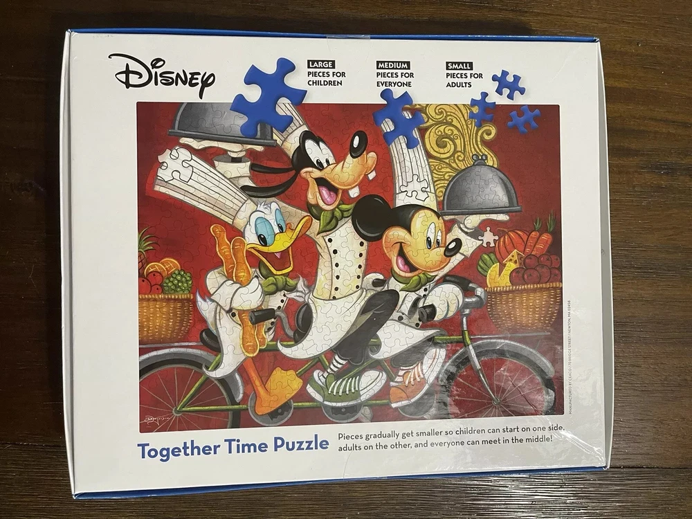 Mickey, Goofy & Donald wearing chef hats riding a bike PLEASE refer to photos for more detailed description. There is a torn piece of paper, from the box on the back side, covered with clear tape. I put a yellow line on the area in the 2nd photo. Box dimensions: 12" x 10" x 2" COMBINED shipping rate discount for same buyer