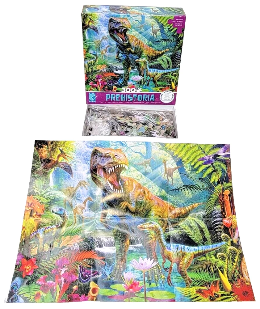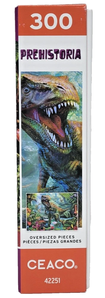 Get ready to travel back in time with this amazing Ceaco Prehistoria jigsaw puzzle. With 300 large pieces (Great for little hands), this super-cool-tougho-neato puzzle features a vibrant and colorful scene of fearsome dinosaurs, including the mighty T-Rex and speedy Velociraptor. The pieces are a very good size to help those younger puzzle maestros with smaller hands who are into that dinosaur phase we've all seemed to have gone through (And some of us never left). The interlocking pieces make for a seamless puzzle experience, and the puzzle is complete with a reference poster for convenience's sake. In addition to being a fun and challenging puzzle, this Ceaco Prehistoria puzzle is perfect for dinosaur enthusiasts of all ages. The puzzle is recommended for ages 10 and up, but younger minds will have a blast with this puzzle. Made of sturdy cardboard material, this puzzle comes from a smoke-free household and is sure to provide hours of entertainment. We did not work the puzzle or count the pieces, but we verify the number count at your request . Each item is carefully packaged to prevent any damage and is shipped immediately with tracking.