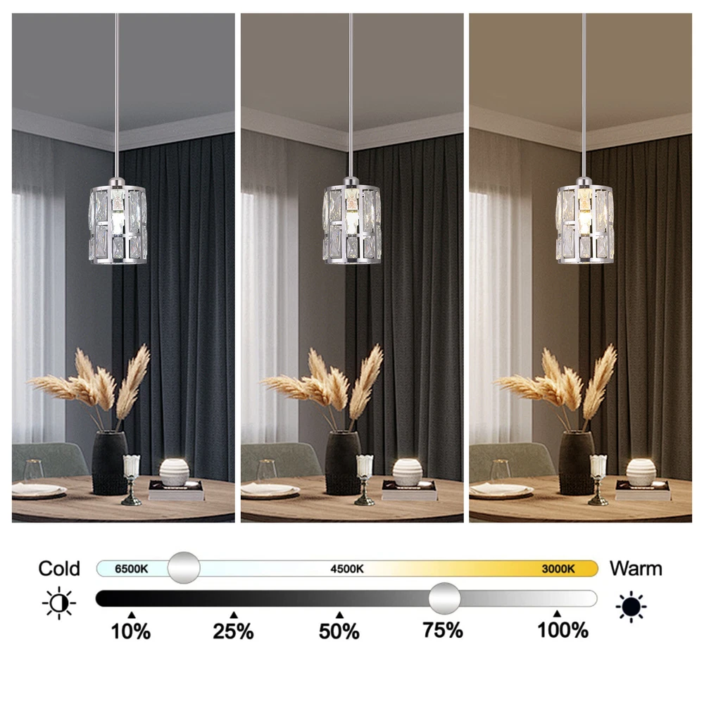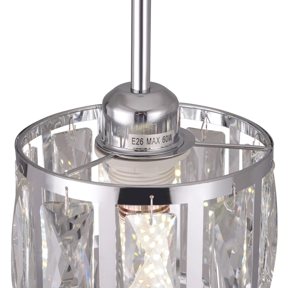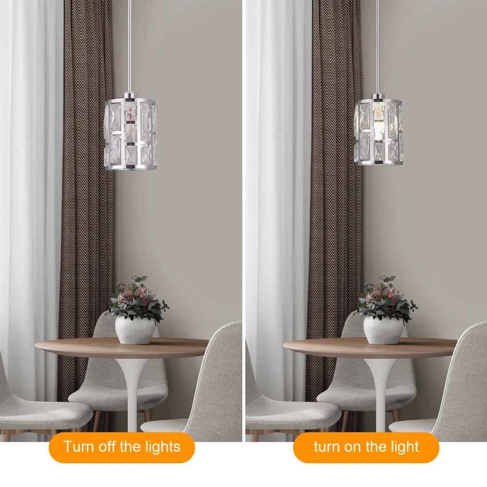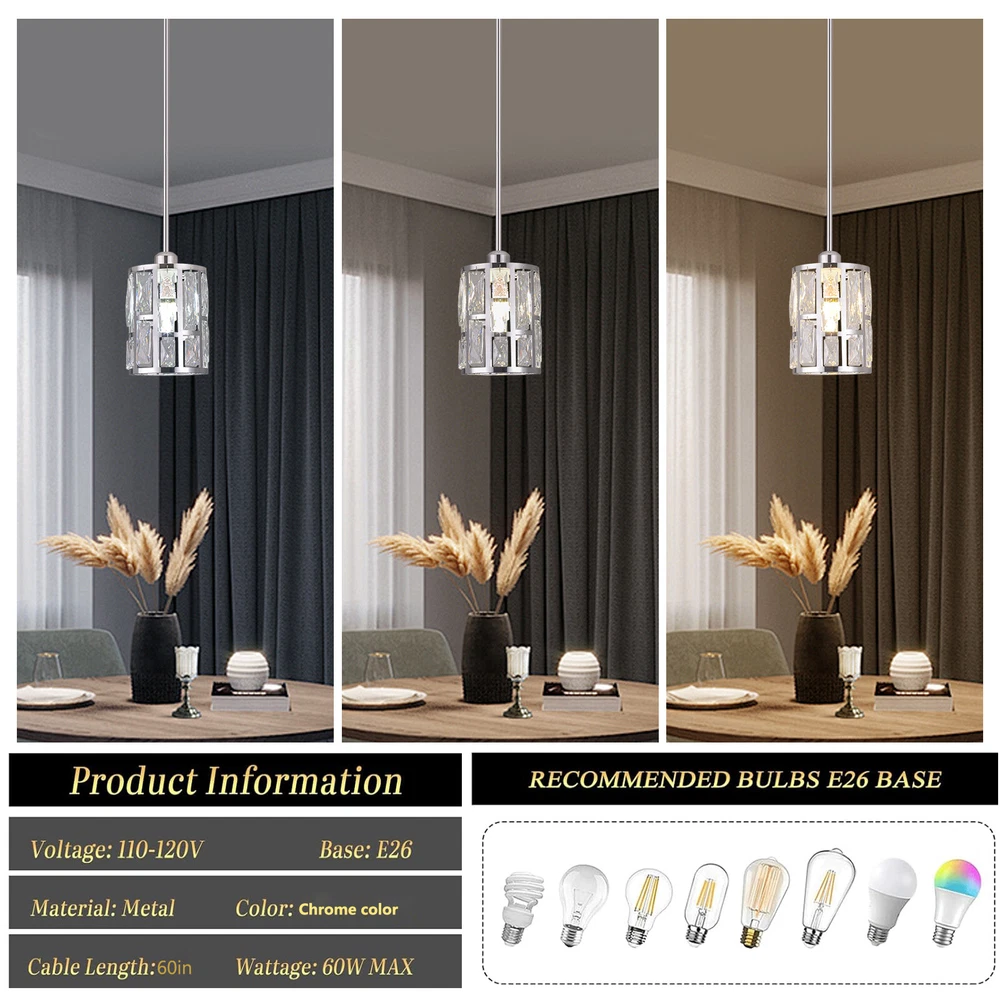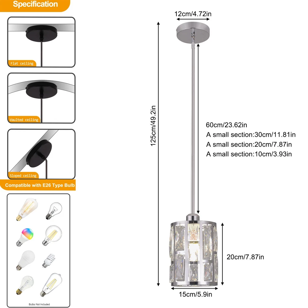 Description This ceiling light is both fashionable and practical. The combination of metal frame and crystals gives it a luxurious and exquisite look, adding a cozy and exquisite visual effect to the room. The standard E26 lamp holder makes it compatible with a variety of bulbs, and you can also adjust the height of the light according to your needs. This product is not only a lamp, but also a beautiful decoration. Come and buy it. Key Features Eye-catching Appearance: The noble and elegant silver frame is combined with highly clear crystals, adding a touch of sophistication to the fixture. When the light is on, the light reflected from the exquisite crystal casts a fascinating glow, bringing you an extremely beautiful visual enjoyment and romantic atmosphere. Sturdy and Durable: This pr Ceiling-mounted Light, Adjustable Height, Modern Crystal Pendant Light Fixture? Description This ceiling light is both fashionable and practical. The combination of metal frame and crystals gives it a luxurious and exquisite look, adding a cozy and exquisite visual effect to the room. The standard E26 lamp holder makes it compatible with a variety of bulbs, and you can also adjust the height of the light according to your needs. This product is not only a lamp, but also a beautiful decoration. Come and buy it. Key Features Eye-catching Appearance: The noble and elegant silver frame is combined with highly clear crystals, adding a touch of sophistication to the fixture. When the light is on, the light reflected from the exquisite crystal casts a fascinating glow, bringing you an extremely beautiful visual enjoyment and romantic atmosphere. Sturdy and Durable: This product is made of premium iron and crystal and adopts an electroplating process, which is rust-proof, and corrosion-resistant, and can be used for a longer time. Convenient to Use: The standard E26 lamp holder can support the use of LEDs, Halogens, etc., making it very convenient for you to buy and replace bulbs. Wide Adaptability: You can adjust the height of the lamp to suit rooms of different heights by changing the number of suspension rods. In addition, this product can be mounted on sloped ceilings, making it highly adaptable. Dimmable Design: By purchasing dimmers and dimming bulbs (both not included), you can also adjust the light to create different lighting effects. Simple Installation: The simple structure, complete accessories, and English manual allow you to quickly and easily complete the installation and start to use it. Easy to Clean: Thanks to the simple construction, the light is easy to clean, and you just need to gently wipe it to remove the dust on the surface. Protective Package: Foam can effectively reduce the normal impact and ensure that it is fully delivered to you to the greatest extent. Ideal Gift: With its elegant appearance and practical function, it is a good gift for friends, loved ones, coworkers, and other people on holidays, birthdays, or housewarming days. Good Service: We aim to provide quality products and services. If you have any problems, please feel free to contact us. We will reply and solve the problem for you as soon as possible. Details Smooth Edges: They not only ensure safer use but also improve the beauty of the product. Stable Base: The thickened base of 4.72" in diameter increases stress area and can make the item fixed firmly without falling easily. Application It can be used in living rooms, bedrooms, kitchens, dining rooms, reading rooms, apartments, villas, malls, hotels, restaurants, coffee shops, dessert stores, and other places. Specification ‎Material: Iron, Crystal Process: Electroplating Color: Silver Shape: Cylinder Style: Modern Indoor/Outdoor Usage: ‎Indoor Assembly Required: Yes Control Method: Wall Switch (Not Included) Mount Type: Ceiling Mount Voltage: 110V Light Source: 1* E26 Bulb (Not Included) Efficiency: E Max. Bulb Power: 60W Adjustable Height: Total 60cm/23.62in (30cm/11.81in, 20cm/7.87in, 10cm/3.93in) Suitable for Room Height: 2.6-3m/8.53-9.84ft Overall Height: 125cm/49.2in Base Diameter: 12cm/4.72in Lampshade Size(D*H): 15*20cm/5.9*7.87in Package Size: 25*15*15cm/9.84*5.91*5.91in Gross Weight: 1.5kg/3.31 lbs Net Weight: 1.2kg/2.64 lbs Package Included 1* Ceiling Light 1* Base 1* English Manual All Accessories for Installation Notes Please check the dimensions of the product before ordering to ensure it fits your home. Please note that the bulb is not included and you will need to purchase an E26 bulb yourself. Please disconnect the power supply before installation, and wear insulated gloves (not included), or you can seek professional installation. Please use the lamp within the applicable voltage range and clean it regularly. Please cut off the power supply when you clean the light or replace the light bulb. Please wipe with a soft cotton cloth and do not use household cleaning agents. Please read the instructions carefully before installation and use. Please note that this product is not waterproof, so please do not use it outdoors. Please note that the brightness depends on the power of the bulb. Please allow the slight color difference caused by the shooting light and 1-3cm error due to manual measurement, and make sure you do not mind before ordering. Payment Delivery details Terms of sales About us Contact us Payment We accept ebay payment 。 Fees such as import duties, taxes are not included in the item price or shipping costs. These charges are the buyer's responsibility. Delivery details Shipping: 2-9 working days to: USA Terms of sales We maintain high standards of excellence and strive for hundred percent customer satisfaction. Feedback is very important to us. We hope that you contact us immediately before you give neutral or negative feedback, so that we can address your concerns. It is impossible to address issues if we do not know about them! About us Your satis faction is our ultimate goal. We work hard to earn your trust and future business. Our c