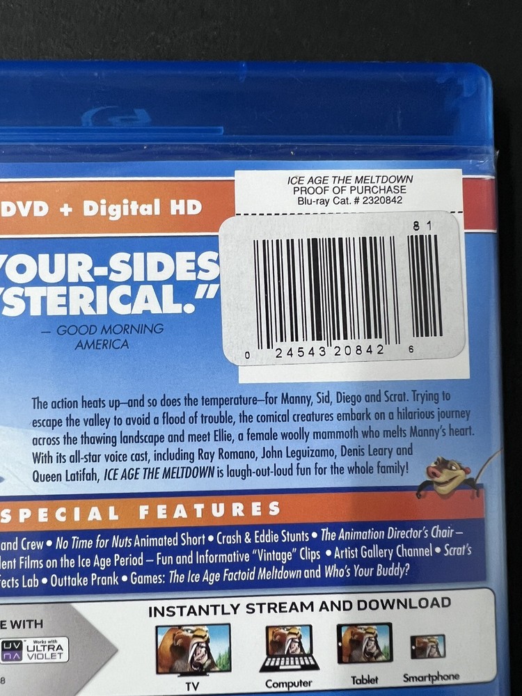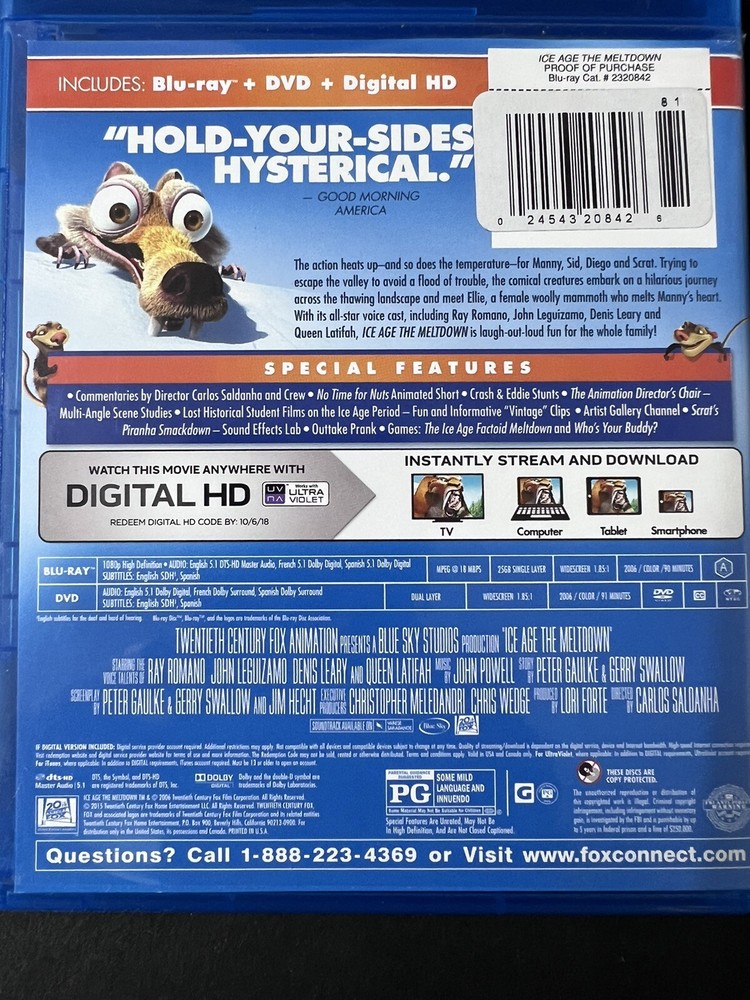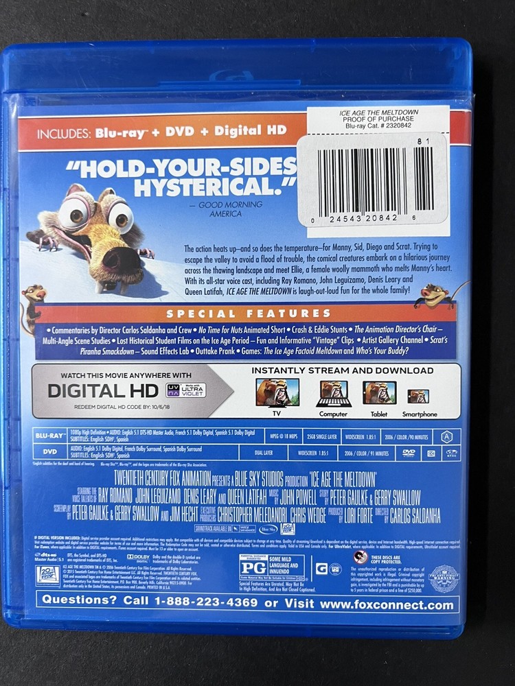 This is a special edition Blu-ray and DVD combo of the movie "Ice Age: The Meltdown". The movie is directed by Guillermo del Toro and features actors like Al Pacino and Bill Murray. It is a family-animated movie with a rating of PG. The package includes both the Blu-ray and DVD formats and comes with additional scenes as a bonus feature. The movie is in English language and produced by 20th Century Studios. It falls under the category of Movies and TV, and DVDs and Blu-ray Discs. This combo pack is a great addition to any family's movie collection.