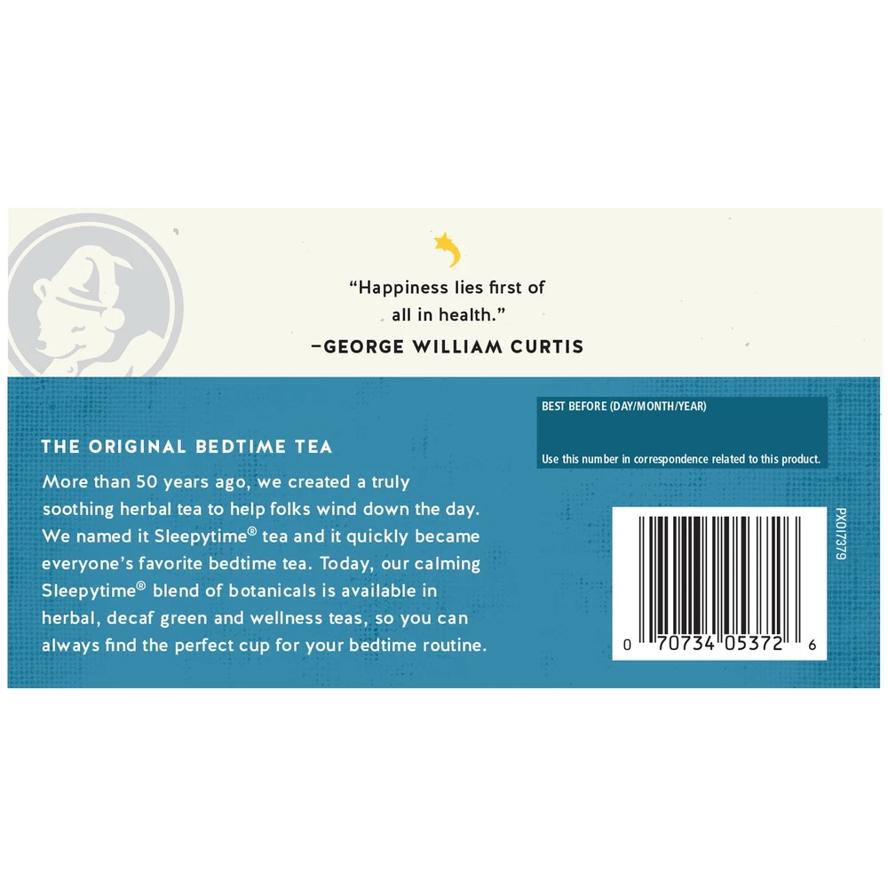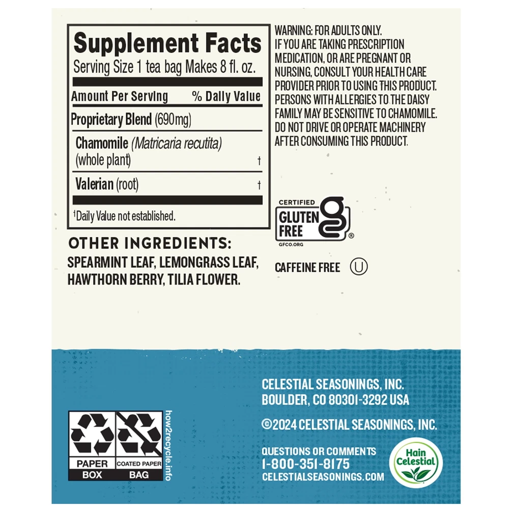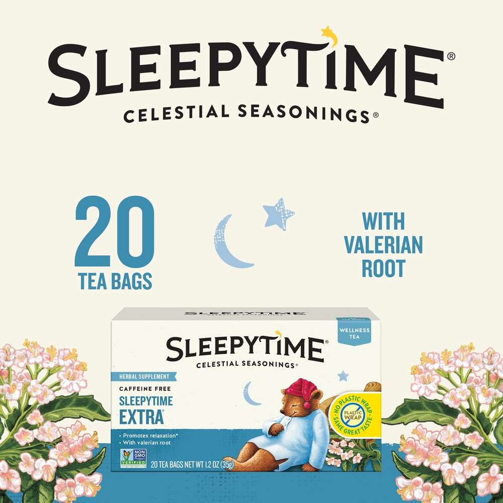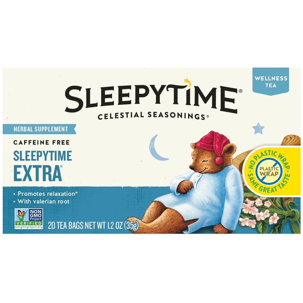 Nothing is more soothing than a cup of your favorite tea. Celestial Seasonings Sleepytime Wellness Extra Tea is the perfect caffeine free addition to your nighttime routine. Plus, we added valerian to promote relaxation and extra calming rest. Put some magic in your mug and enjoy the goodness found in every cup of Celestial Seasonings Teas. Celestial Seasonings teas are an invitation to put some magic in your mug! More than 40 years ago, we created a truly soothing herbal tea to help folks wind down the day. We named it Sleepytime, and it quickly became a favorite bedtime tea. Today, our calming Sleepytime blend of botanicals is available in herbal, decaf, green, and wellness teas, so you can always find a perfect cup for your bedtime routine. Celestial Seasonings Sleepytime Extra, Herbal Wellness Tea Bags, 20 Count: Made with spearmint, chamomile & lemongrass Added valerian root No artificial colors or flavors Kosher and Gluten-Free Steep tea bag in hot water for 4-6 minutes No strings, tags, or staples on tea bags Recycled paperboard (35% post-consumer content)