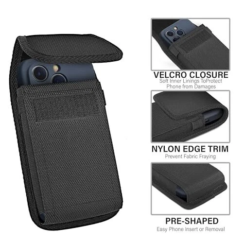Return Policy Fast Delivery Trusted seller Cell Phone Holster for iPhone 15, 15 Pro 14, 14 Pro 13, 13 Pro 12, 12 Pro, 11, XR, XS 10 Case with Belt Clip Phone Belt Holder for Men Carrying Pouch Cover (Fits Phone with Case on) Product Description Heavy duty, rugged black nylon cell phone holsters case with belt clip and belt loop for iPhone 15, 15 Pro, iPhone 14, 14 Pro, iPhone 13,13 Pro, iPhone 12, 12 Pro, iPhone 11, XR, XS, and more (If you have different models check our other variations) This Phone belt holder can be securely attached to your belt with its durable belt clip or belt loop which is suitable for camping, hiking, outdoor living, and trekking. Daily Protection & Easy Use- Velcro closure keeps your phone safe which prevents accidental opening and access to your phone easily and keeps it exactly w you need it (Large size pouch fits phone with case on) You have different ways of wearing a phone holster: Choose the belt loop option or clip it to your belt, (Horizontal or Vertical position!), waistband, or inside your handbag's pocket. Never lose it again! Belt Phone Holder for men and women have Built-In Pen Holders, one on each side of the pouch that can accommodate any standard-size pen. Shipping Returns Payment Shipping Shipping is FREE to all addresses other than APO/PO boxes in the lower 48 states. All our stock ships from US-based warehouses. Shipped via USPS or UPS (depending on location and package weight) Unless stated otherwise, all orders will ship within 24-72 hours of your payment being processed. Check our feedback to see the great reviews of FAST shipping we offer. Returns Seller does not accept returns Payment We currently accept payment via eBay managed payments only. Once payment is cleared, we will dispatch your shipment within 1-3 business days. Please refer to the "Shipping" tab for more information regarding shipping speed to your destination.