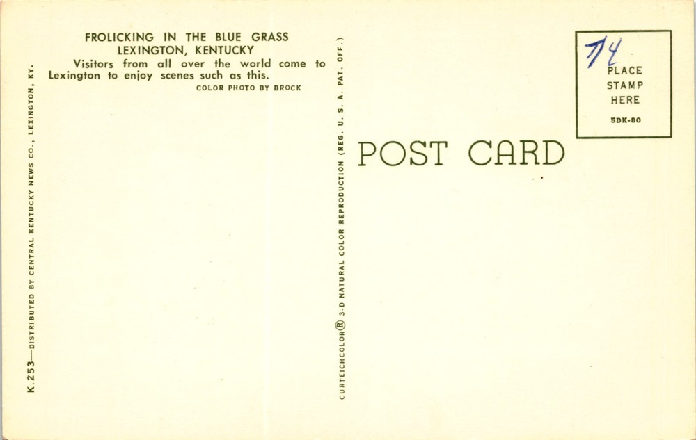 MAKE AN OFFER. THE MORE YOU BUY THE BETTER DEAL I WILL ACCEPT The postcard features a color photo of people Frolicking in the Blue Grass in Lexington, Kentucky. Lexington is a popular destination for visitors from around the world who come to enjoy the picturesque scenes like the one depicted on the postcard. The photo was taken by Brock and distributed by Central Kentucky News Co. in Lexington.