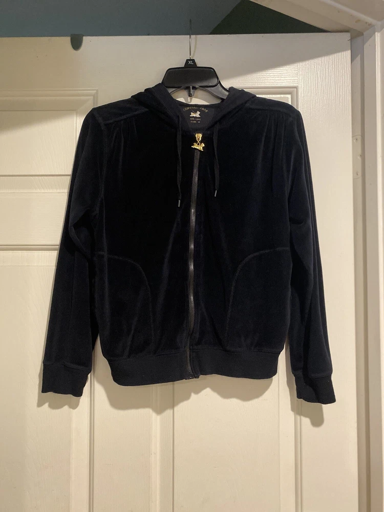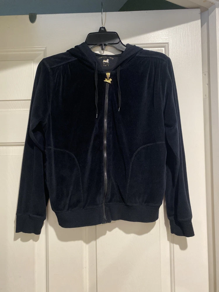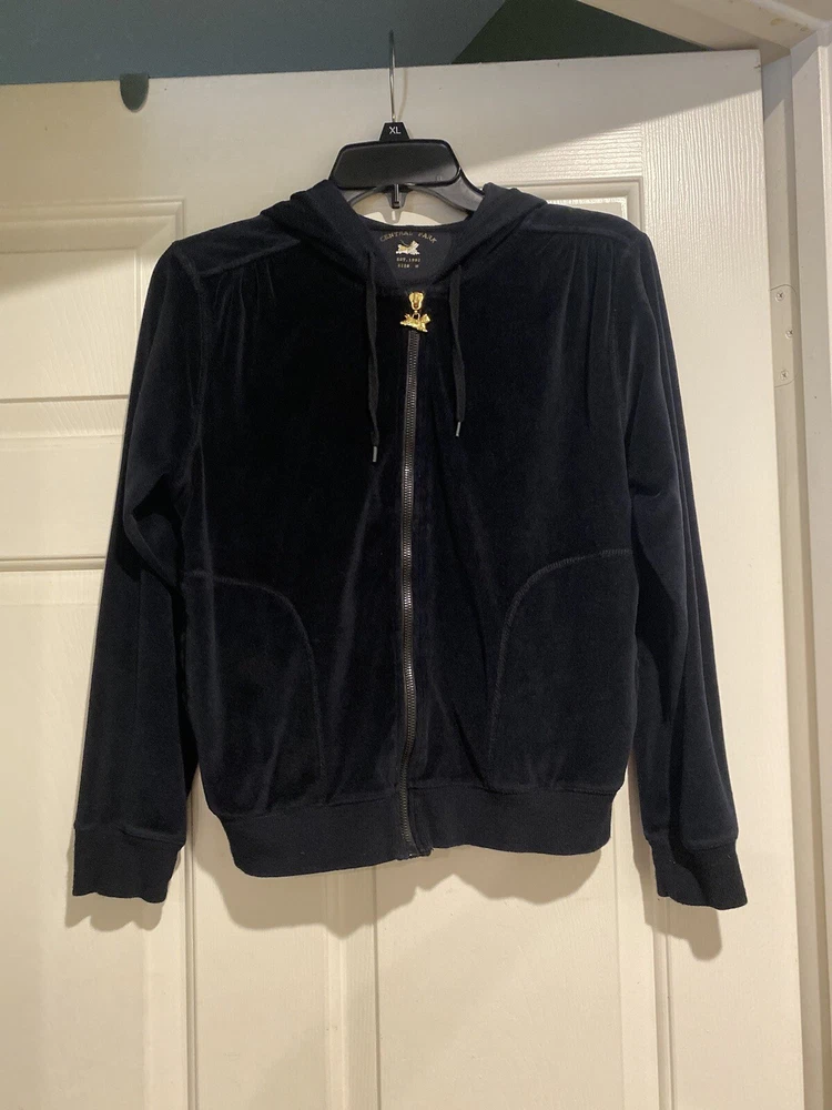 Brand:Central ParkOccasion:ActivewearSize:MAccents:ZipperType:HoodieSize Type:RegularDepartment:WomenMPN:B73Fabric Type:VelourColor:BlackStyle:Full Zip