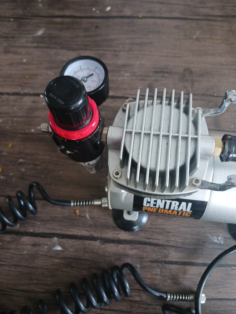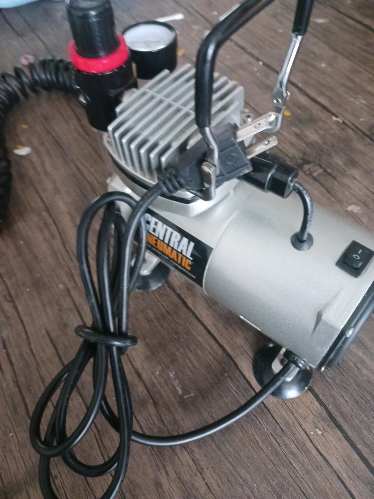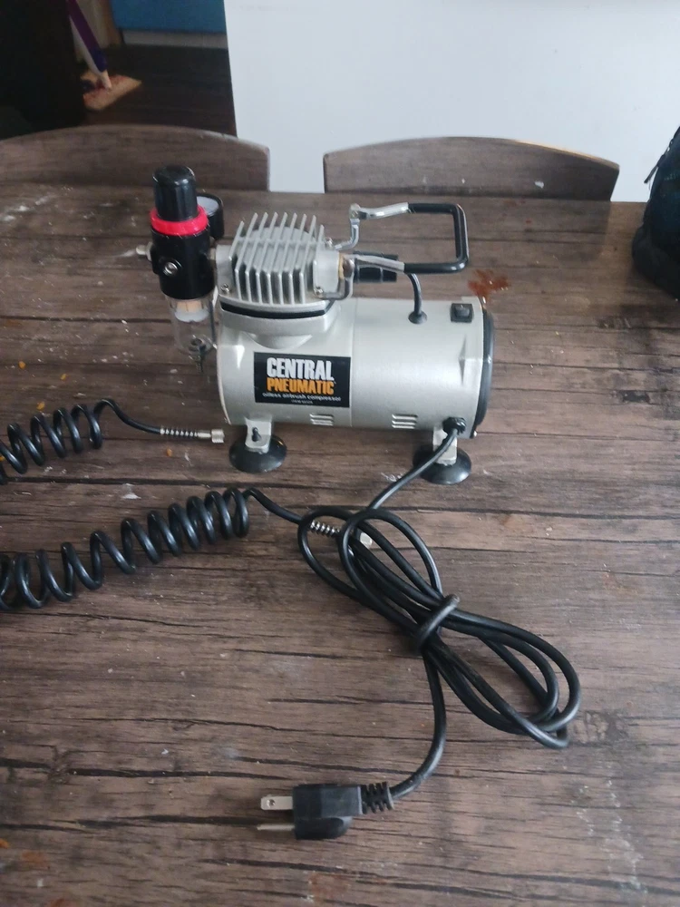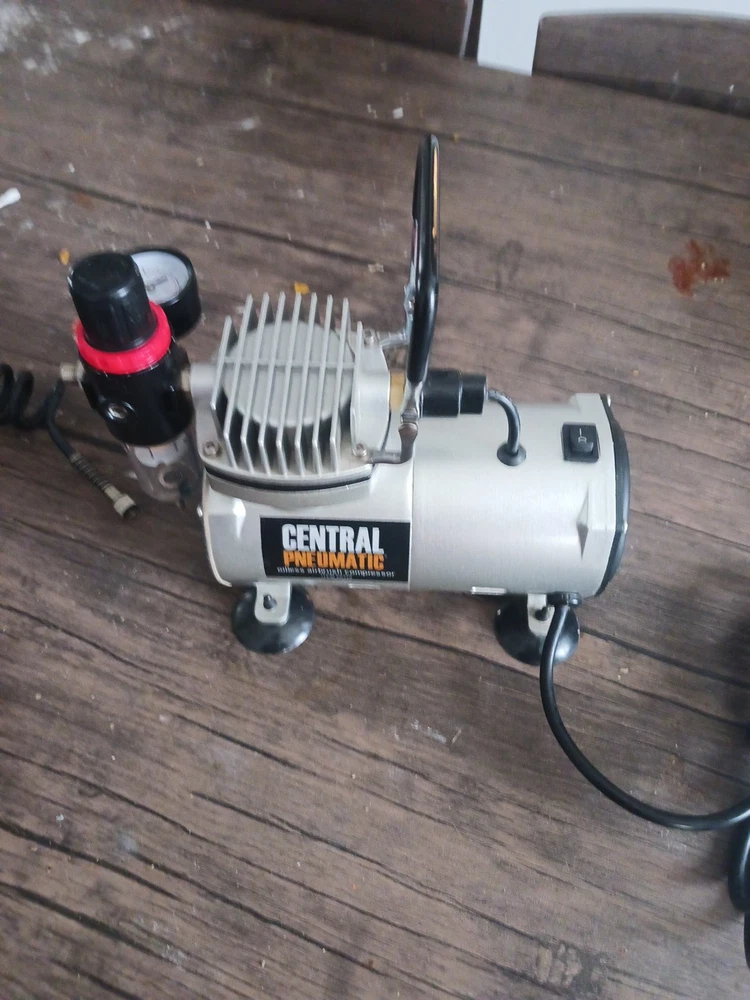 This is a Central Pneumatic 1/6 HP 58 PSI Oilless Airbrush Compressor, model 60329. It is a versatile and reliable tool suitable for various art and crafting projects. The compressor is designed to provide consistent and powerful airflow for airbrushing applications. The product is ideal for artists and crafters who require a reliable and efficient airbrushing system. With its compact design and easy-to-use features, this compressor is perfect for use in the studio or on the go. The brand, Central Pneumatic, is known for producing high-quality and durable tools that cater to the needs of artists and crafters. The airbrush Compressor is a really good machine and I want somebody to have it I love that machine I only used it three times now I want somebody to have it that will take care of it it's in great shape and it works really good I love all my customers
