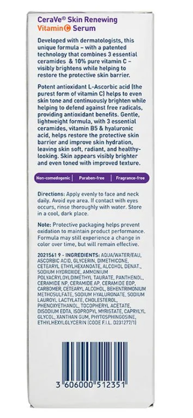 CeraVe Skin Renewing Vitamin C Serum is formulated with 10% pure vitamin C (L-ascorbic acid) to help visibly brighten your complexion and support soft, radiant, and healthy-looking skin. Made For: All Skin Types Helps With: Skin Brightening Product Details Vitamin C is a potent antioxidant that helps defend against free radicals. When used consistently, a face serum with vitamin C can play a powerful role in your anti-aging skincare regimen by delivering skin-brightening benefits and improving the appearance of fine lines, dark spots, and uneven skin tone. CeraVe Skin Renewing Vitamin C Serum is formulated with 10% pure vitamin C (L-ascorbic acid) to help visibly brighten your complexion and support soft, radiant, and healthy-looking skin. Our gentle, yet effective lightweight vitamin C serum with three essential ceramides also helps to restore your protective skin barrier, and includes moisturizing hyaluronic acid , and soothing vitamin B 5 (pantothenic acid) to help improve skin hydration. Plus, MVE technology continually releases moisturizing ingredients for all-day hydration. Suitable for all skin types—including sensitive skin —this antioxidant serum comes in protective packaging to help prevent oxidation and maintain product performance. Allergy-tested