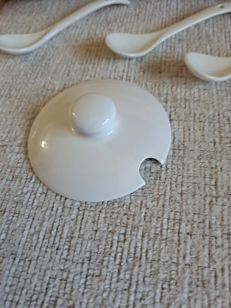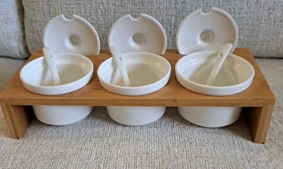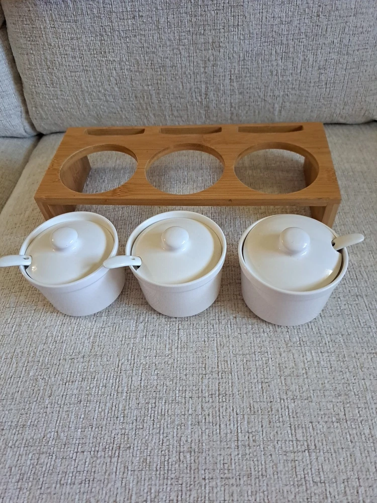 Welcone to my adventure in downsizing. This set has been used once, washed, and stored. A Ceramic Condiment 10 piece Set by Semito , includes three round white ceramic jars with lids and spoons, perfect for organizing your kitchen storage. The set also features a drop-in bamboo display rack, adding a stylish touch to your kitchen decor. Made in China, this set is a practical and elegant addition to any home kitchen.