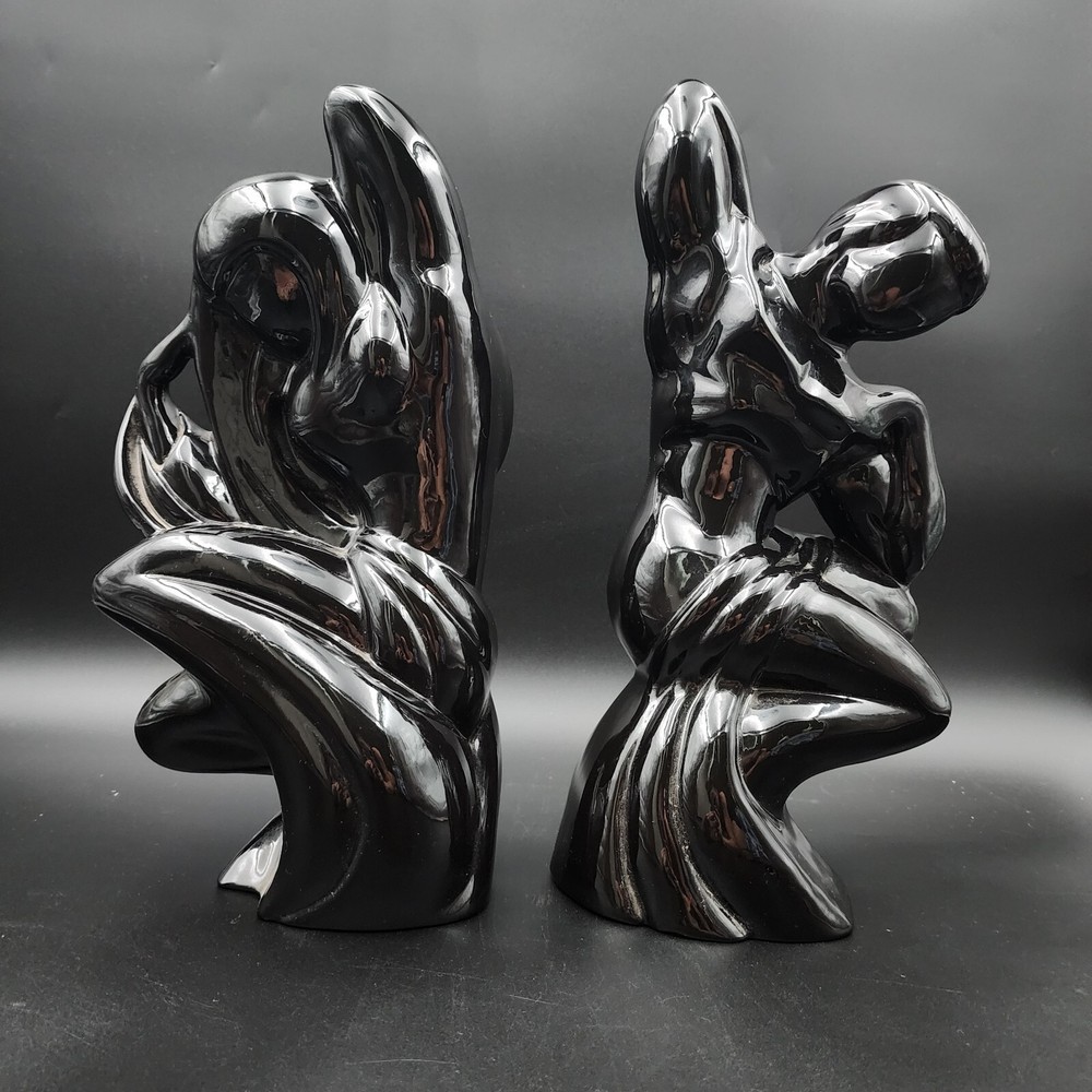 These all black, high-gloss ceramic figural statues are examples of mid-century modern art. They represent a man and a woman, each with their arm raised behind their heads holding a draped cloth. These figures are sculpted in the round so that the draped cloth covers their nudity and can be seen. The use of lines to create ribbon or curtain patterns is indicative of the Art Deco style. These figures are substantial, each measuring 16." in height. The male figure measures 8"Lx5"Wx16.5"H, and the female figure measures 7"Lx6"Wx16"H. This pair would be ideal display pieces in a home or office setting.