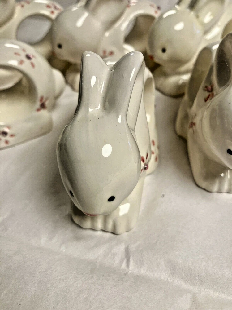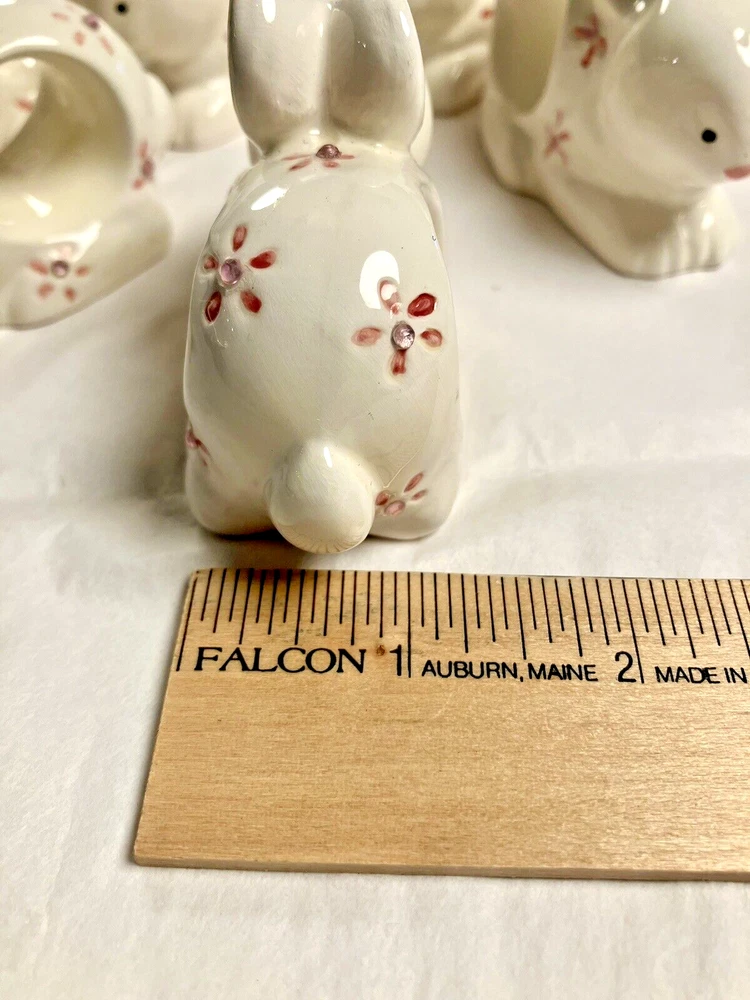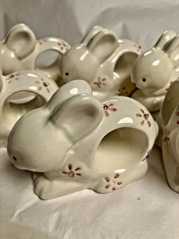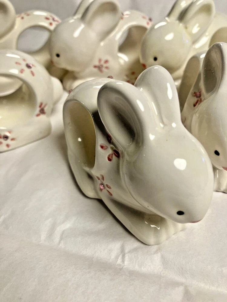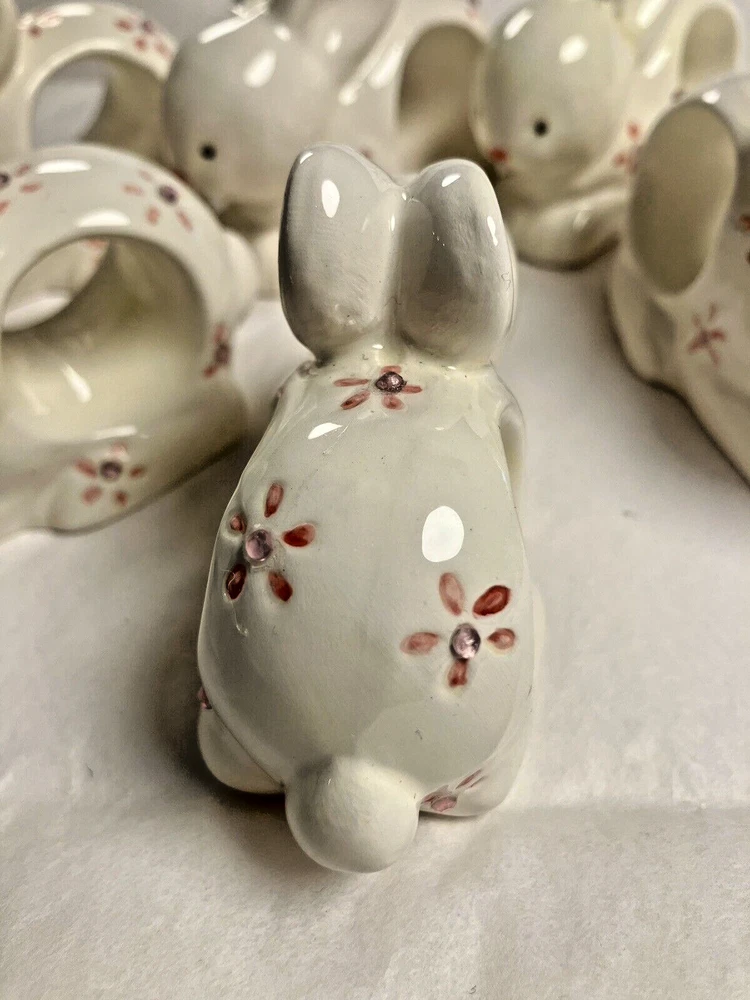 Ceramic Bunny Rabbit Easter Napkin Ring Holders White w/Pink Flowers Set of 6 One has a tiny chip at his foot, Last Pic, hard to see if you are not looking for it. grassfed