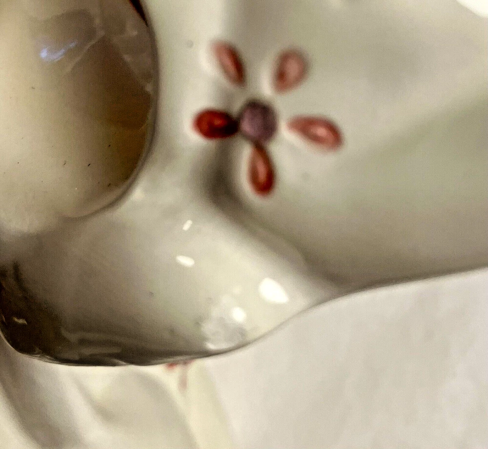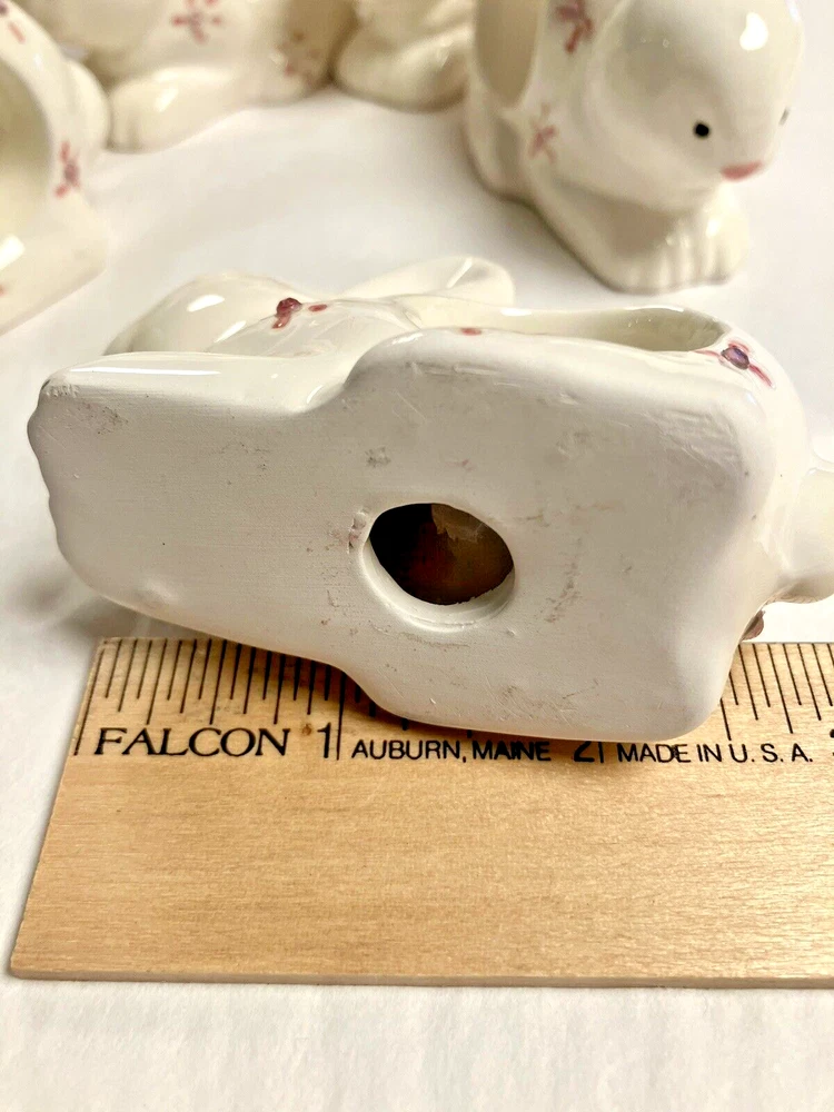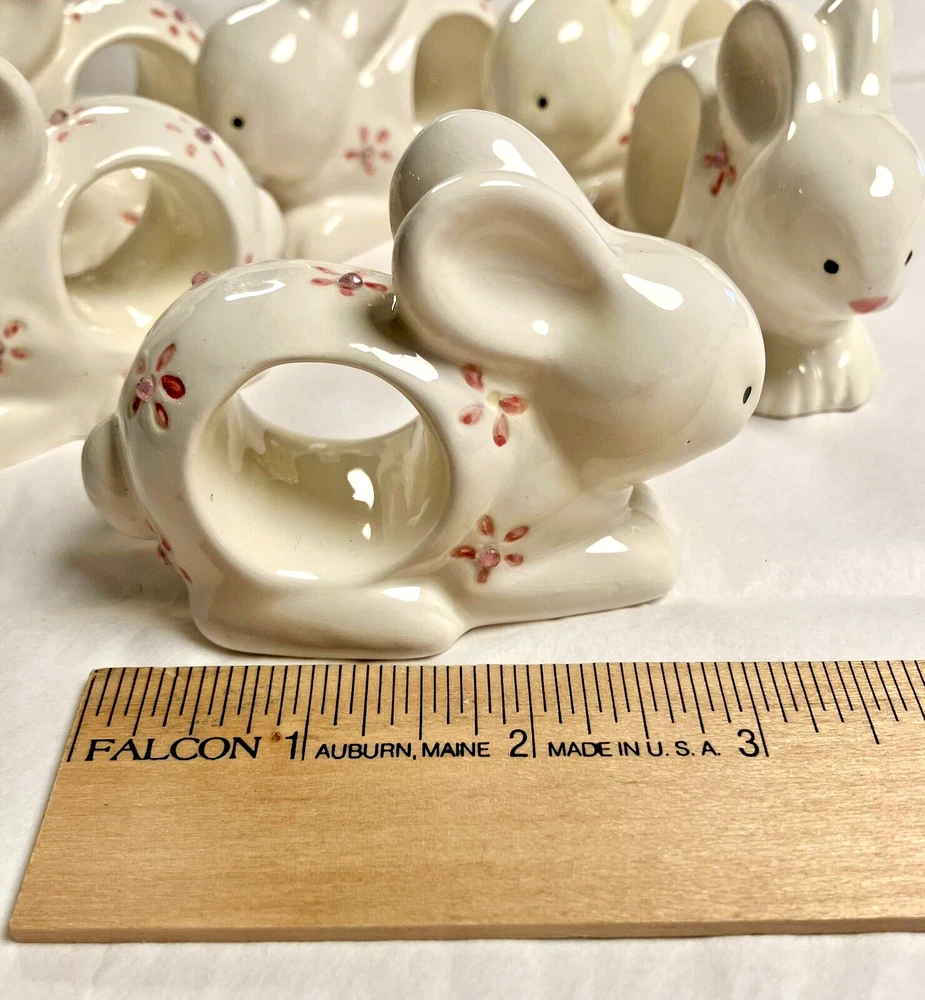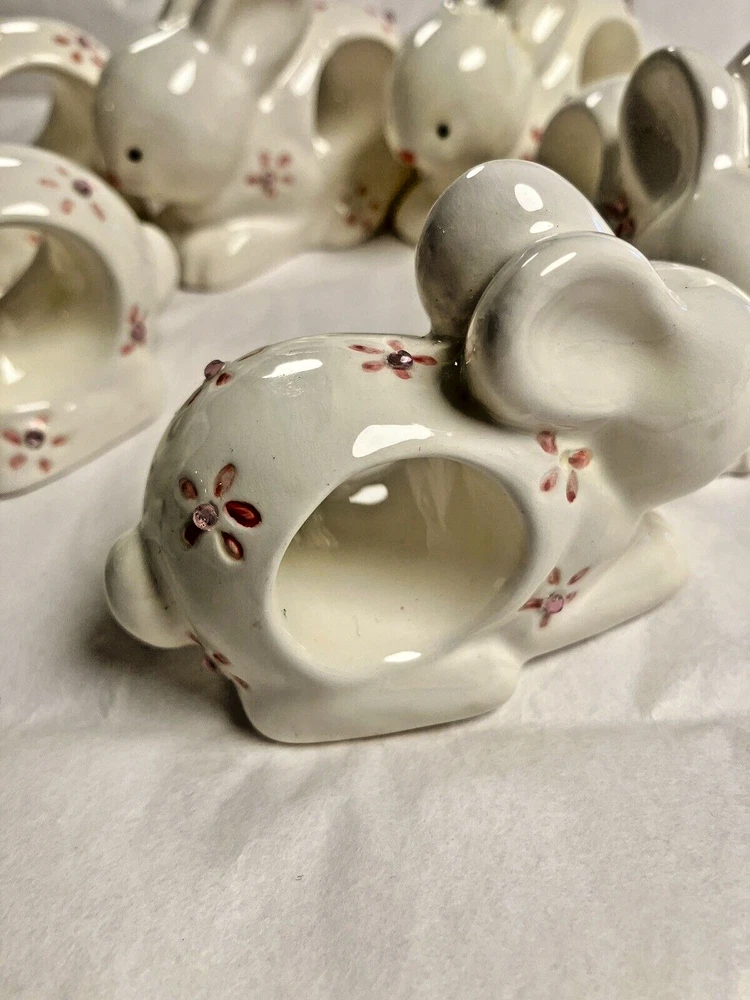 Ceramic Bunny Rabbit Easter Napkin Ring Holders White w/Pink Flowers Set of 6 One has a tiny chip at his foot, Last Pic, hard to see if you are not looking for it. grassfed